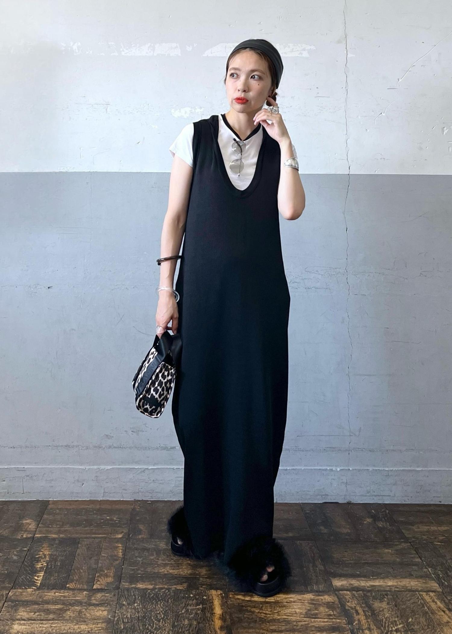 レオパード柄のバッグやファーサンダルの秋小物をプラスして、少し秋を先取ったスタイリングです。