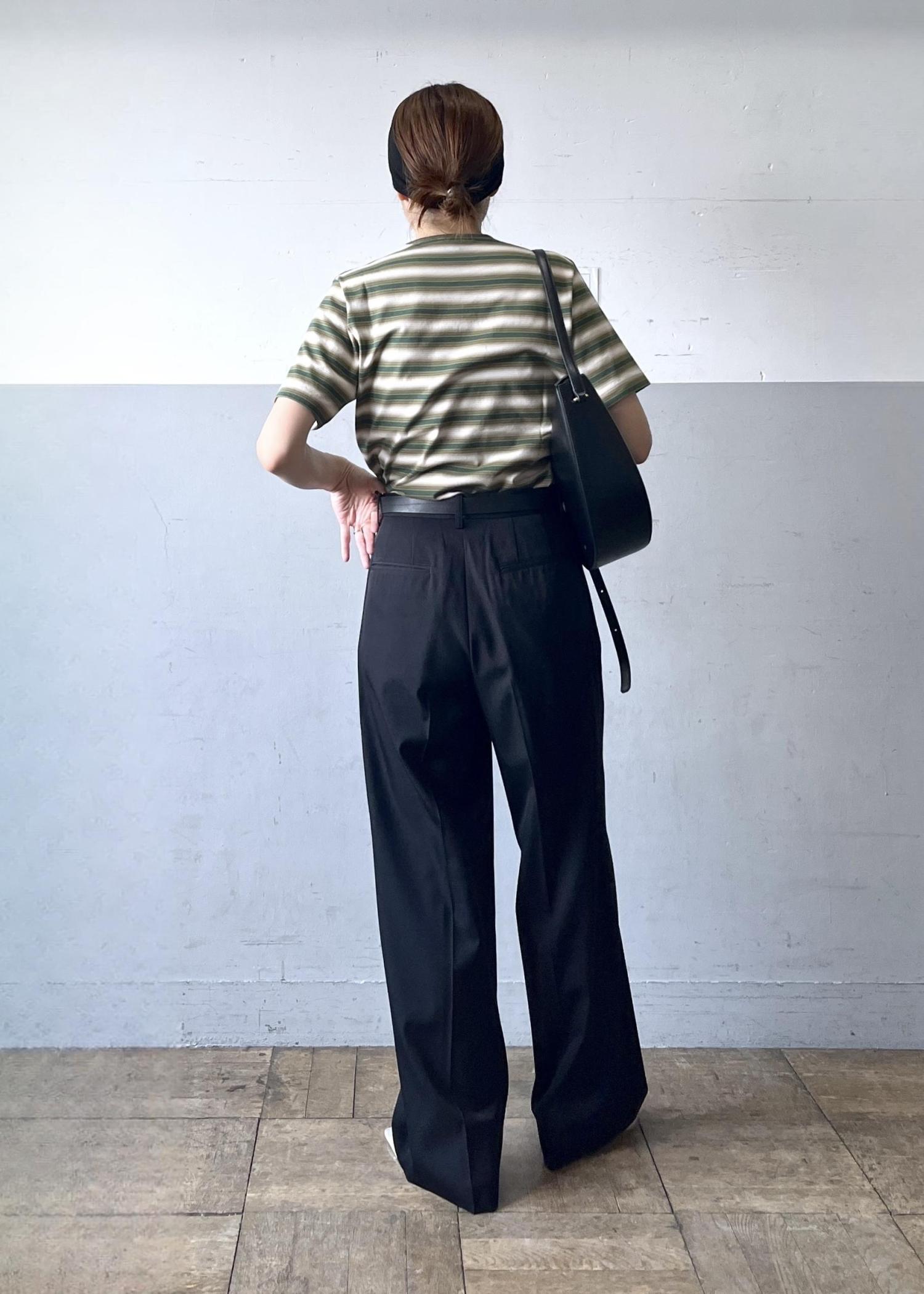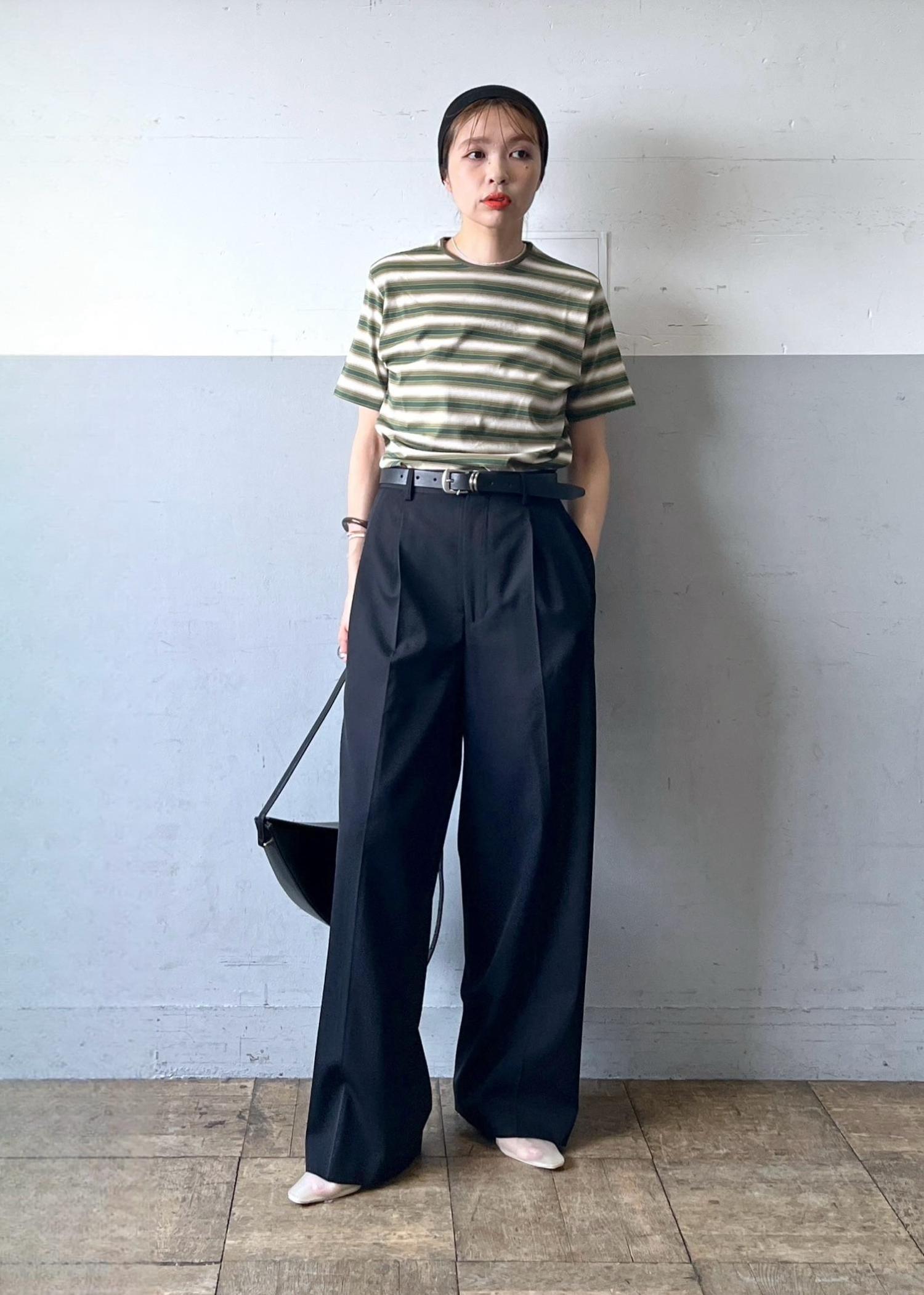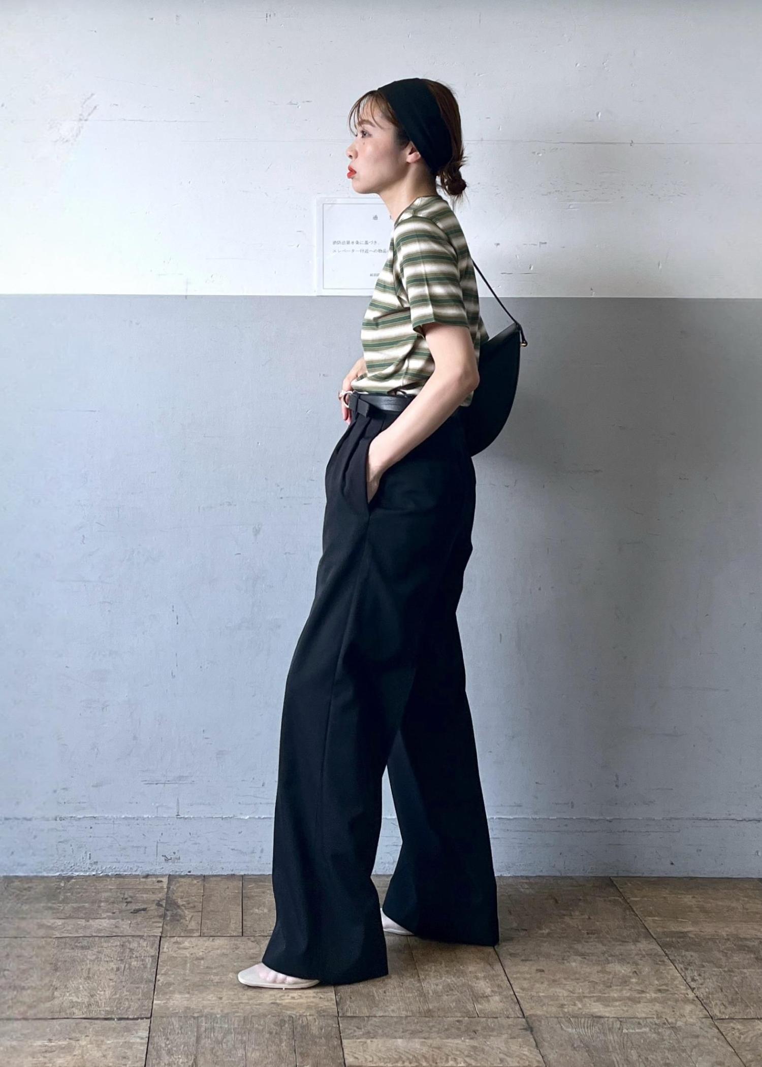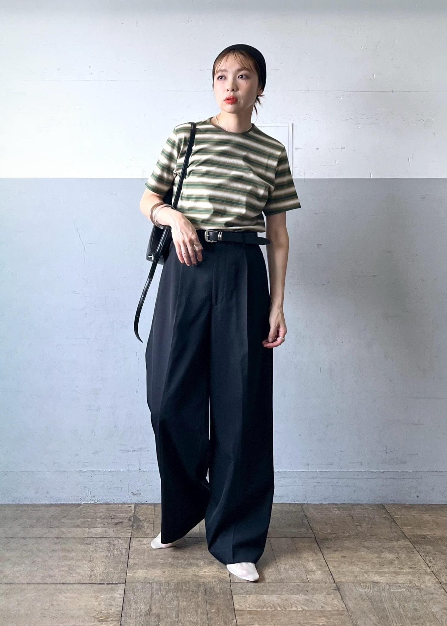 カジュアルなボーダーTEEもスラックス+ベルトのマニッシュなアイテムと合わせると大人な雰囲気に。