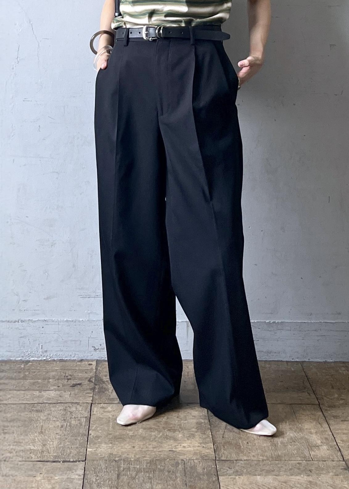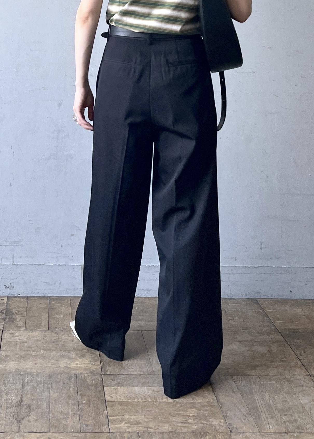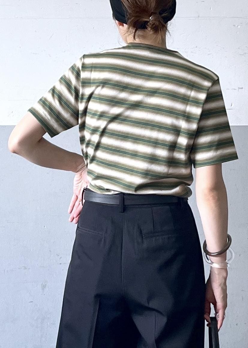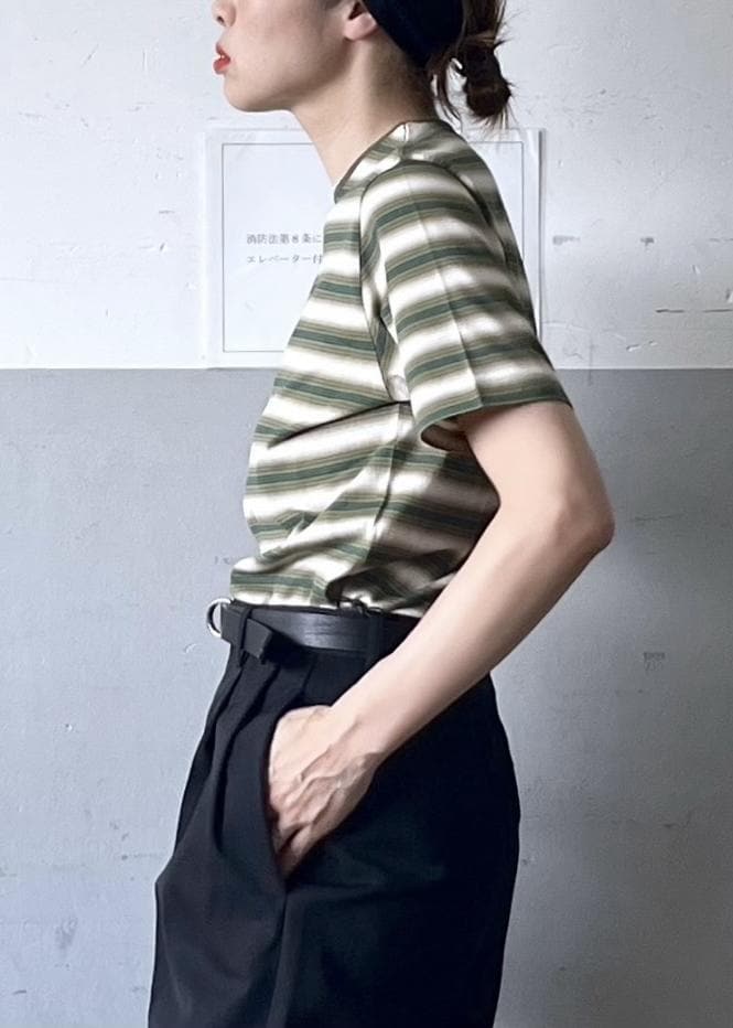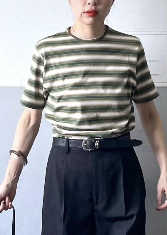 カジュアルなボーダーTEEもスラックス+ベルトのマニッシュなアイテムと合わせると大人な雰囲気に。