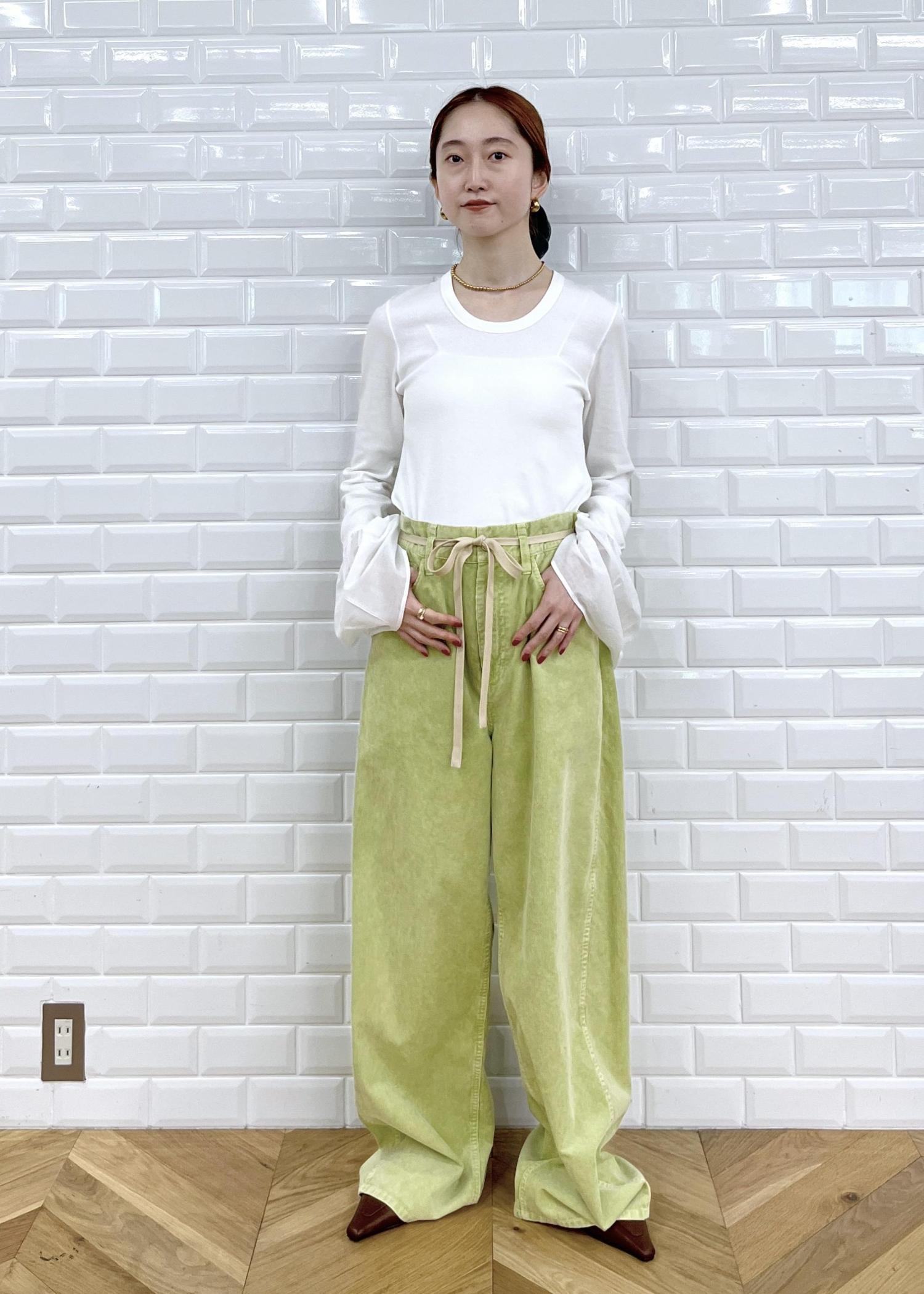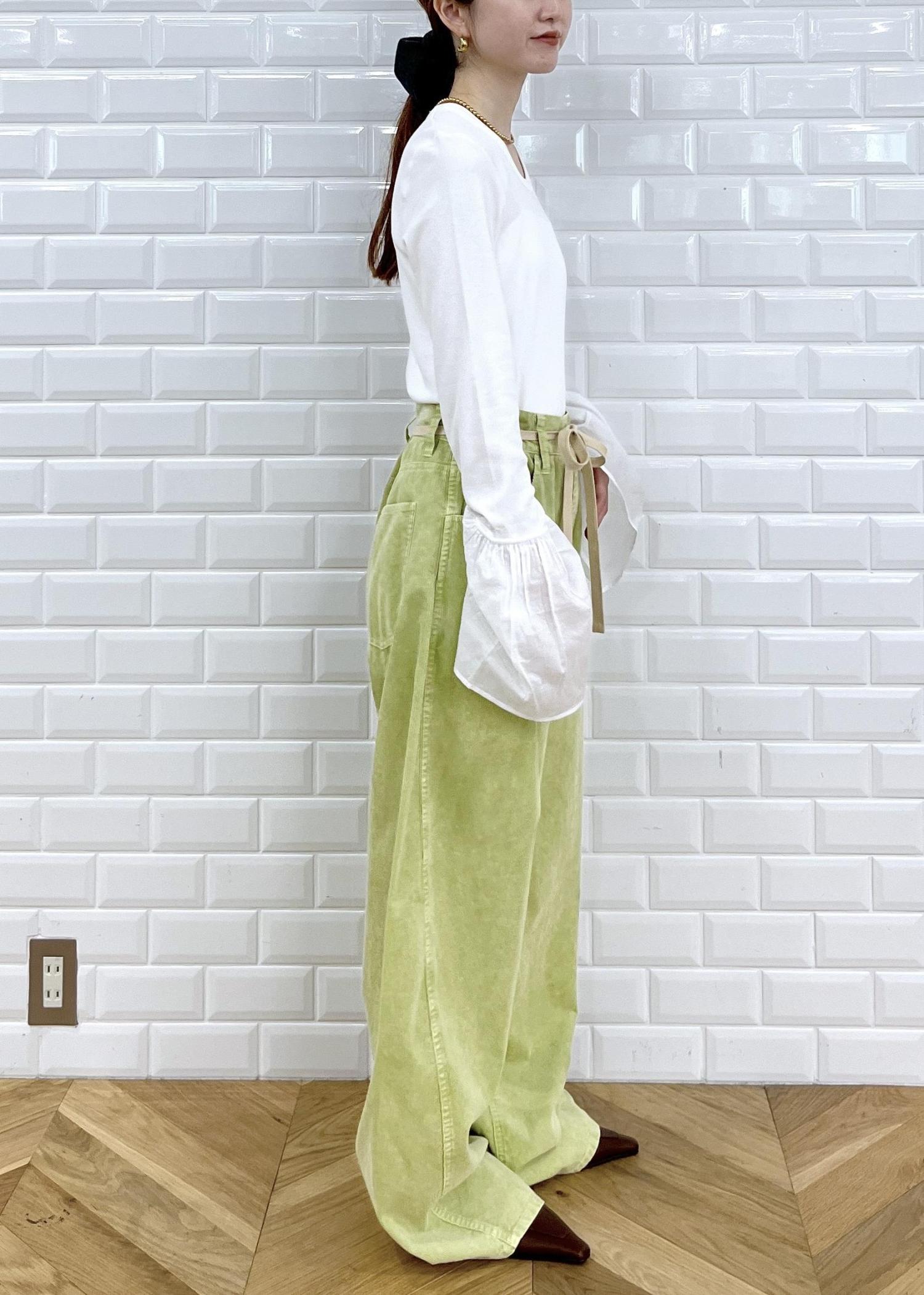ADAM ET ROPÉ FEMME【新色追加】ガーメントダイコーデュロイパンツライトグリーン / 38¥19,800レビュー硬いコーデュロイではなく、とにかく柔らかく肌触り抜群◎厚地ではないので気温の高い時期からご活用いただけます。サンプルの為38サイズを着用しており、全体的にルーズな感じが可愛いです!ウエストのヒモでハイウエストにしたり、腰履きにしたりと変化がつけられます。