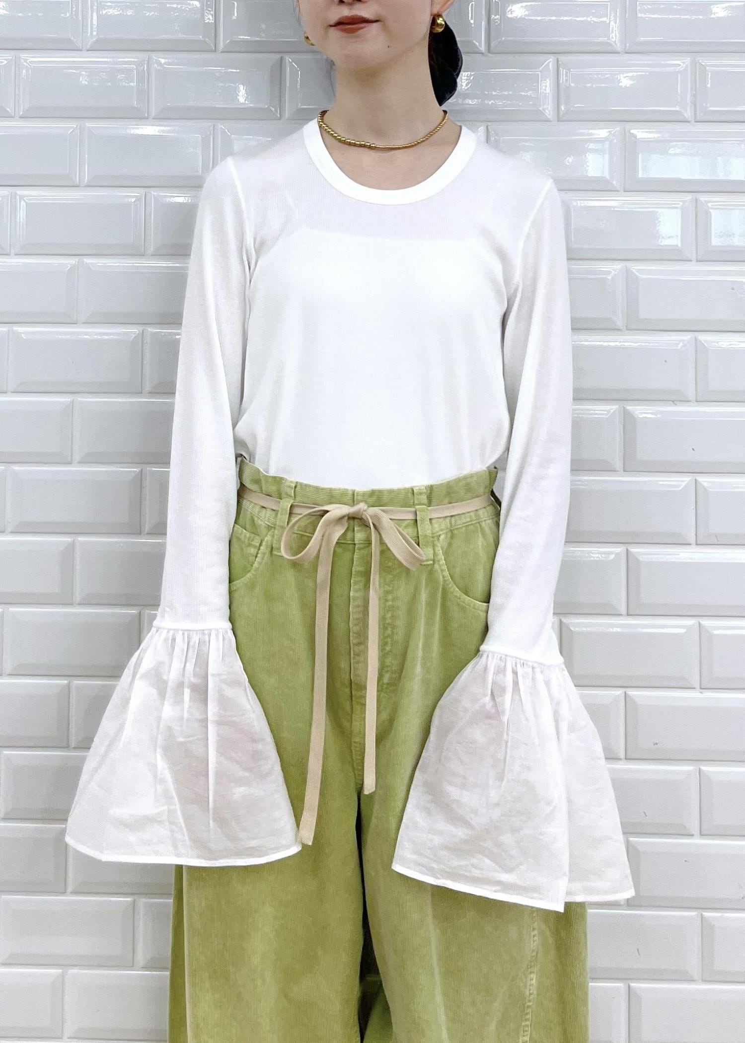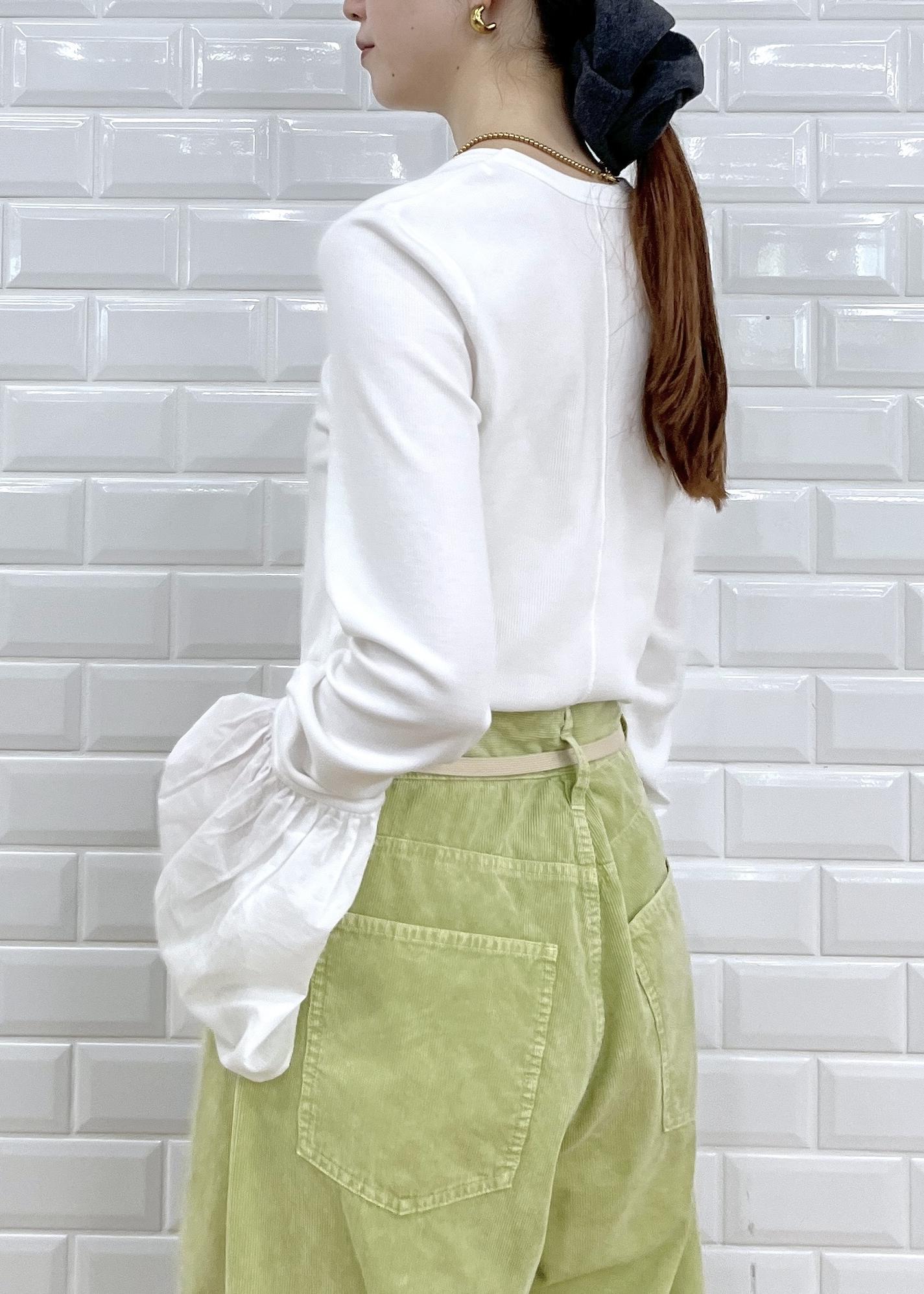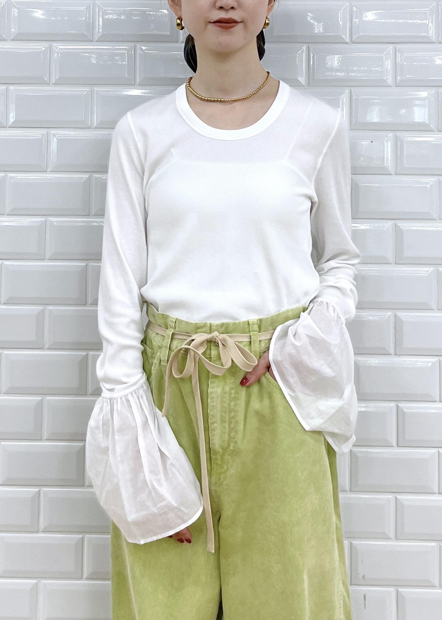ADAM ET ROPÉ FEMMEカフスフレアーリブプルオーバーホワイト / F¥9,350レビューサラッと肌離れの良い素材感です。やや透け感があり、一枚でもインナーとしてもご活用いただけます。手が隠れるくらい思いっきり長めのカフスデザインが可愛いです◎