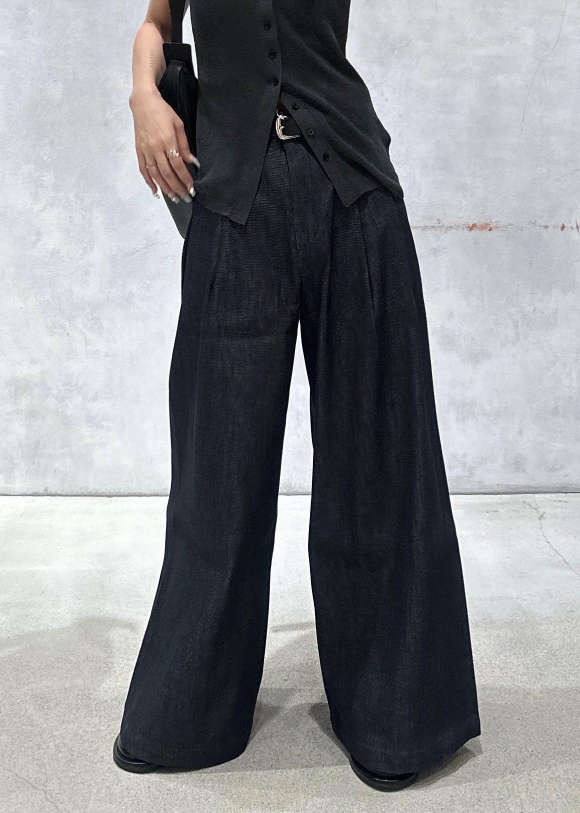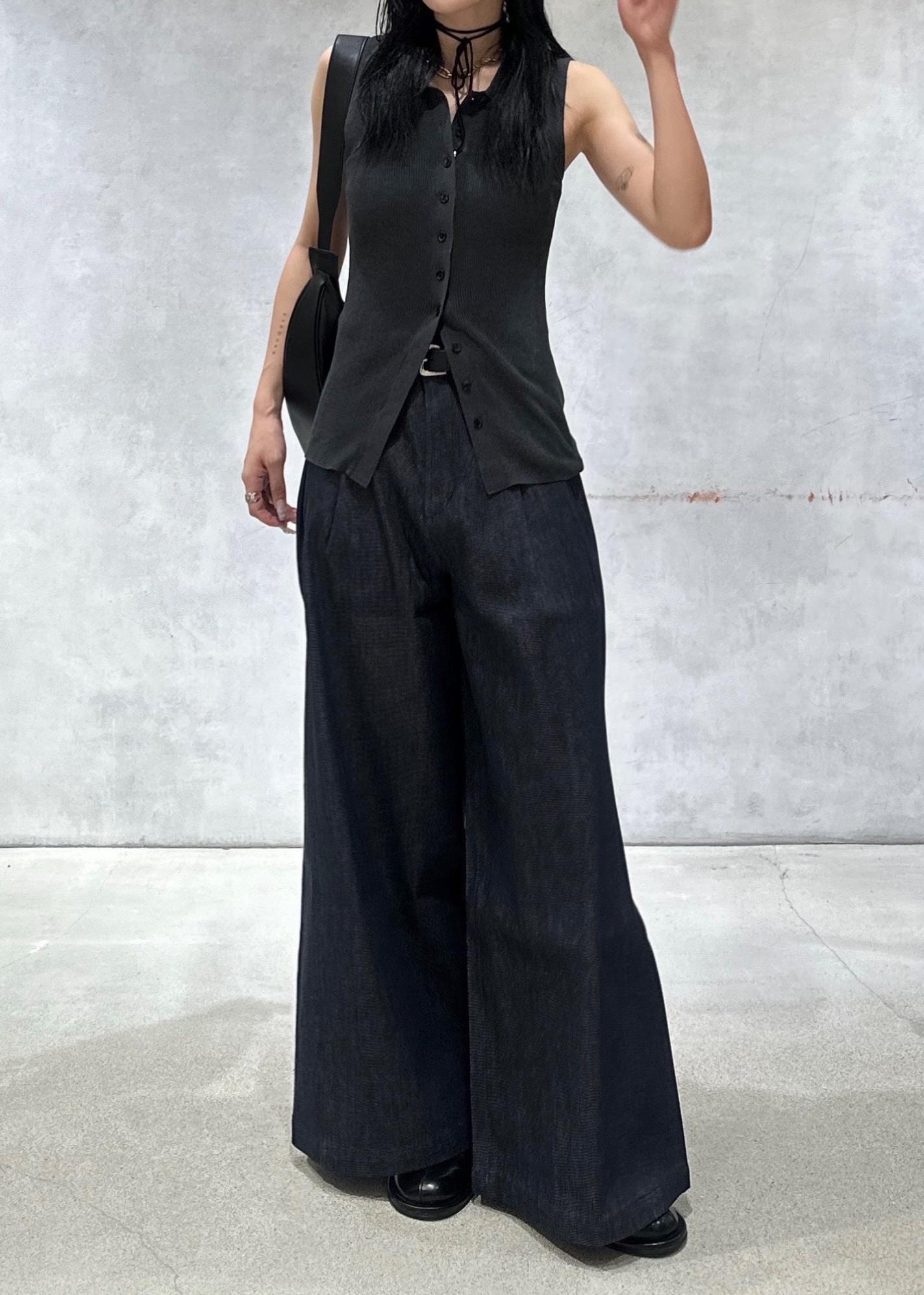 ハリのある素材、かなりワイドなシルエットがラインを拾わず美脚効果抜群のデニムです。