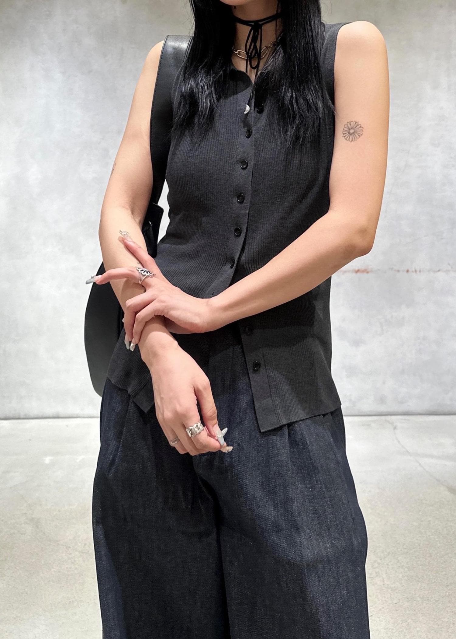 今回はその中から今すぐに着用可能なリブノースリーブニットとツイストシームワイドデニムを使ってスタイリングを組んでみました!