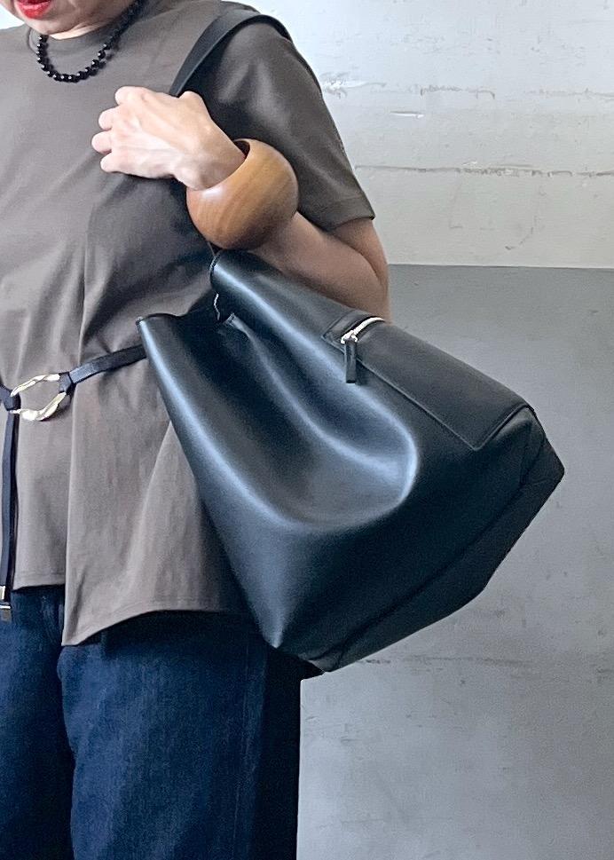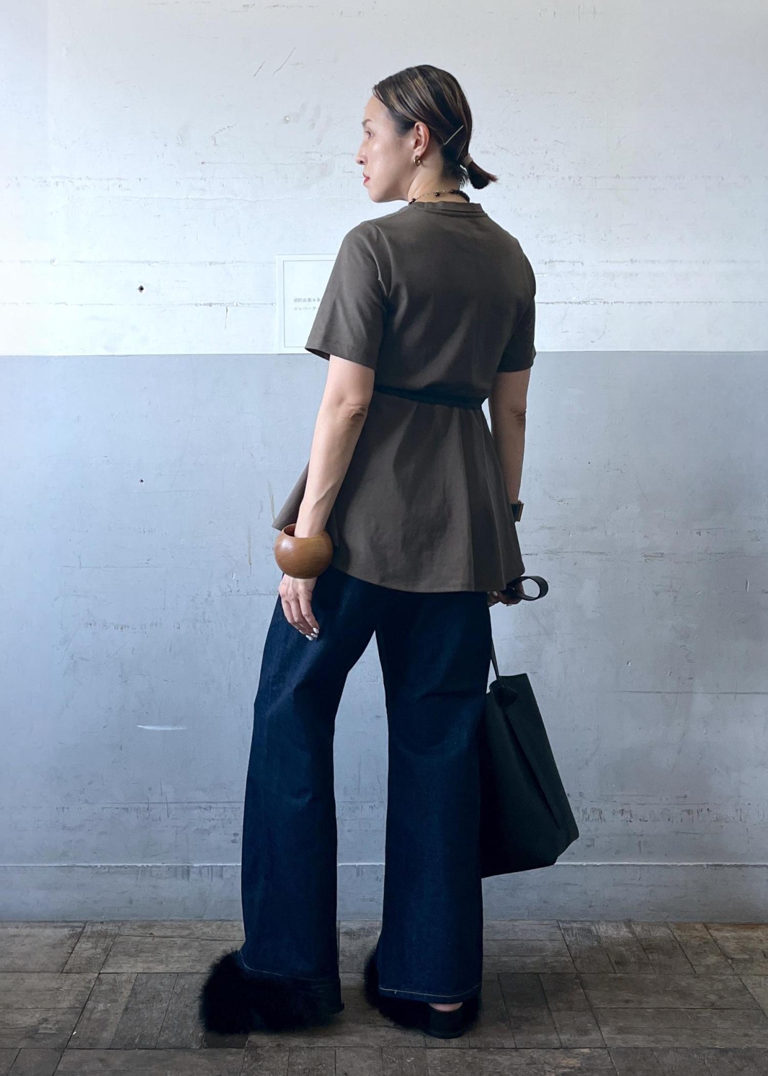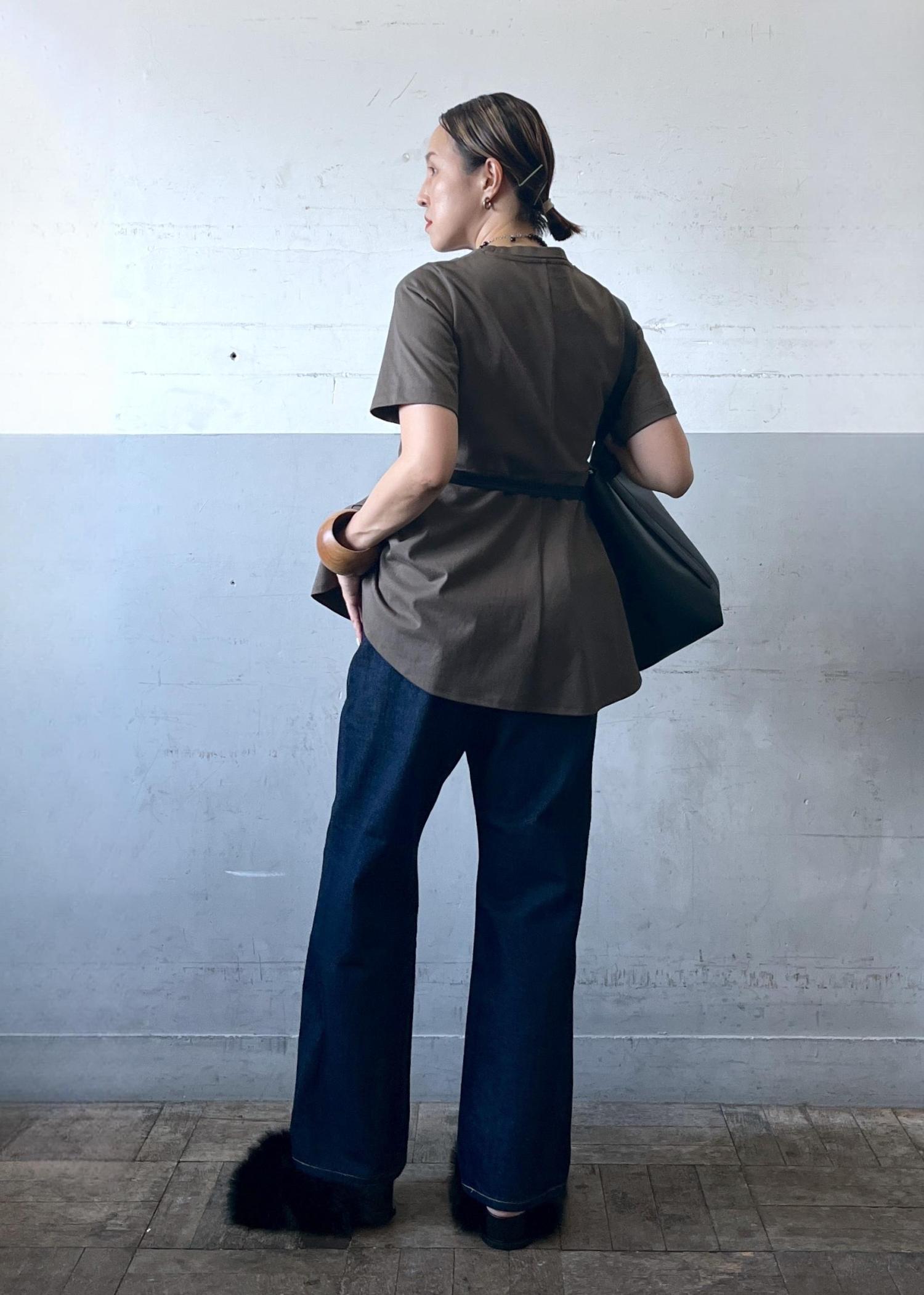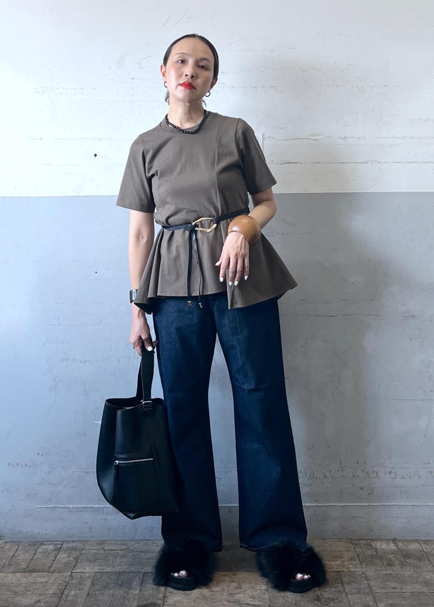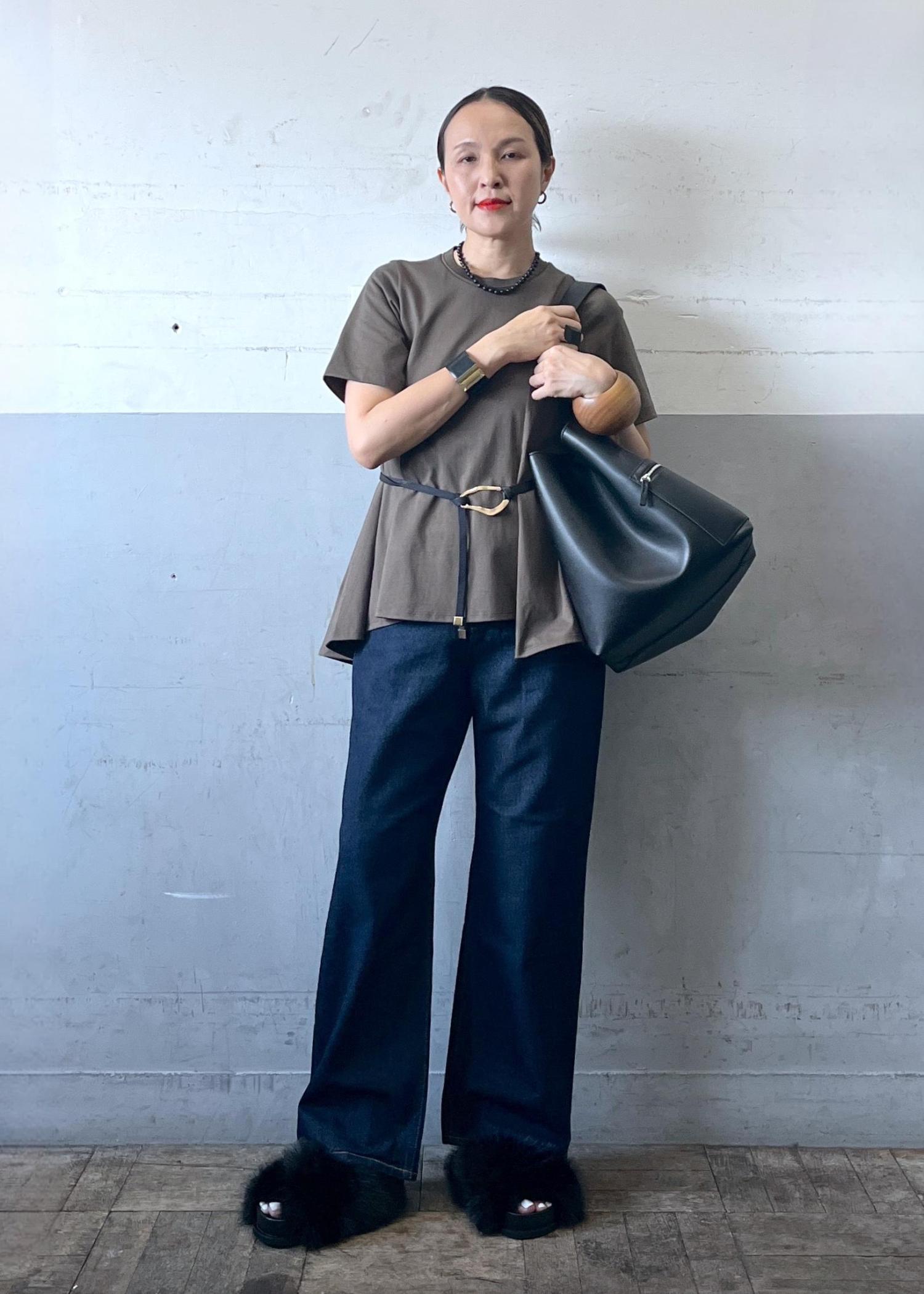 とても大人っぽい雰囲気だったので、デザインのあるトップスでシンプルに。お尻まで隠れるサイズ感なので、ウエストマークで目線を上げてスタイルアップを図りました。