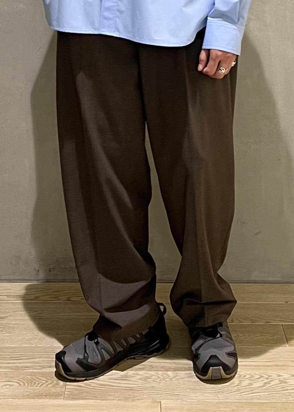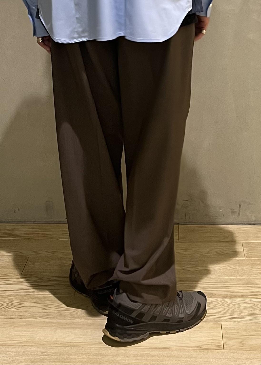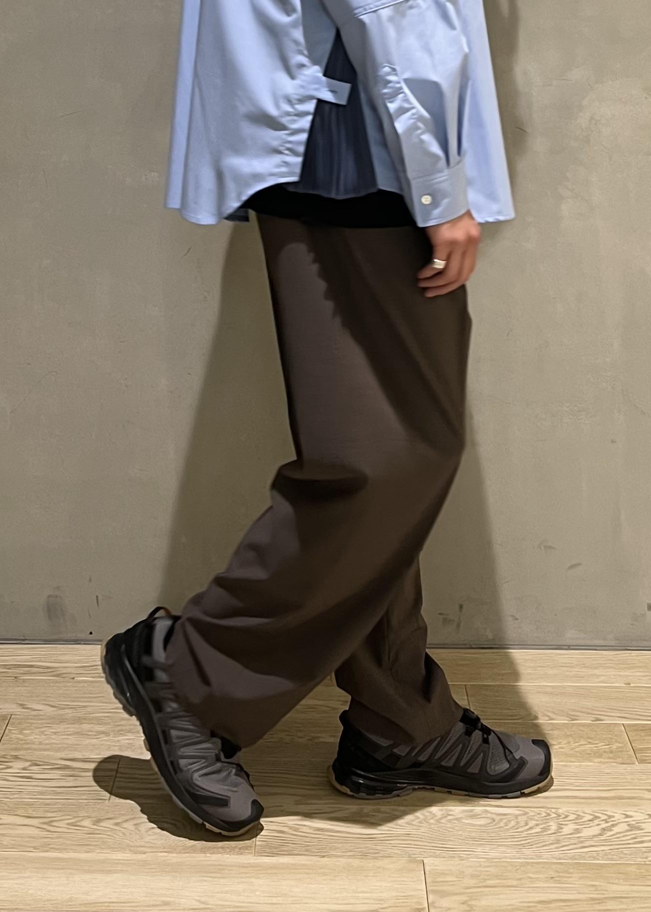 ソフトでしなやかな素材感で、ワイドシルエットのバランスもあり、非常に軽い履き心地です