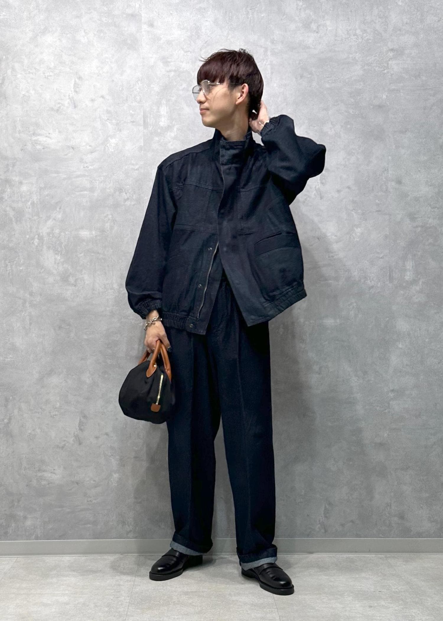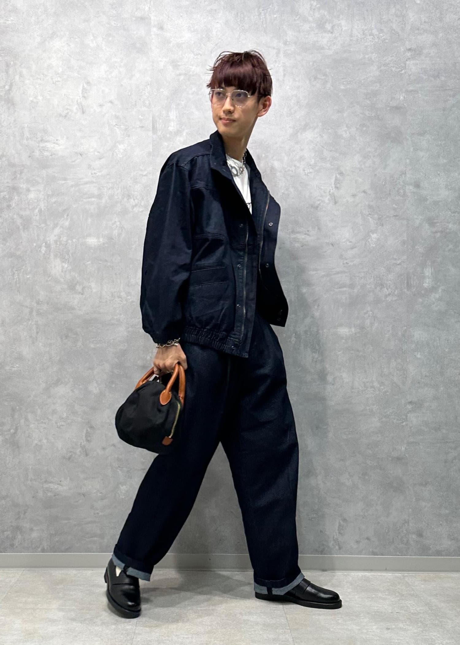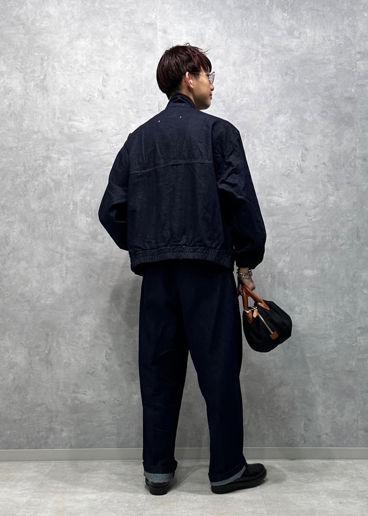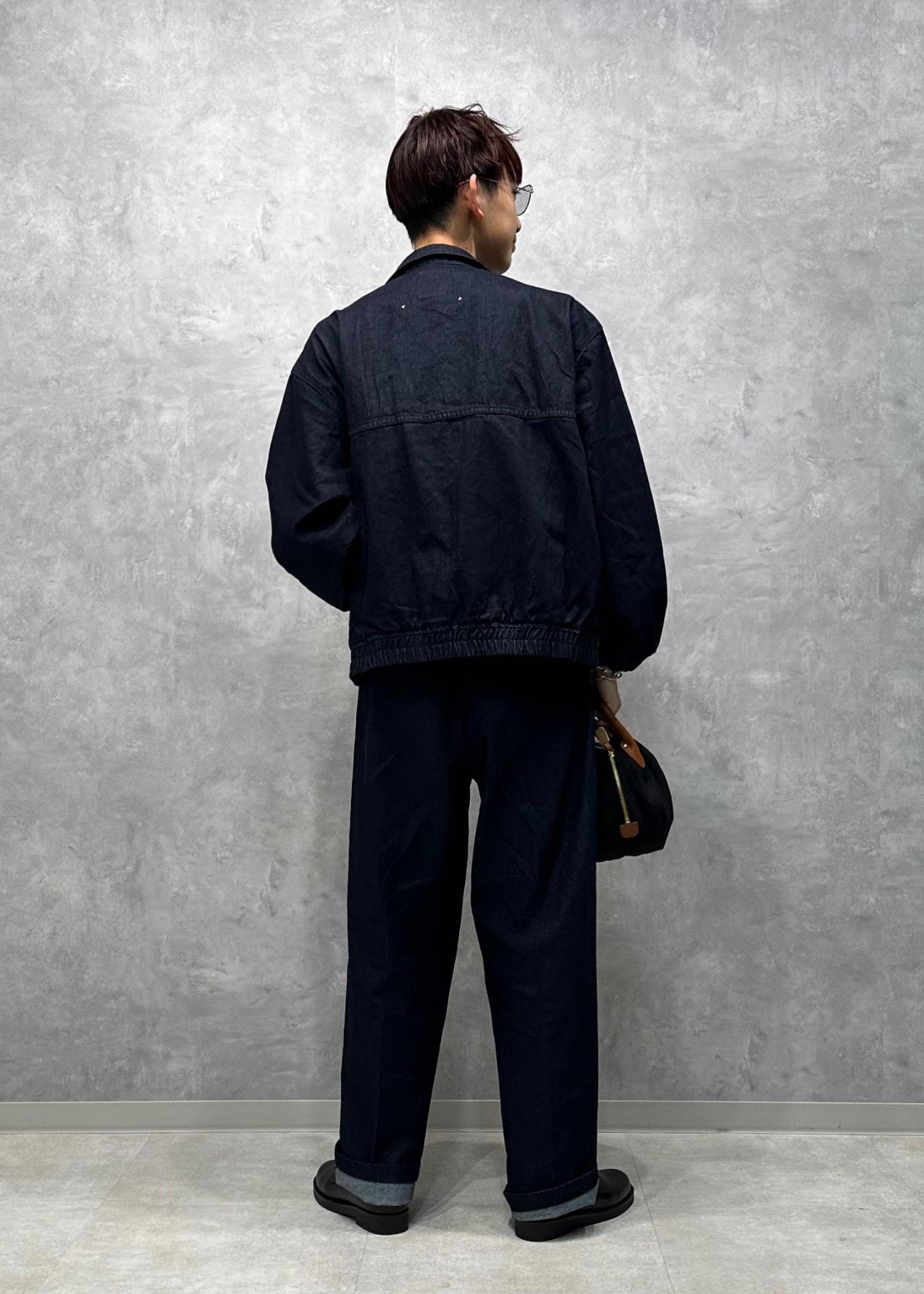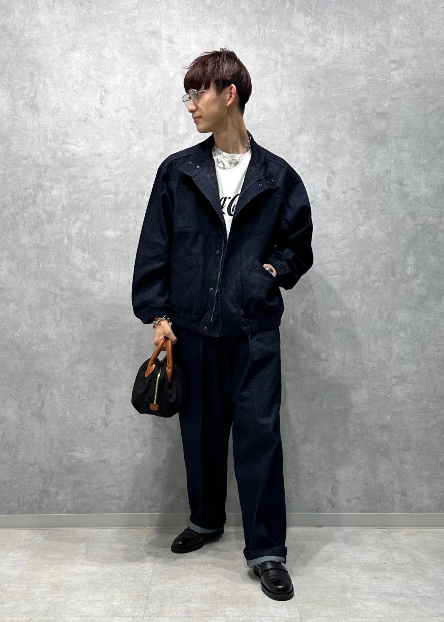 カジュアルすぎない、大人っぽデニムセットアップコーデです。ダブルジップ&襟が立つアウターに、センタープレスが入ったキレイなシルエットのパンツがとにかくカッコいい。落ち着いた色味もクリーン味あって美しい。寒くなったらこの上から大きめのアウターを羽織ってもかっこいいと思います。