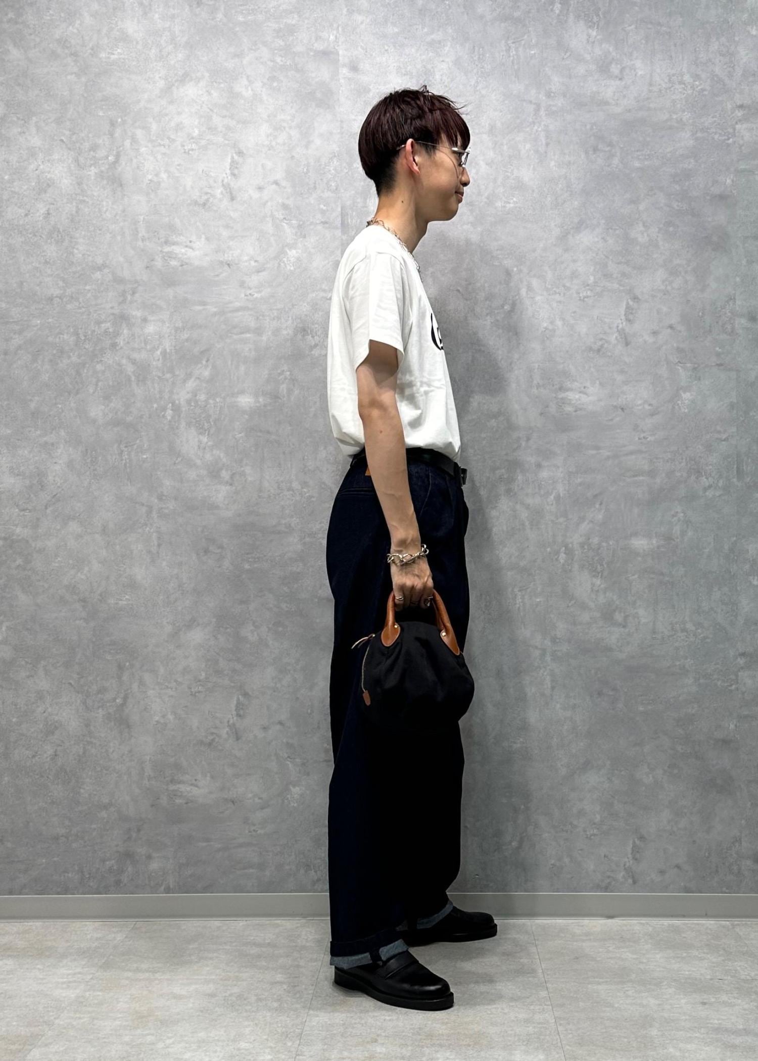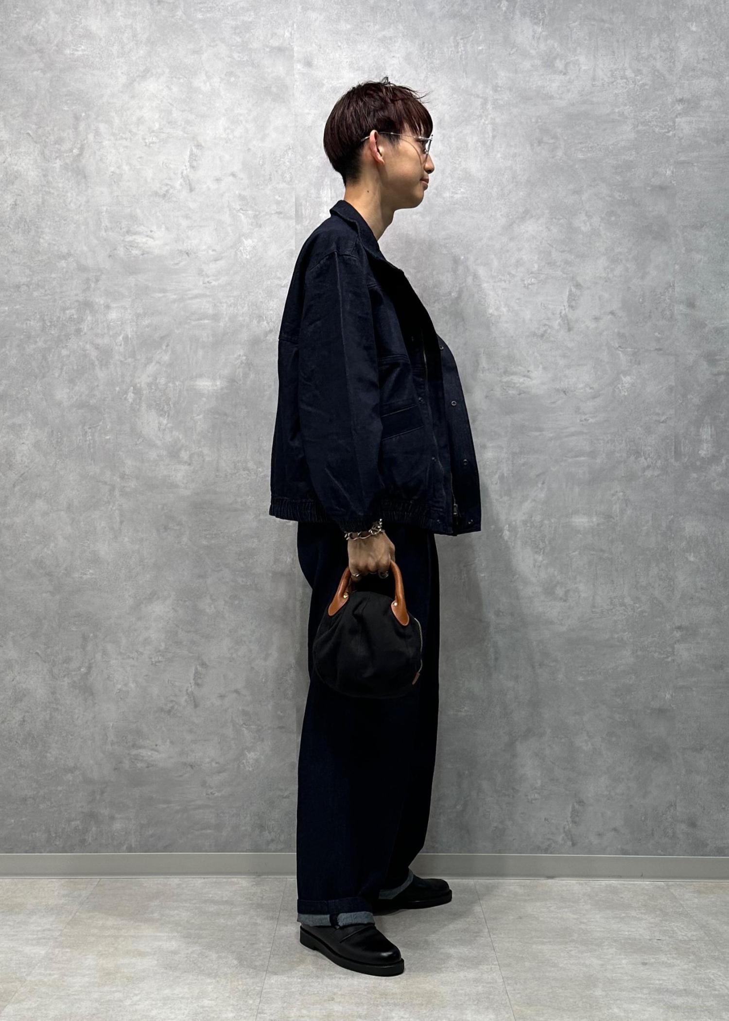 やや長めの丈感、センタープレスが入ったキレイなシルエットのパンツです。あえて大きく履いてロールアップしてもカッコいいです。ダークトーンでシックな印象。デニムというカジュアルな素材ながらもキレイで上品に感じます。腰元は紐がついていて、ゴムも入っているので履き心地も良いです。
