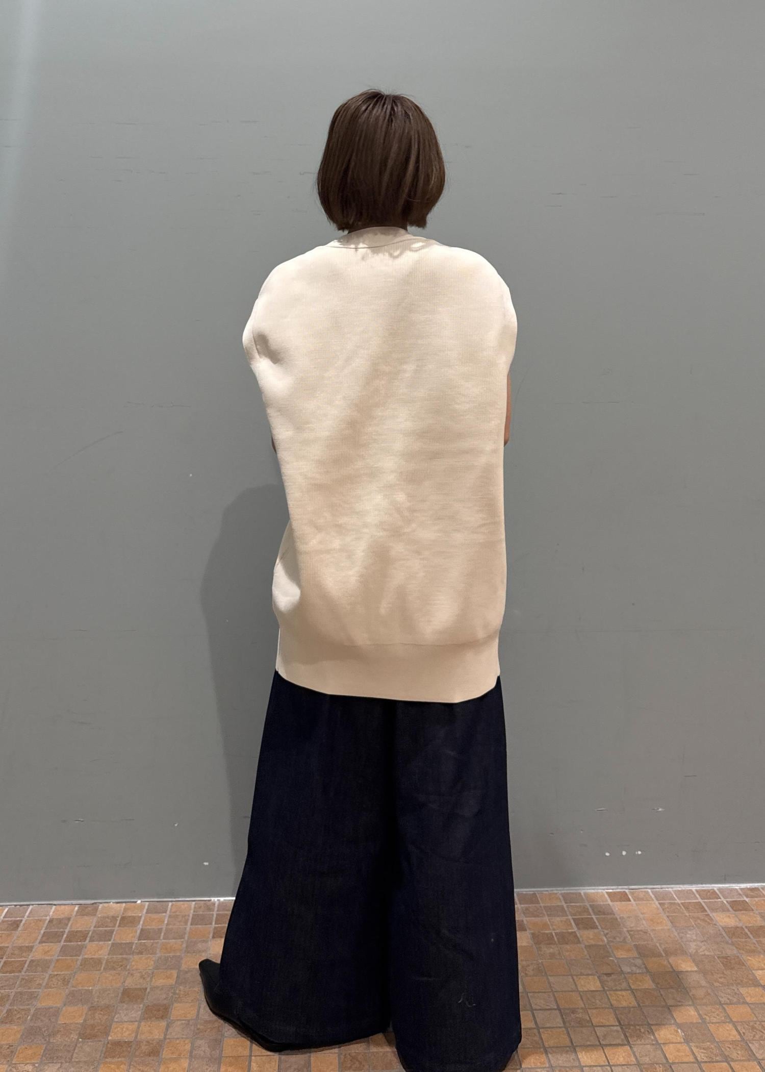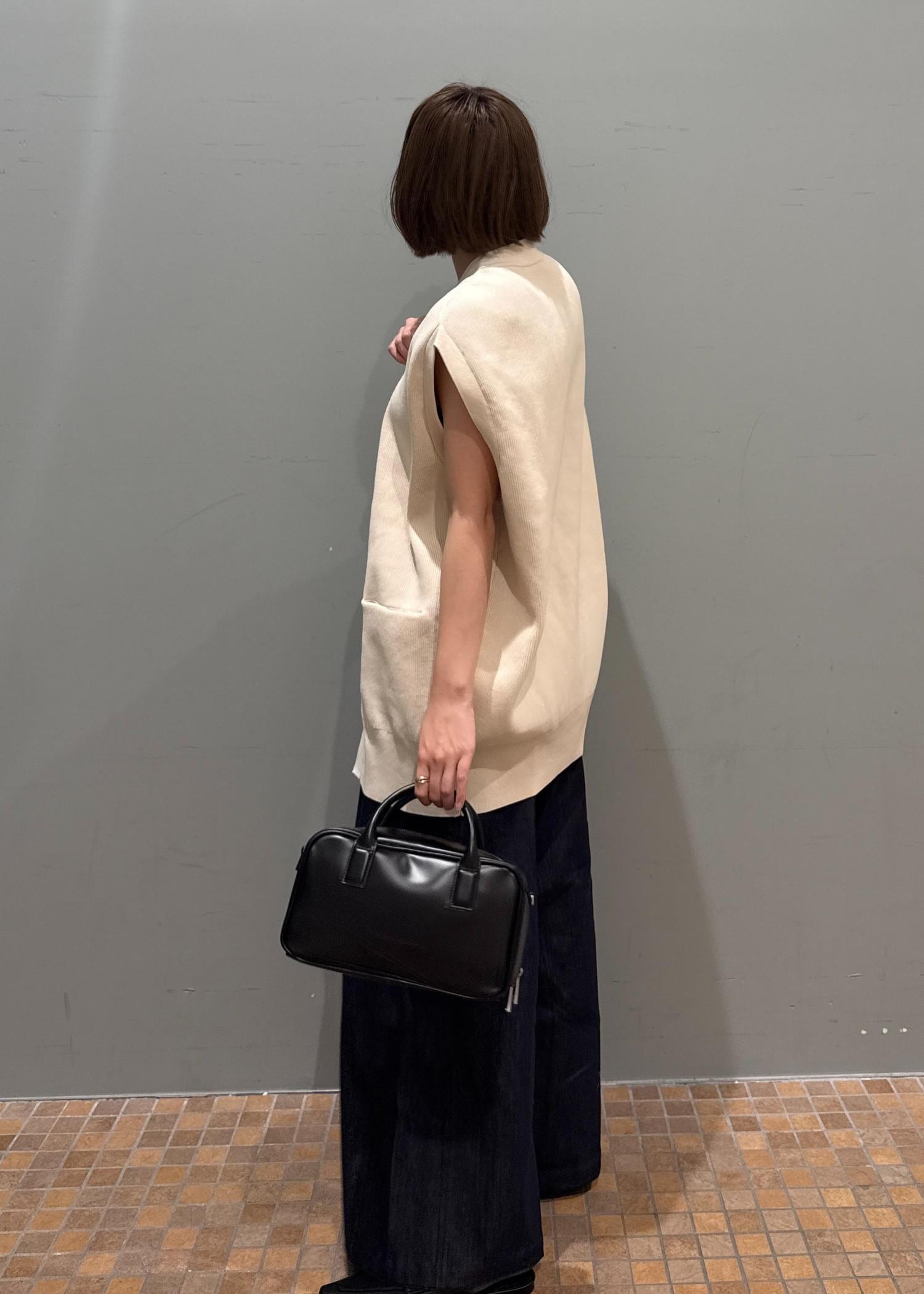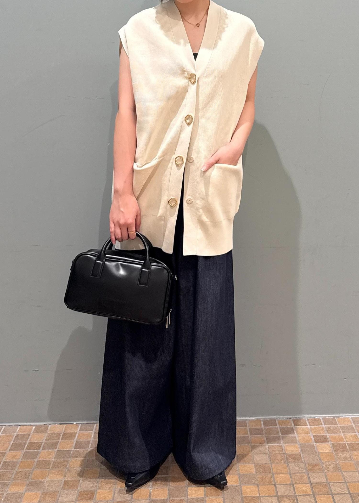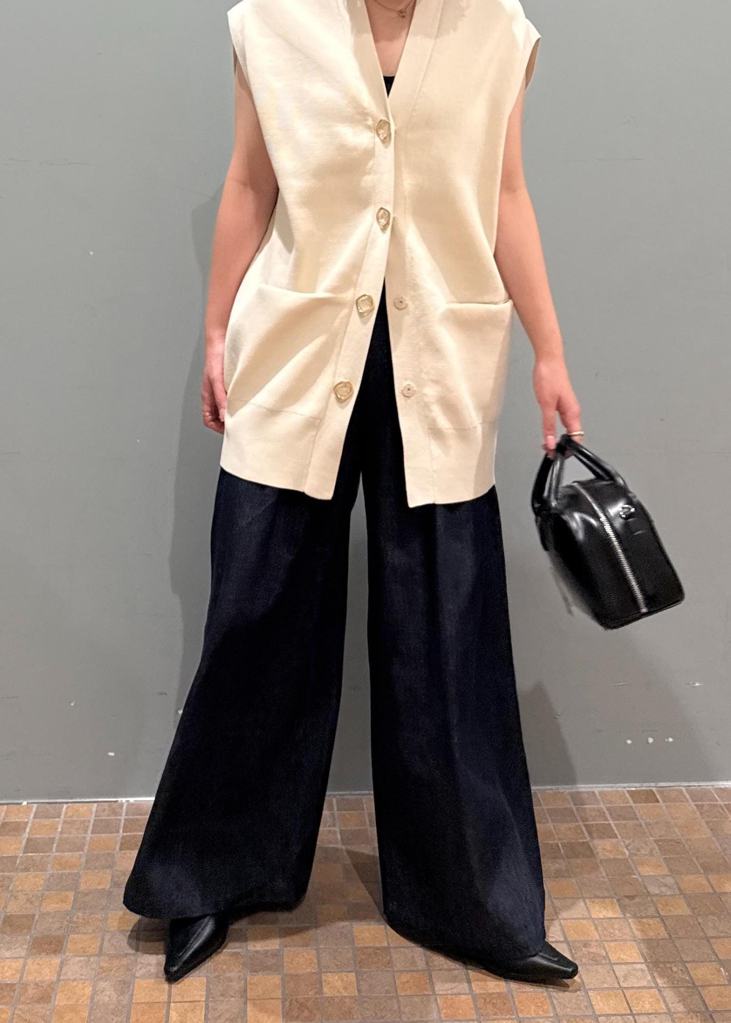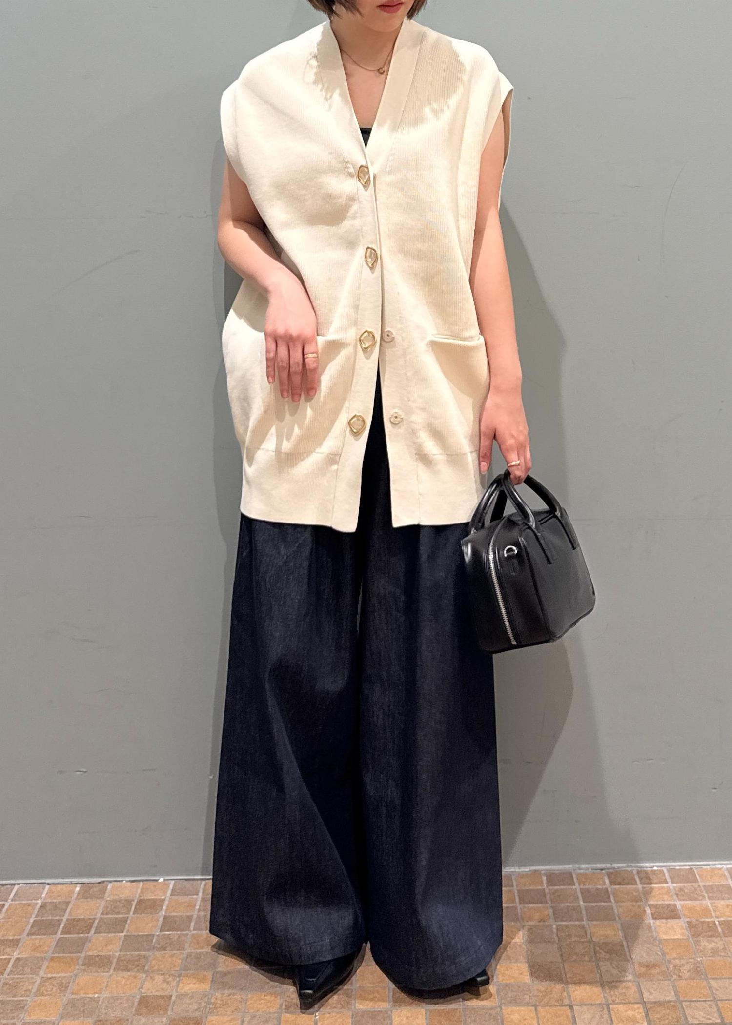 今回は、シルエットがとても綺麗なデニムを使って、ニットジレと合わせたスタイリングをご紹介します。