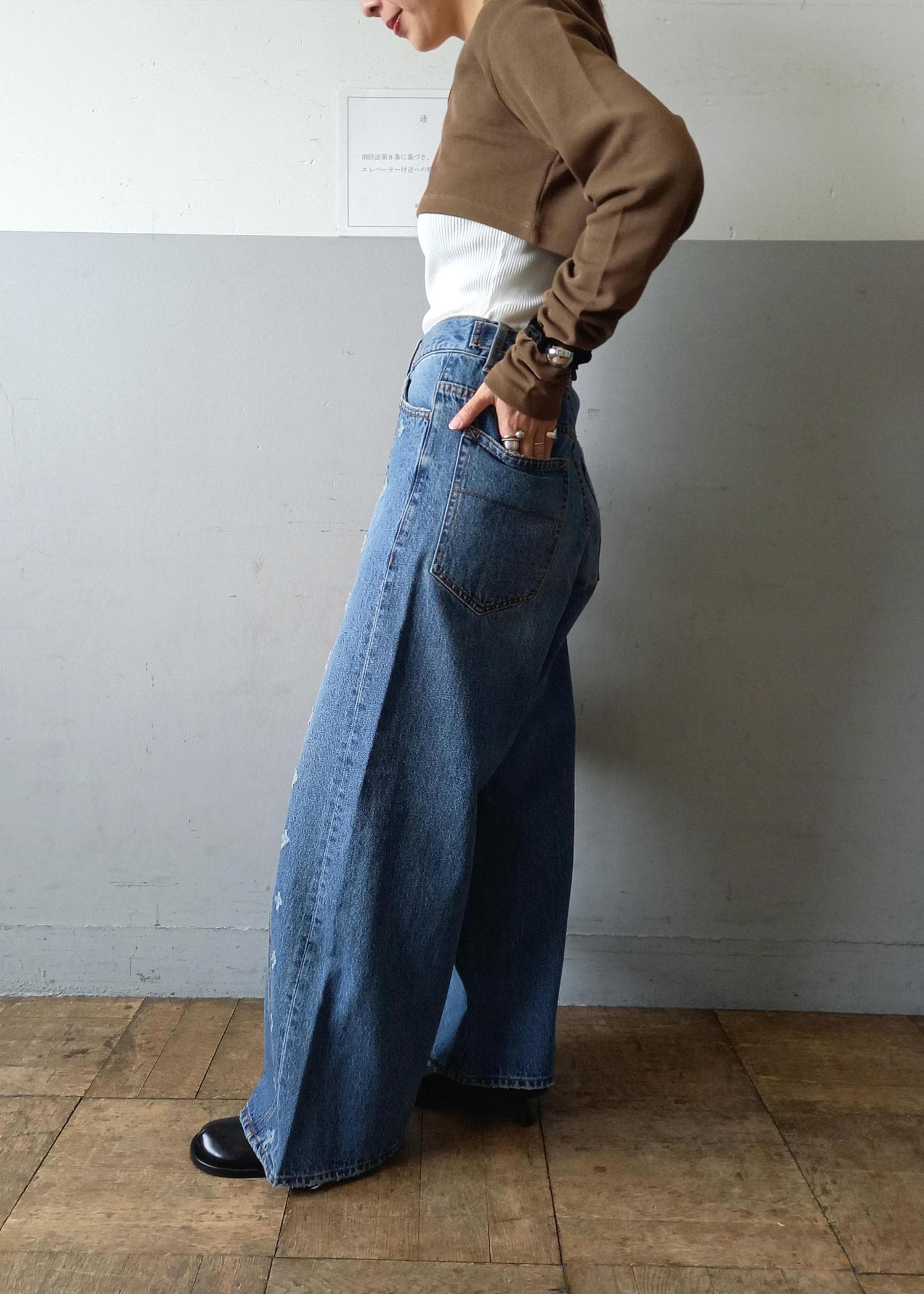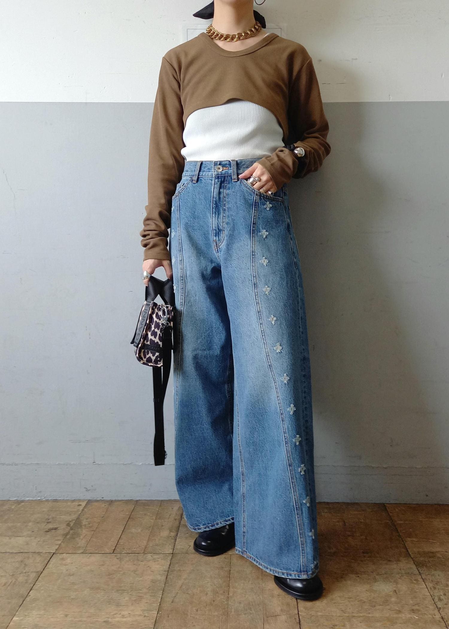 ADAM ET ROPÉ FEMMEイノセンスフラワーデニムサックス / 36¥22,000レビュー158㎝で36サイズを着用しています。ウエストは後ろのボタンで調節が可能です◎着丈は少し長めなので、骨格ウェーブで腰の位置が低い私は3㎝位の高さがあるシューズが安心でした☺️ダボッとルーズなシルエットが素敵です。