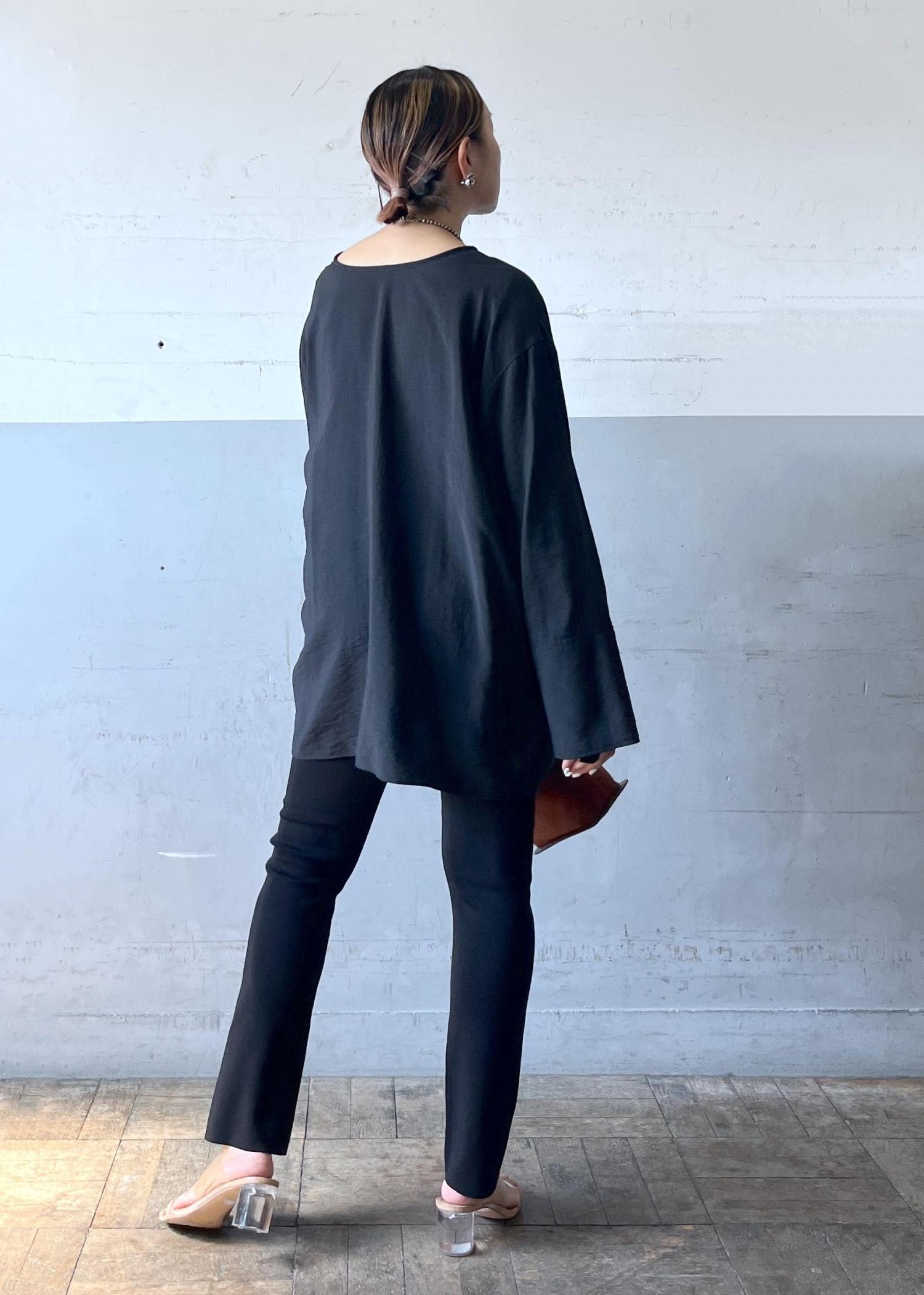 伸縮性のある素材でしっかり厚手。あまり体のラインを拾わないのでメインのボトムスとして着用しても◎