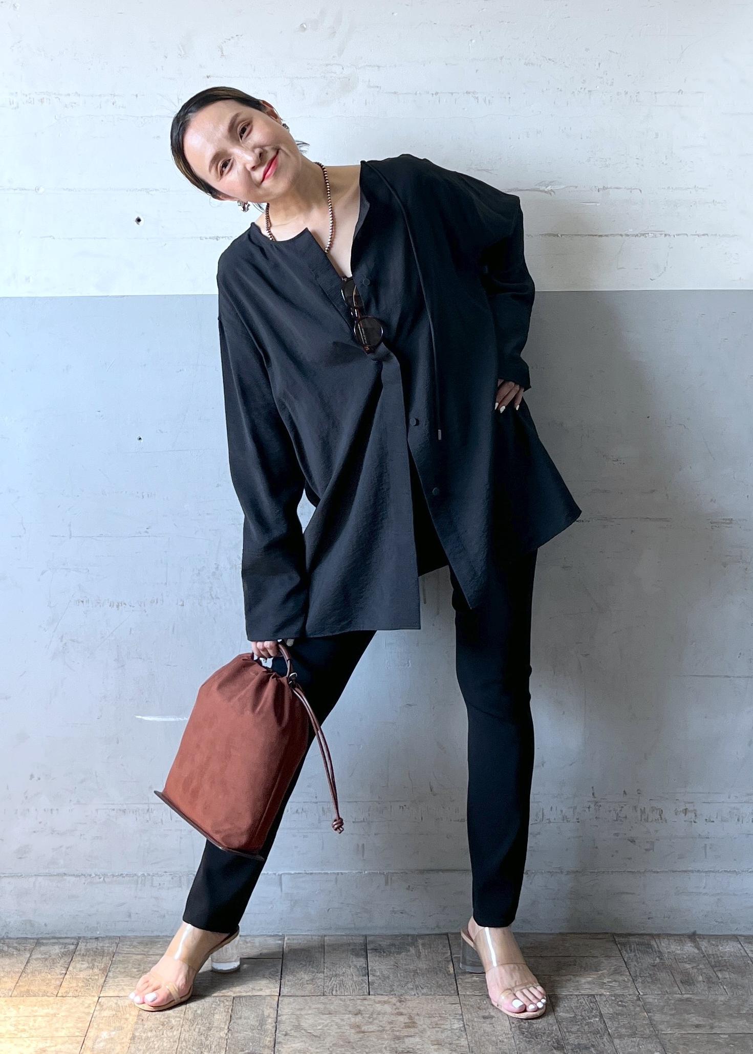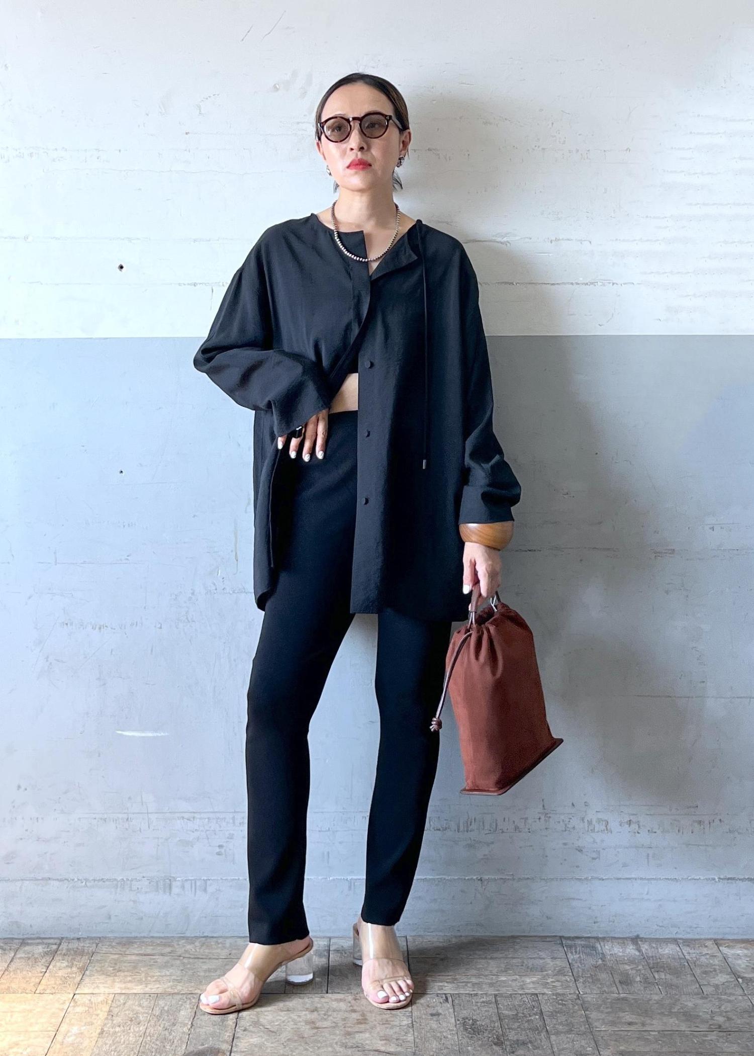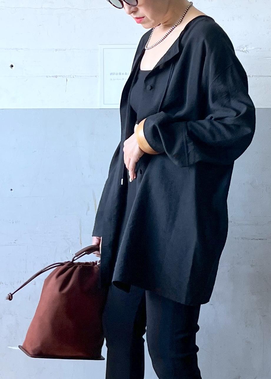 リネン混のサラッとした素材で羽織りでもチュニックとして着ても◎ お尻が隠れる長さなのが嬉しいポイント。首元の細い紐も首に巻いたり垂らしたり、結んだりとアレンジしてみて!