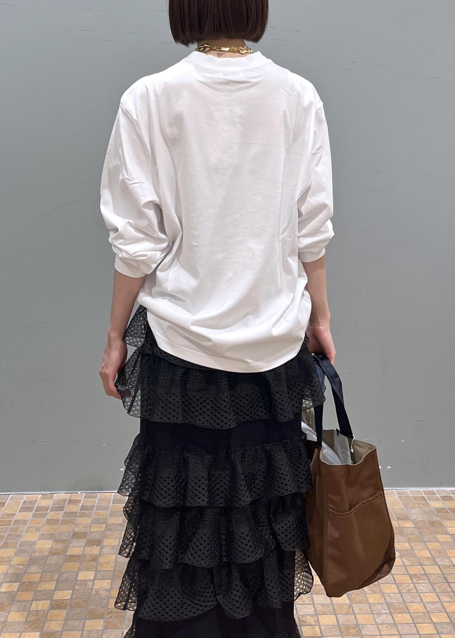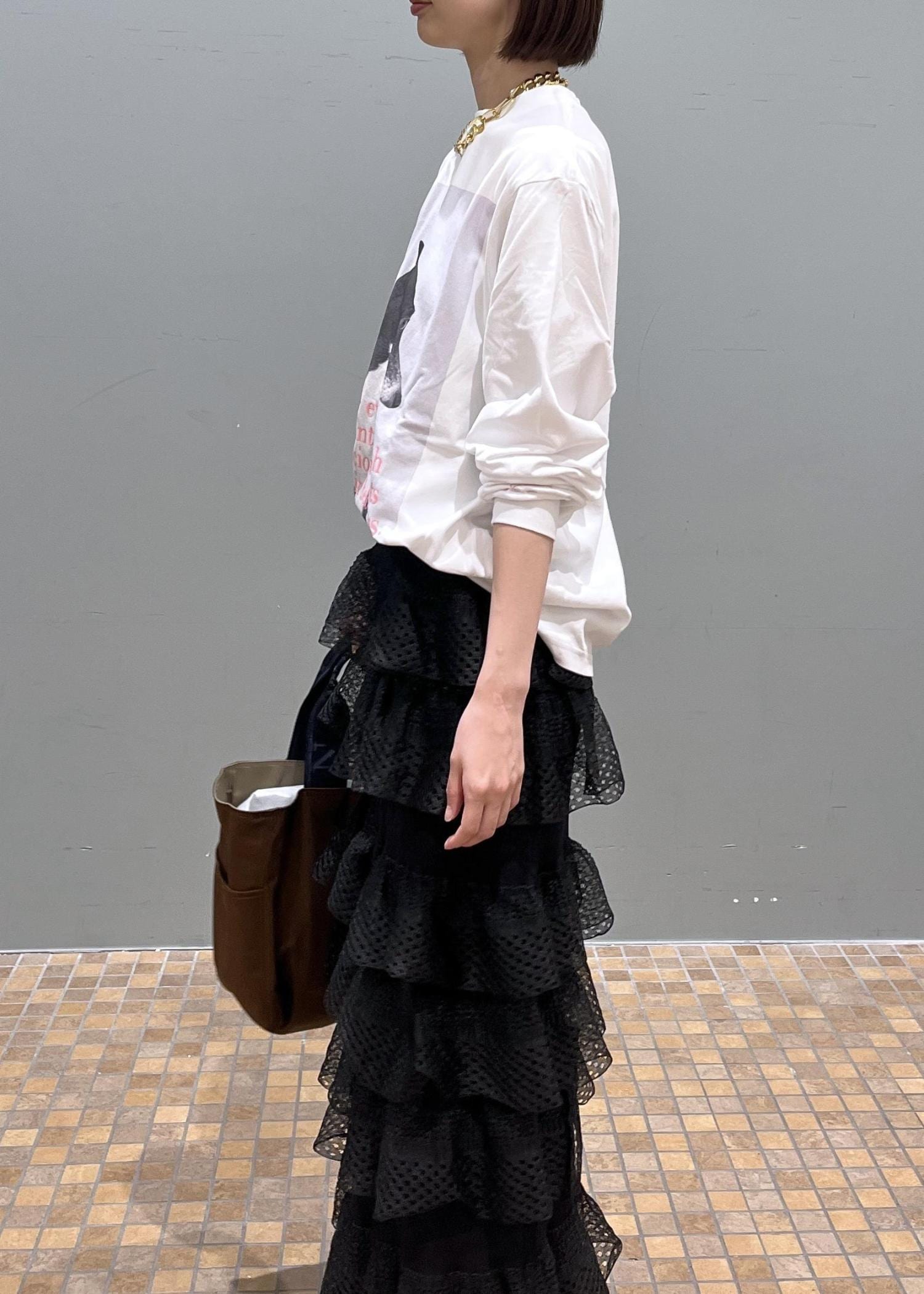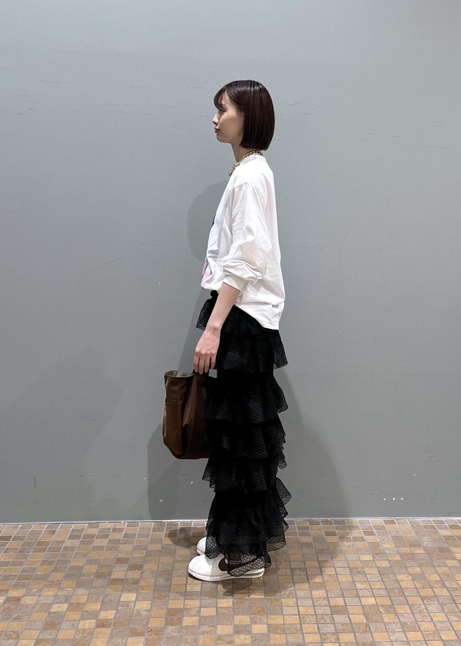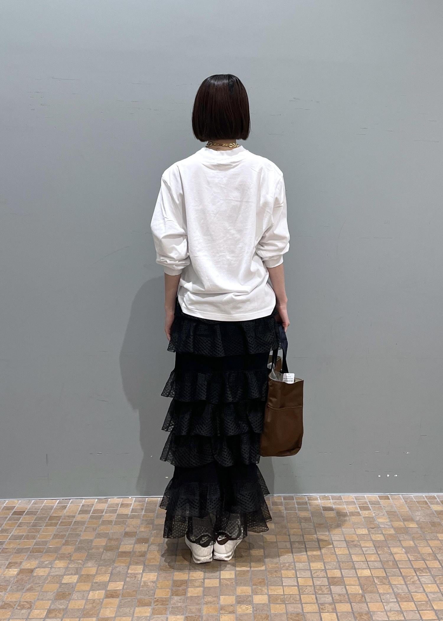 ADAM ET ROPÉ FEMMEシアーフリルスカートブラック / F¥19,800レビューフリーサイズですがウエストがゴムになっているのでとても着やすいです。タイトなシルエットですが、フリルが身体のラインを程よくカバーしてくれます!
