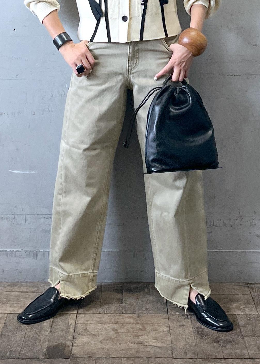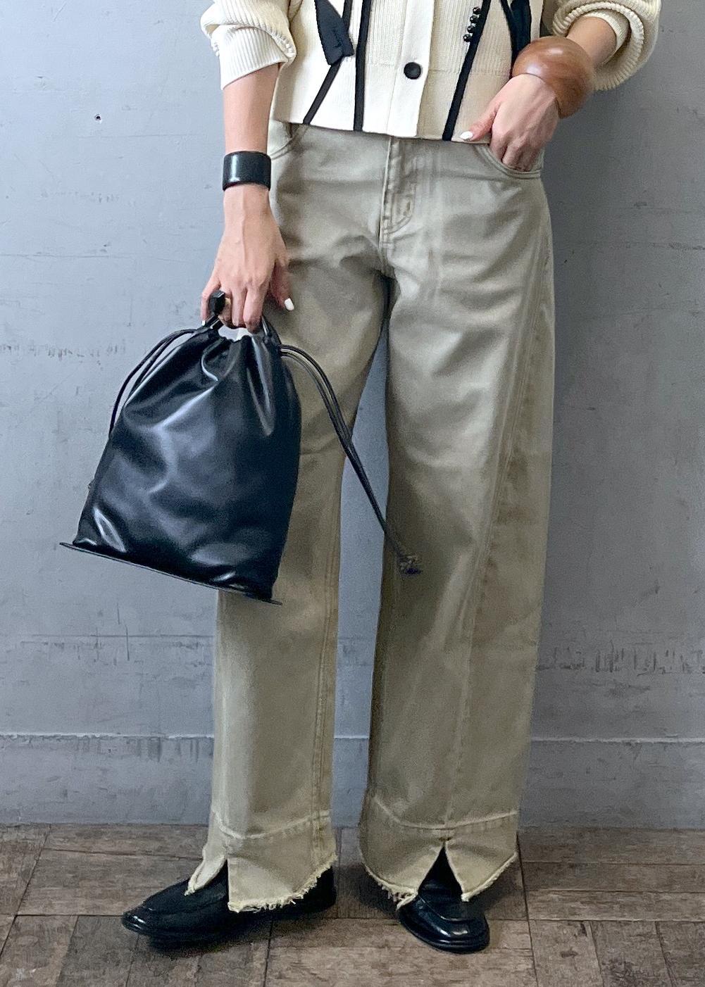 バッグは少しカジュアルに巾着型ですがレザー調で大人っぽく。