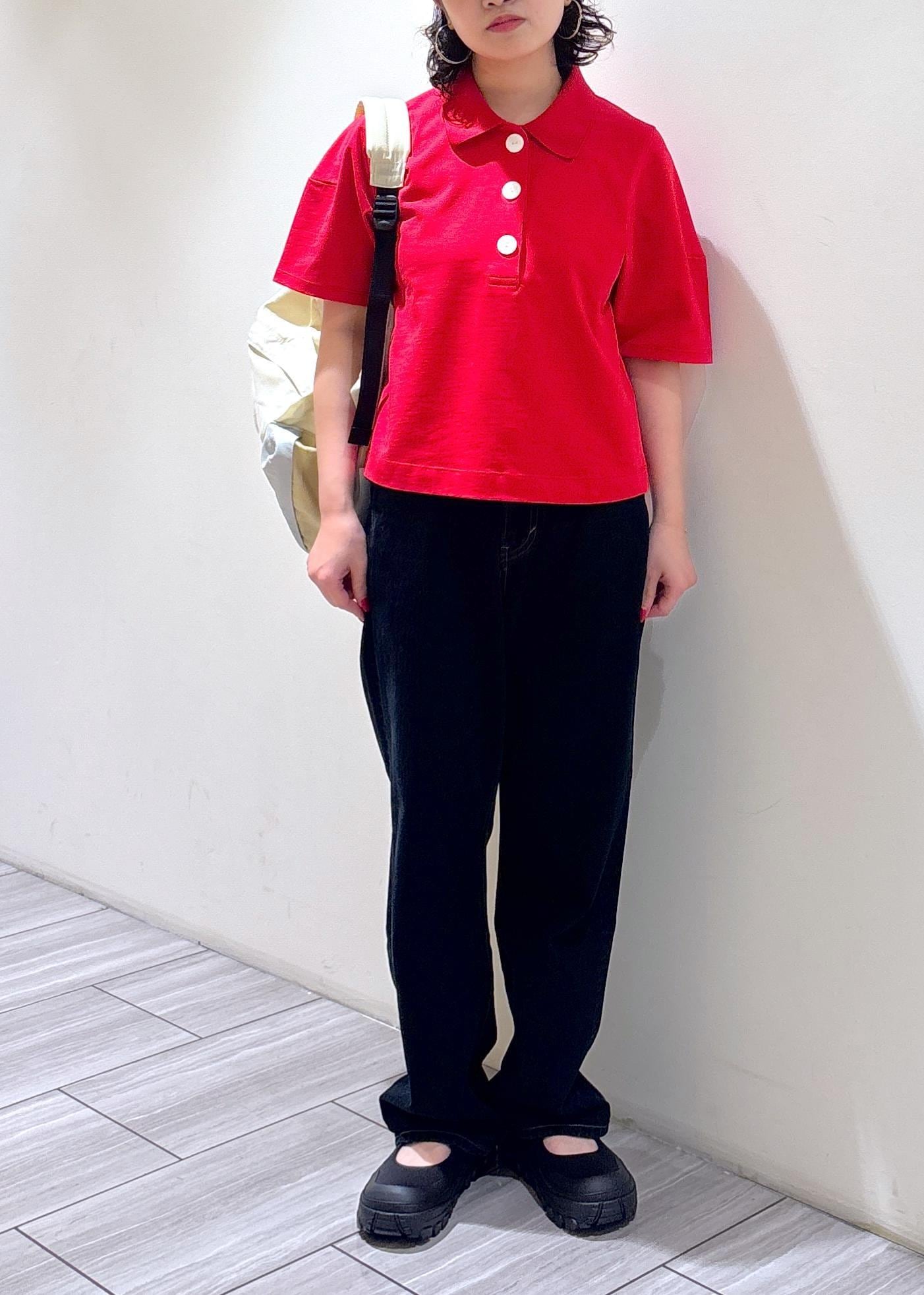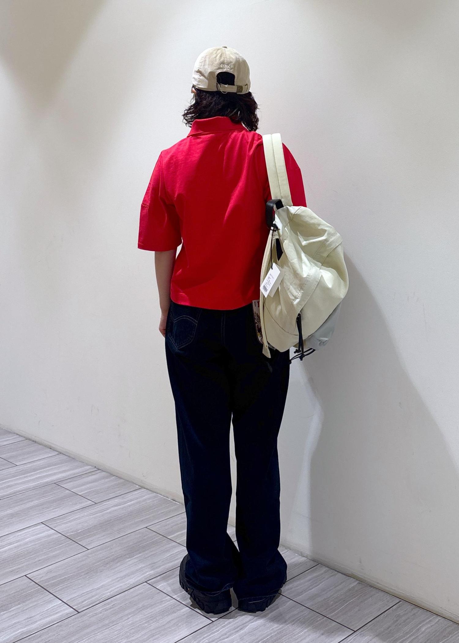 鮮やかな赤が目を引くポロシャツを使ったコーディネートです!