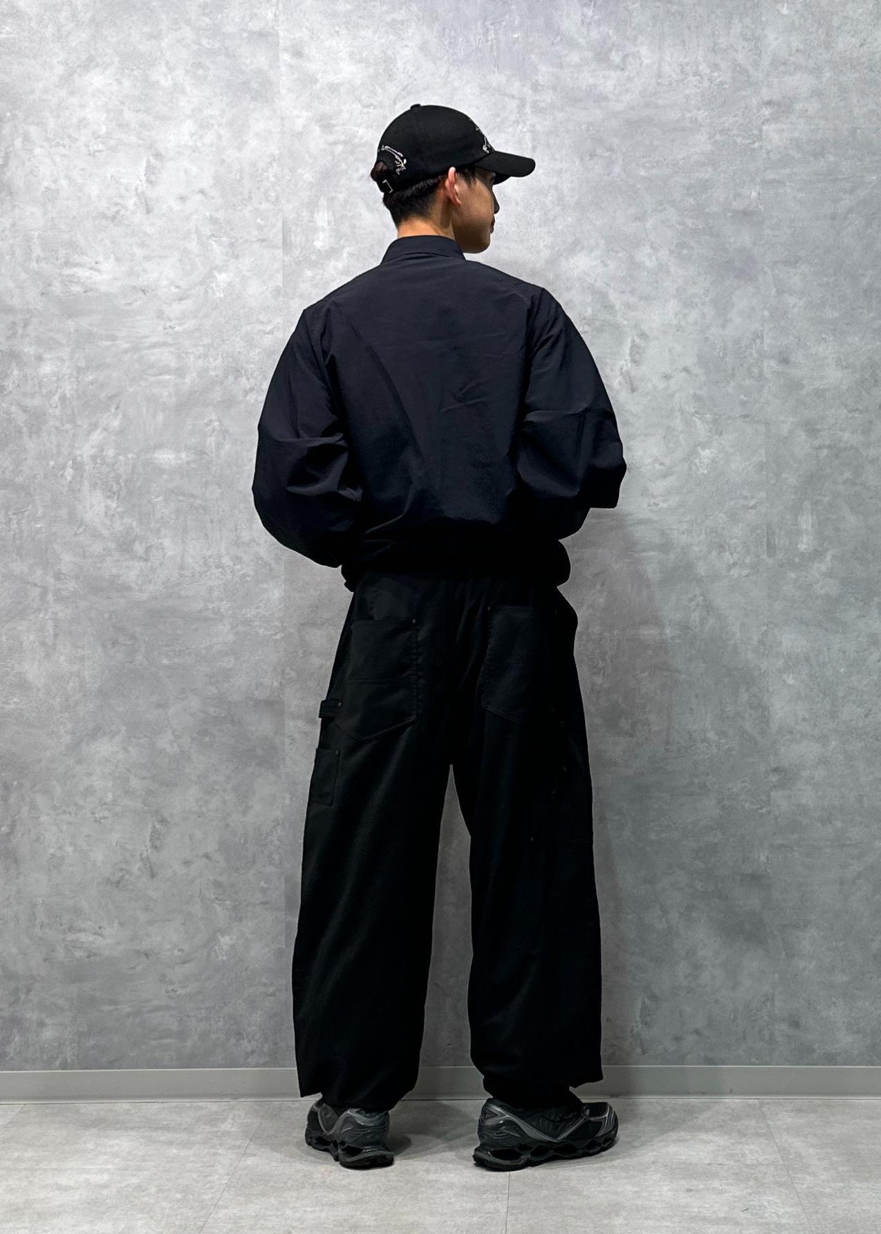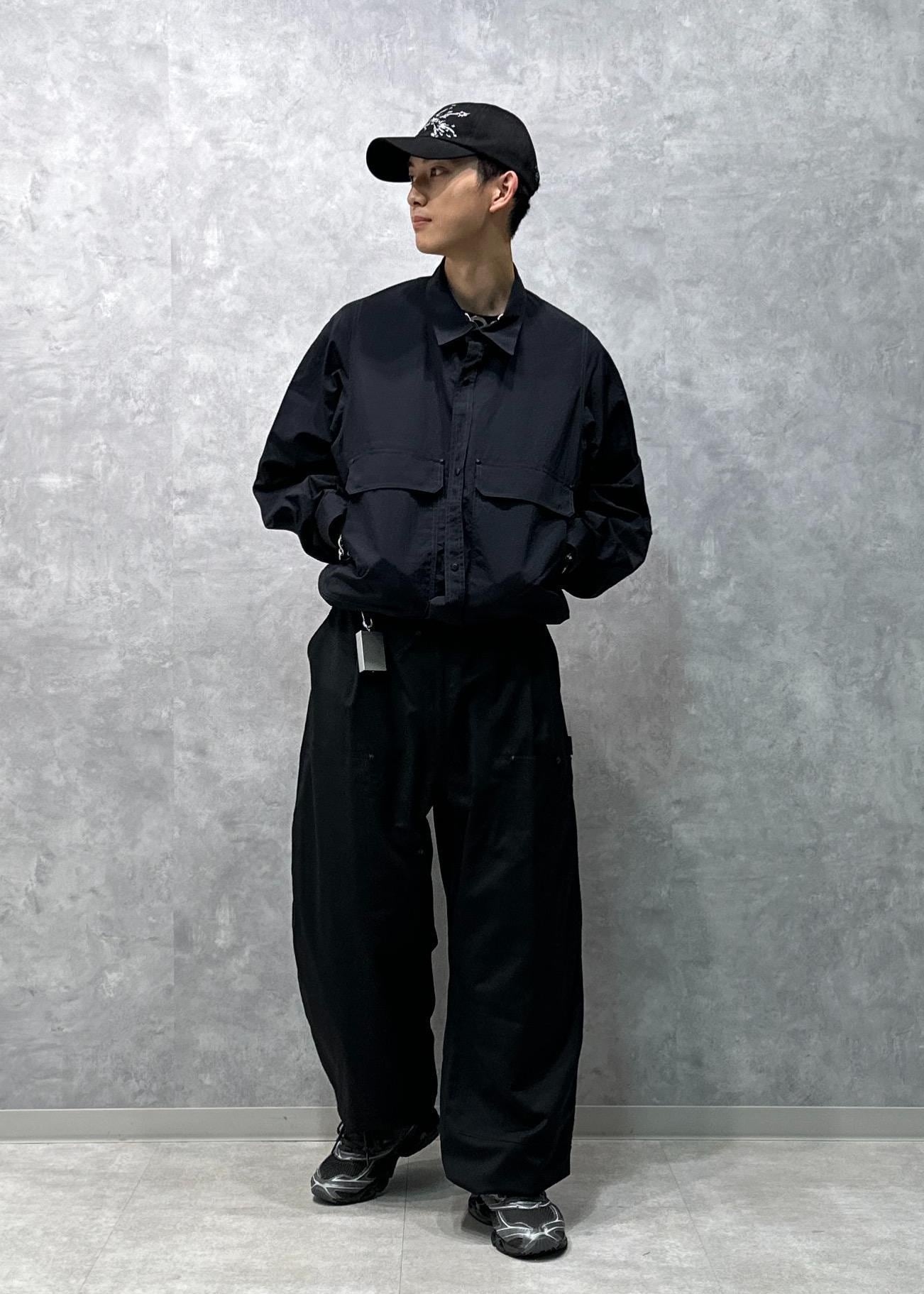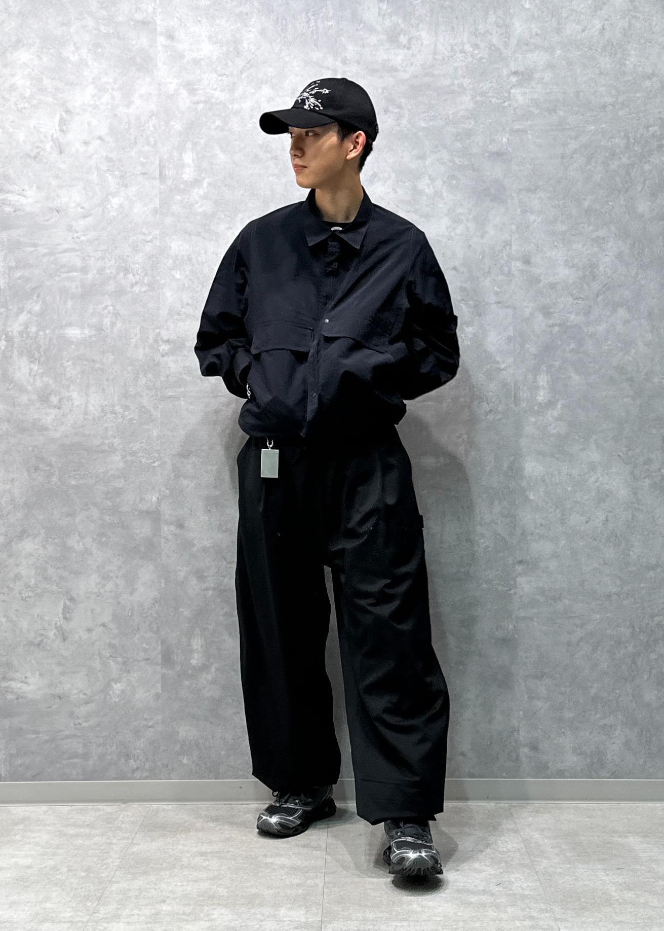 オールブラックでまとめ、カジュアル要素を取り入れながらもクリーンで大人っぽくまとめたモードストリートコーデです。全体的に丸みを帯びたシルエットで、腰元のアクセサリーやナイロンジャケットの生地感が映えます。程よいラフさもあり動きやすいです。