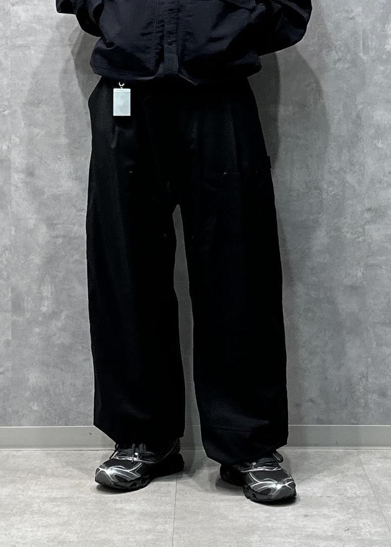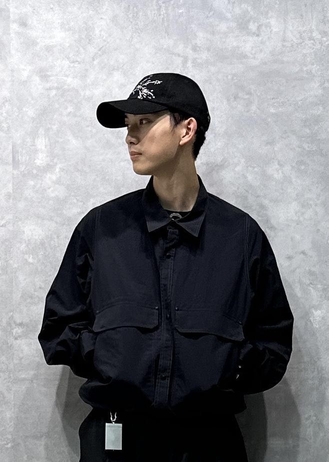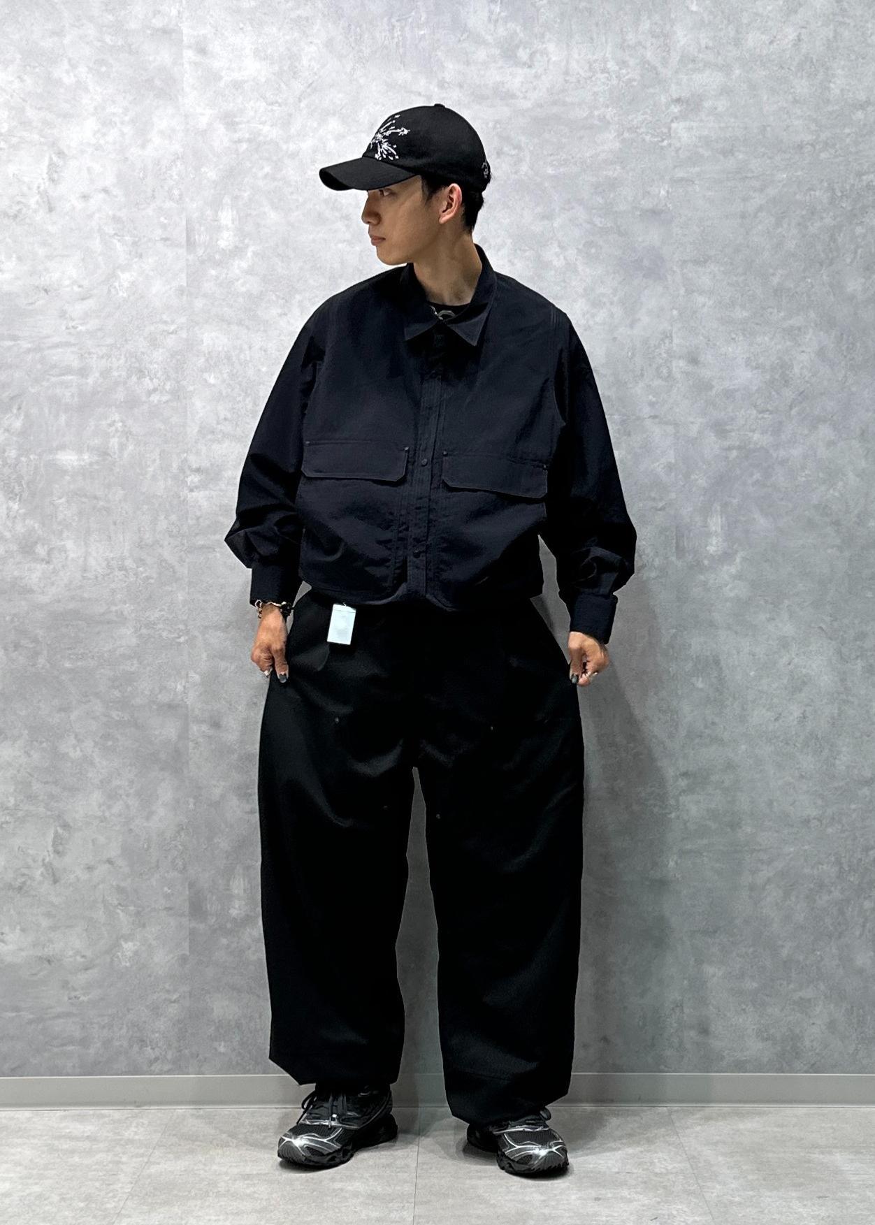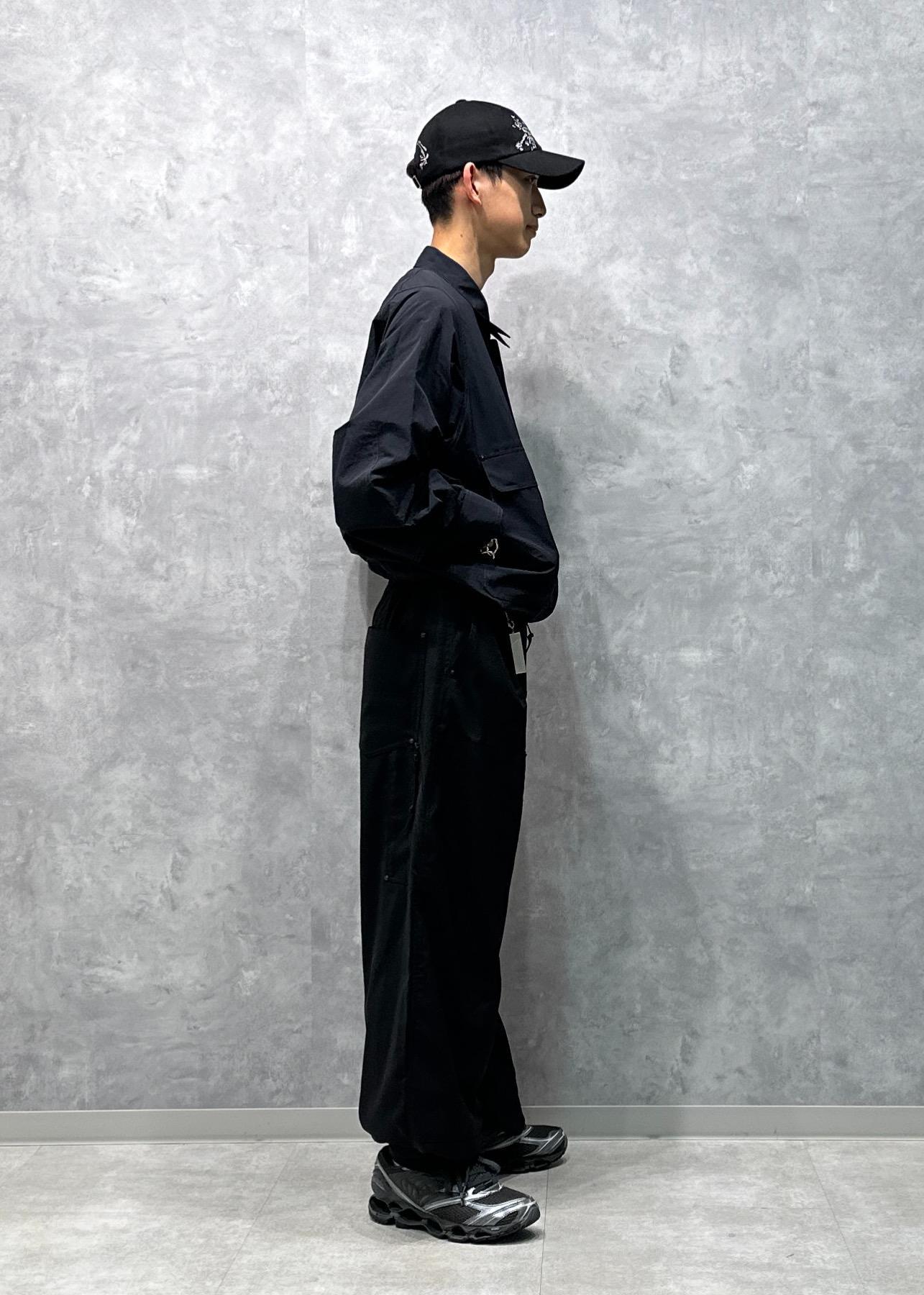 オールブラックでまとめ、カジュアル要素を取り入れながらもクリーンで大人っぽくまとめたモードストリートコーデです。全体的に丸みを帯びたシルエットで、腰元のアクセサリーやナイロンジャケットの生地感が映えます。程よいラフさもあり動きやすいです。
