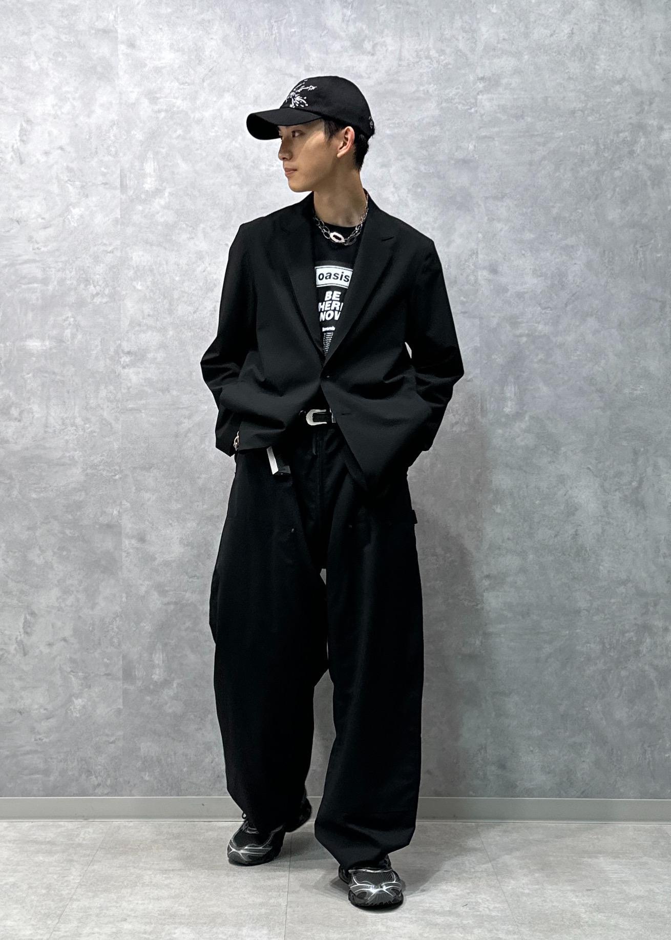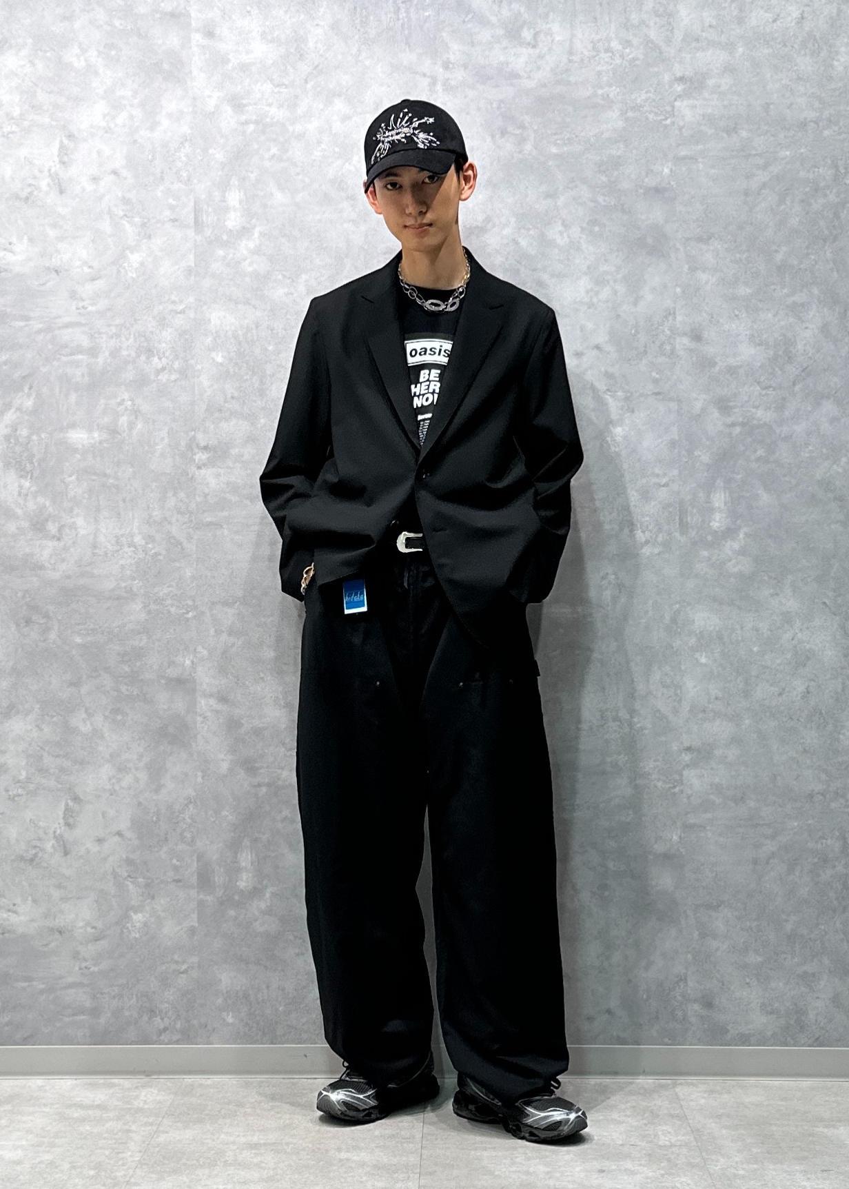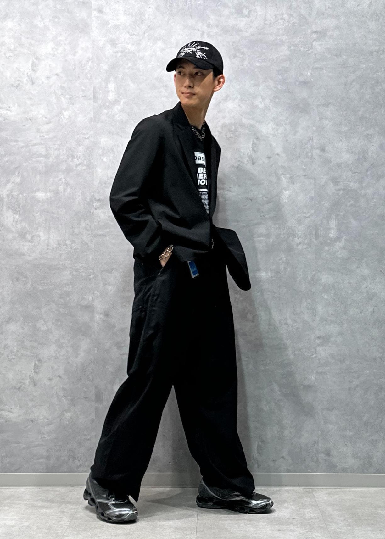 クリーンなカーゴパンツにテーラードジャケットを組み合わせ、スニーカー、キャップでカジュアル要素を取り入れたきれいめモードコーデです。黒でまとめることでカジュアル感満載になりにくく、大人っぽくカッコよく仕上がります。