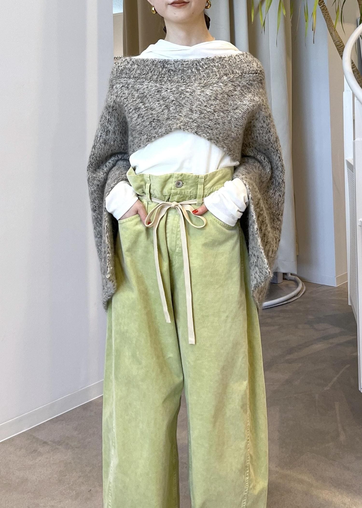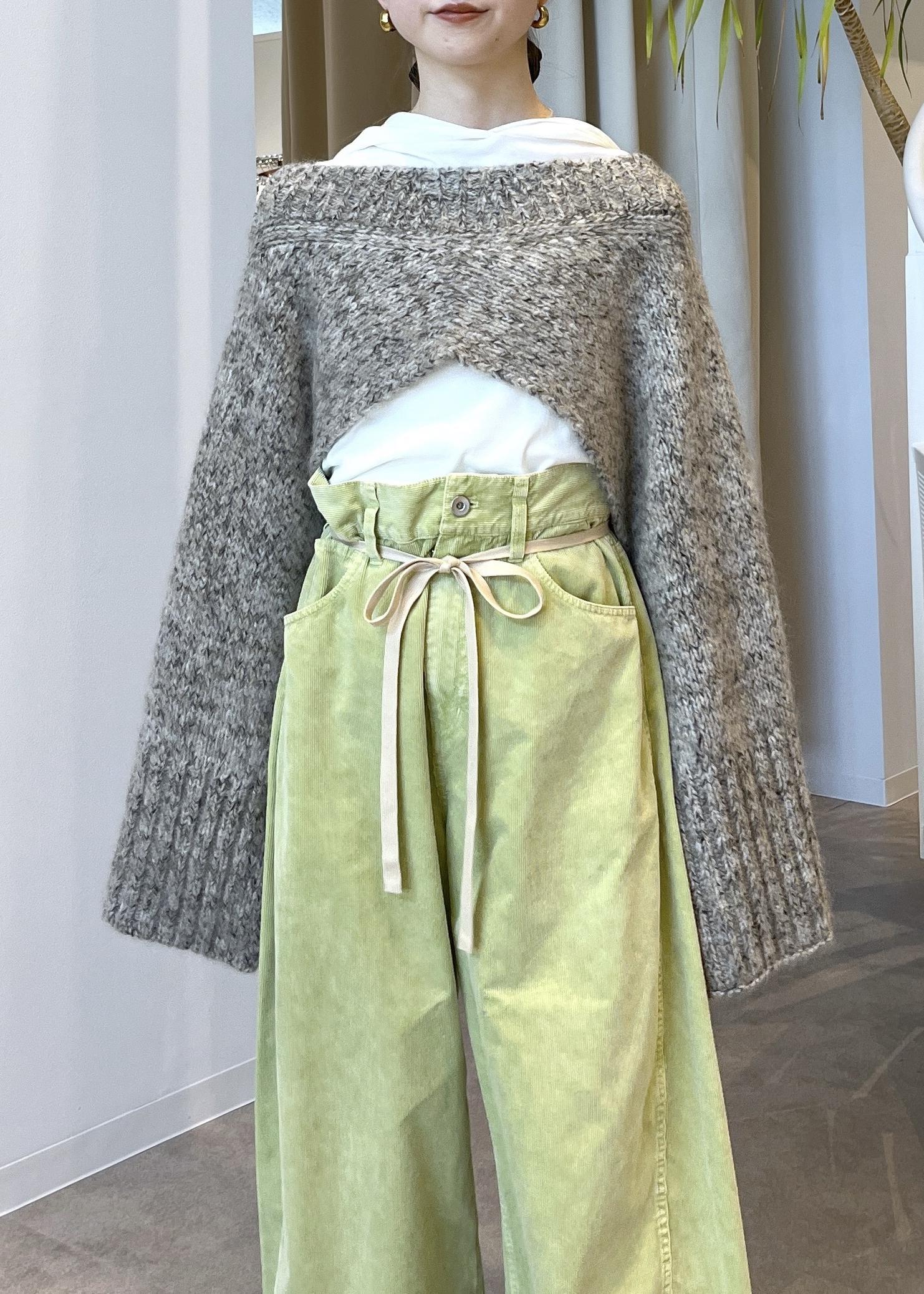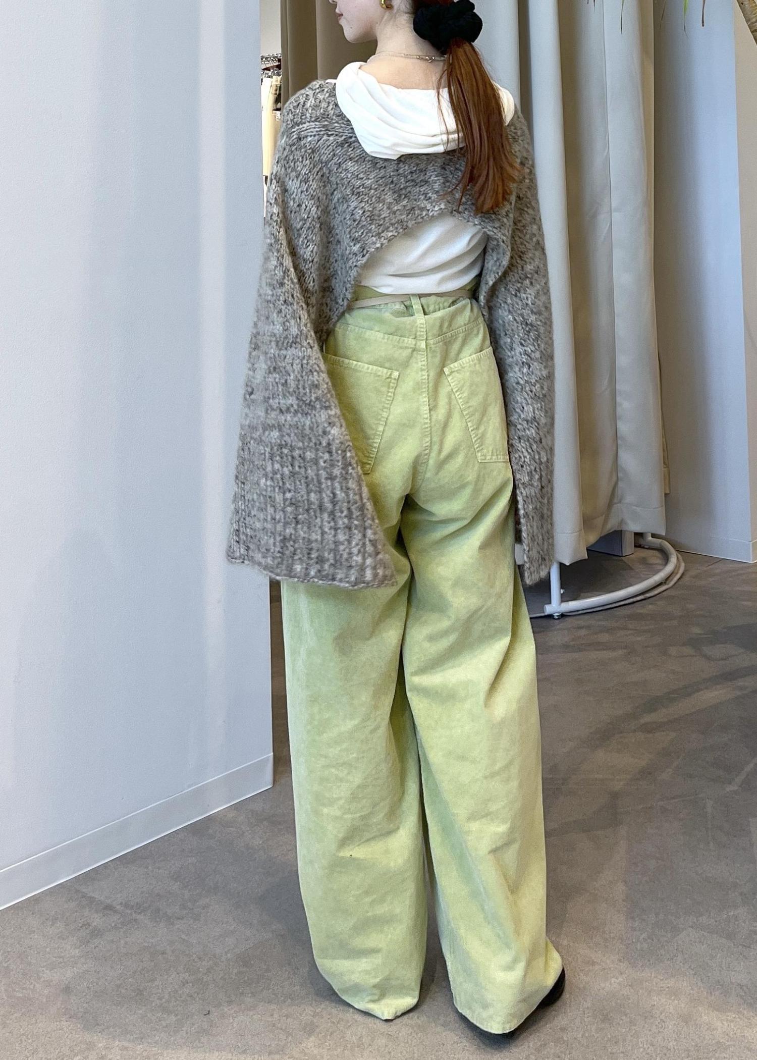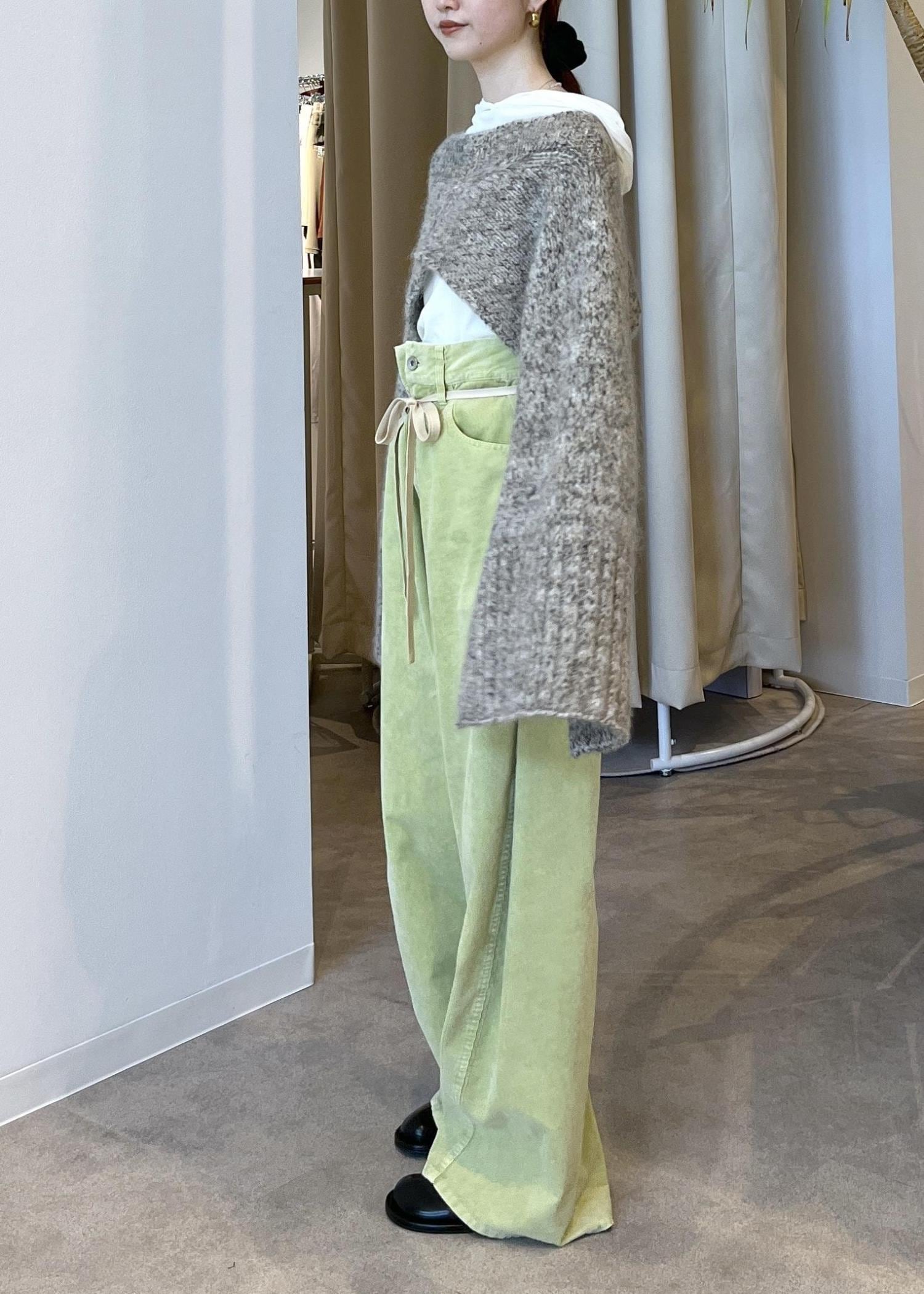 硬いコーデュロイではなく、とにかく柔らかく肌触り抜群◎厚地ではないので気温の高い時期からご活用いただけます。サンプルの為38サイズを着用しており、全体的にルーズな感じが可愛いです!ウエストのヒモでハイウエストにしたり、腰履きにしたりと変化がつけられます。