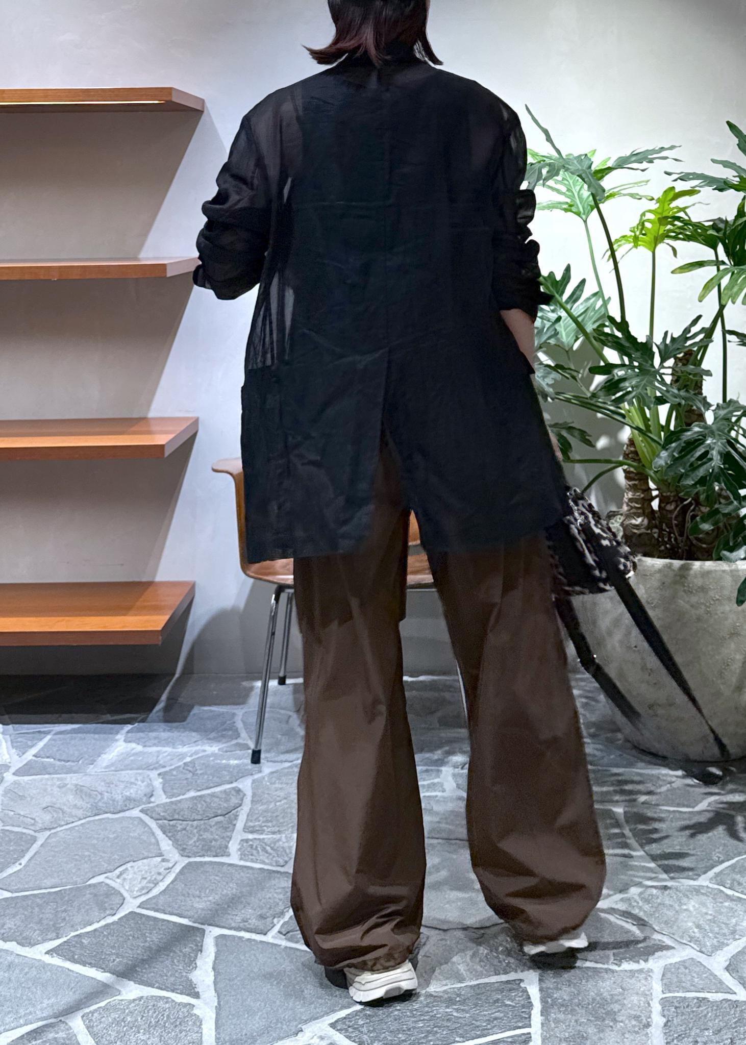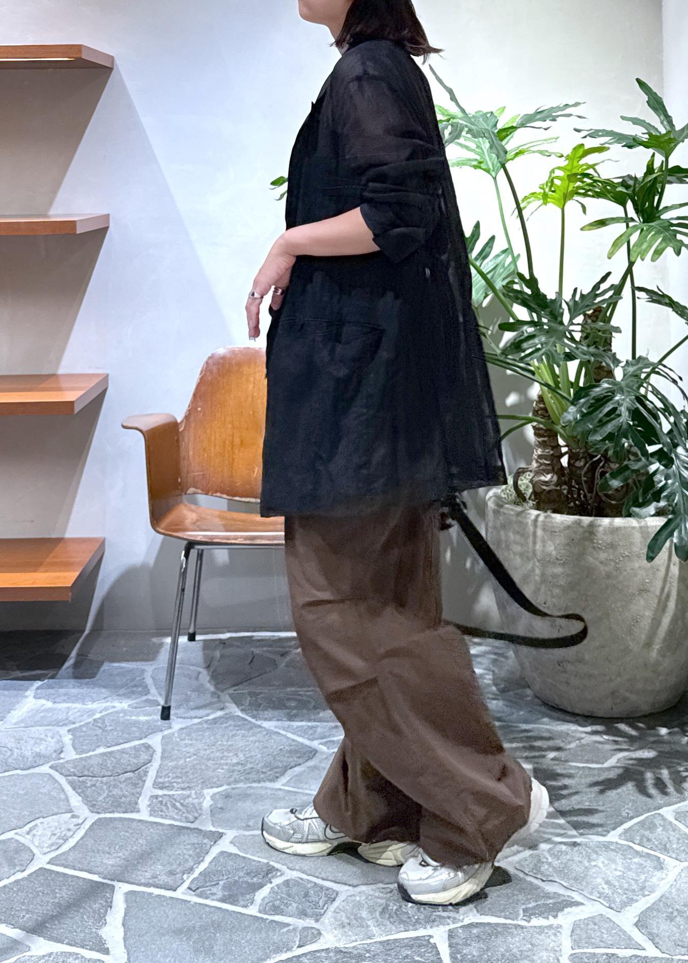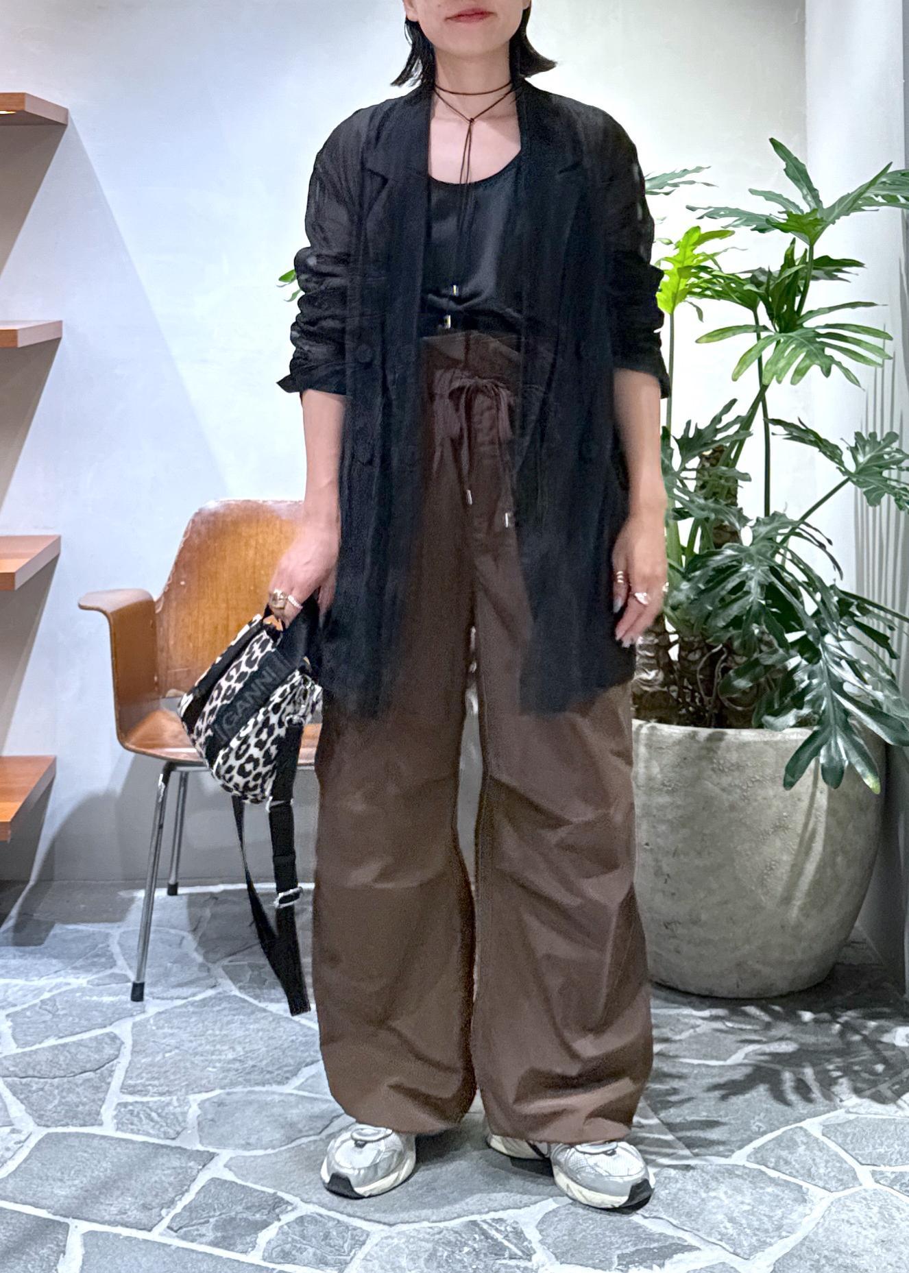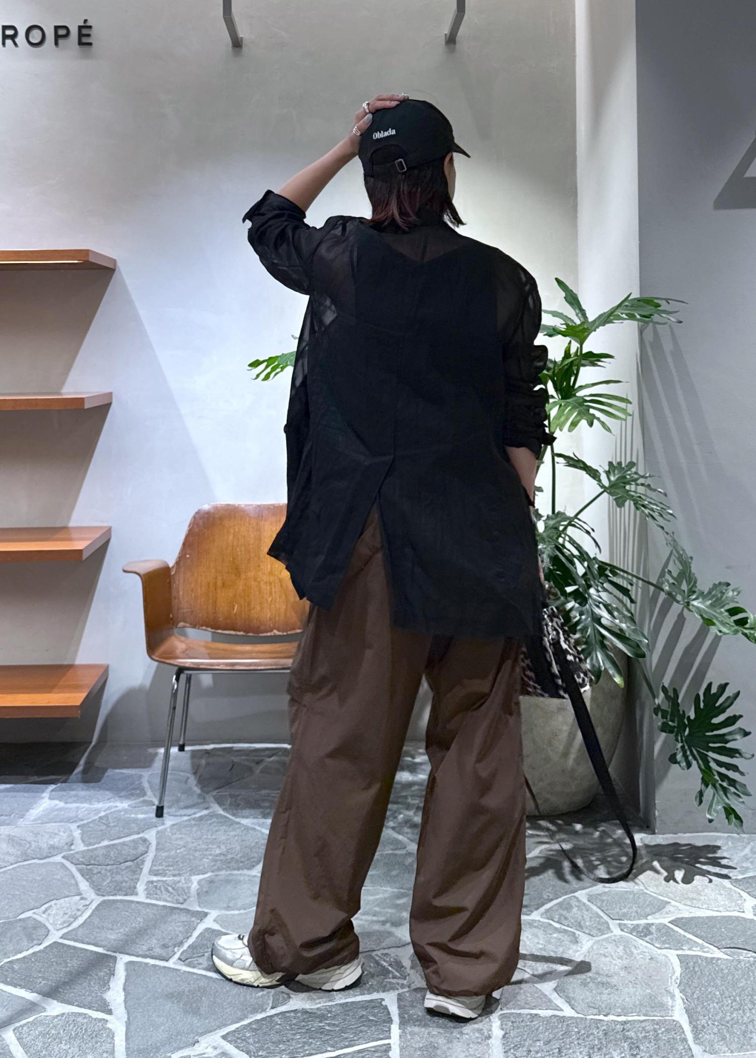 シャカっとした素材感です。ナイロン素材ですが、渡り幅がゆったりしているので、涼しく着用できます! -