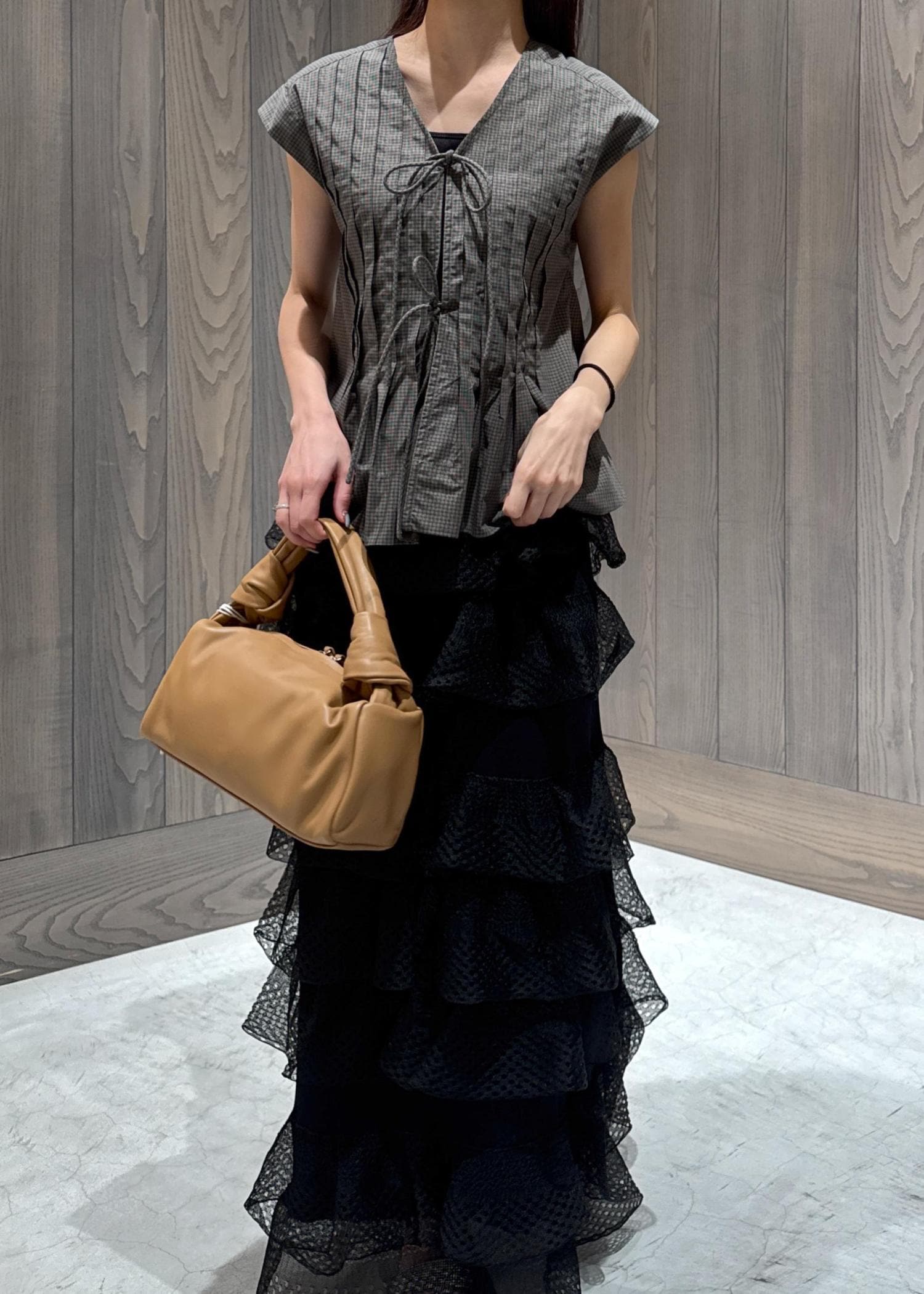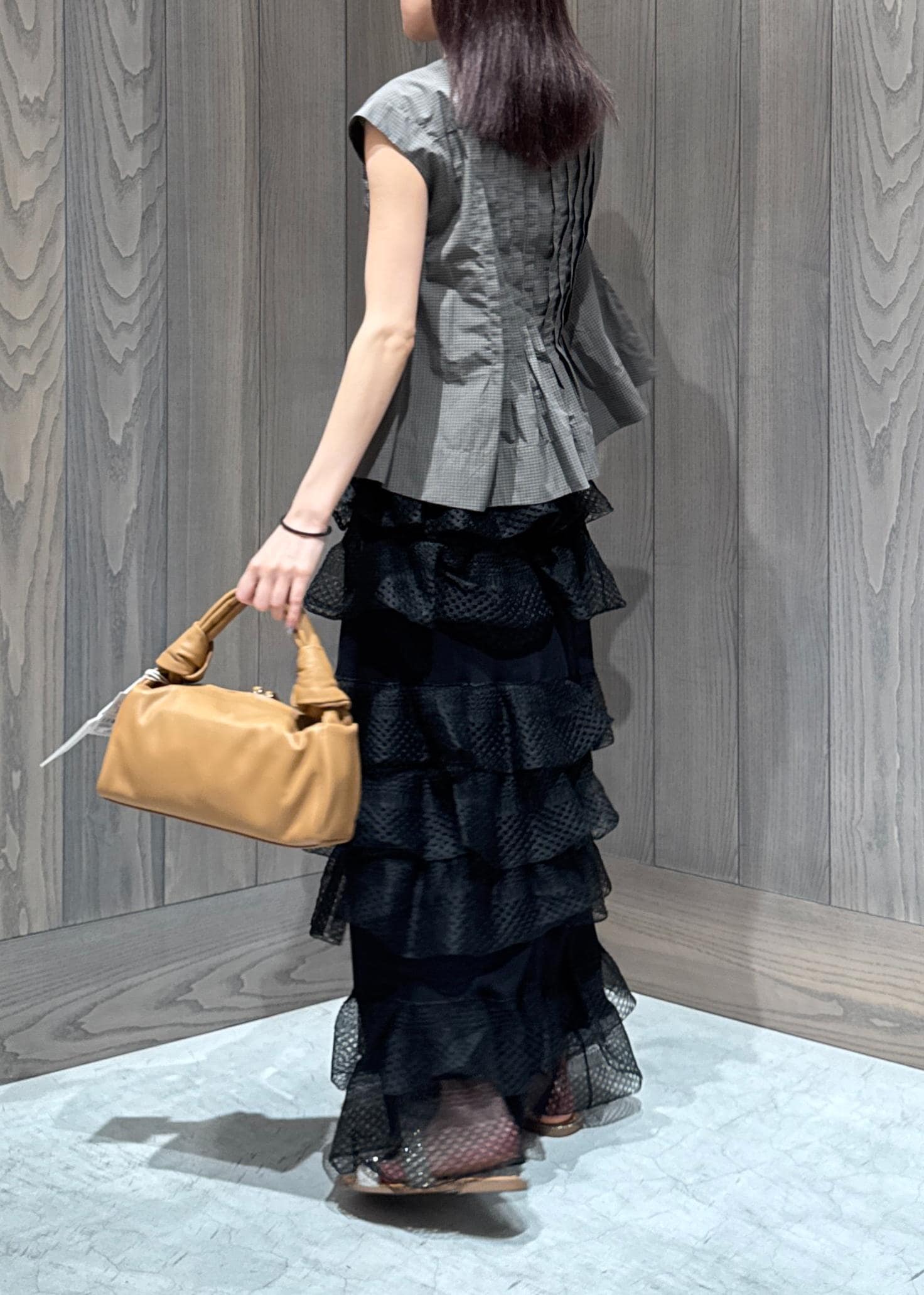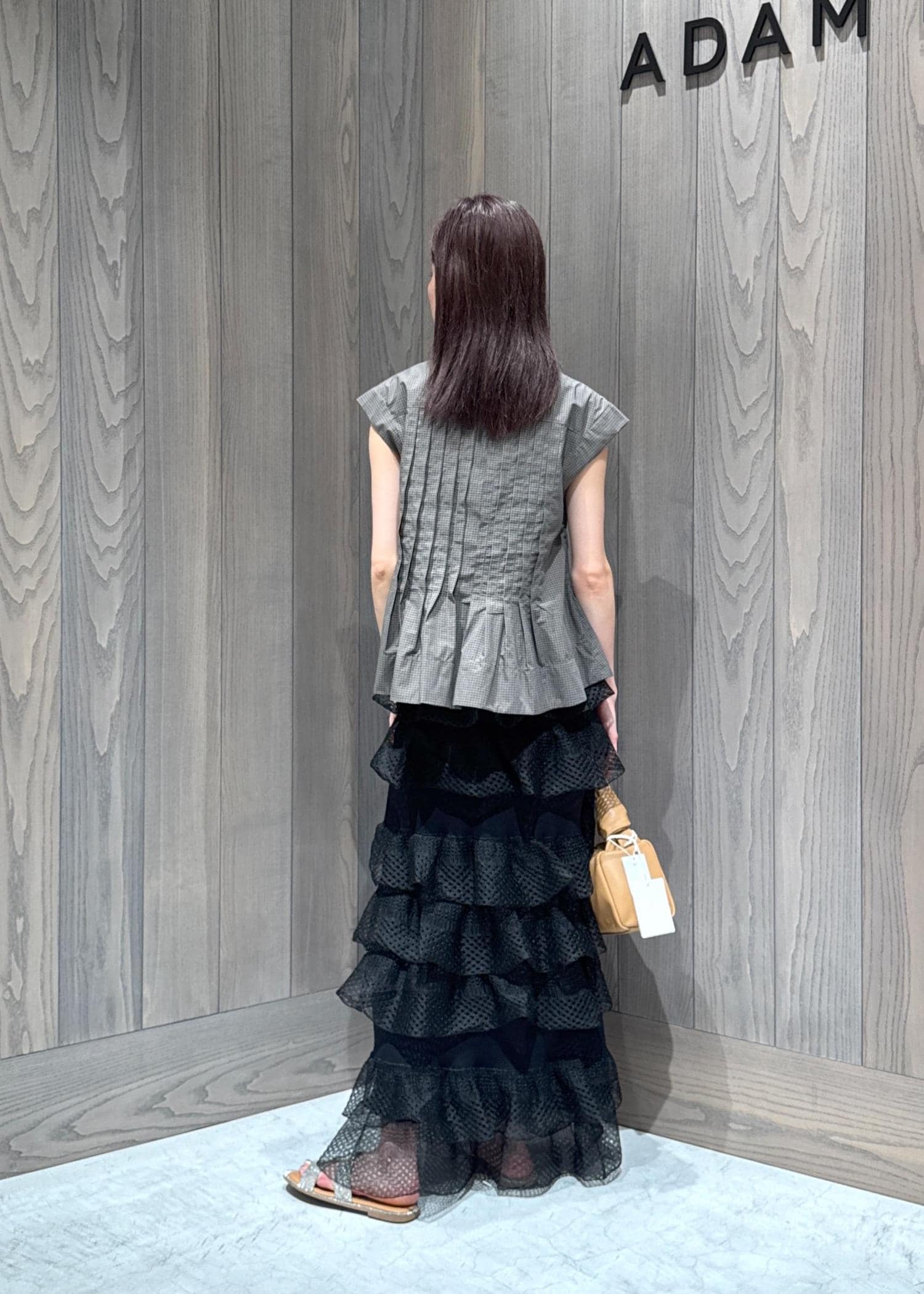 今回は、タックフレアジレブラウスとフリルスカートを合わせたコーデをご紹介いたします。