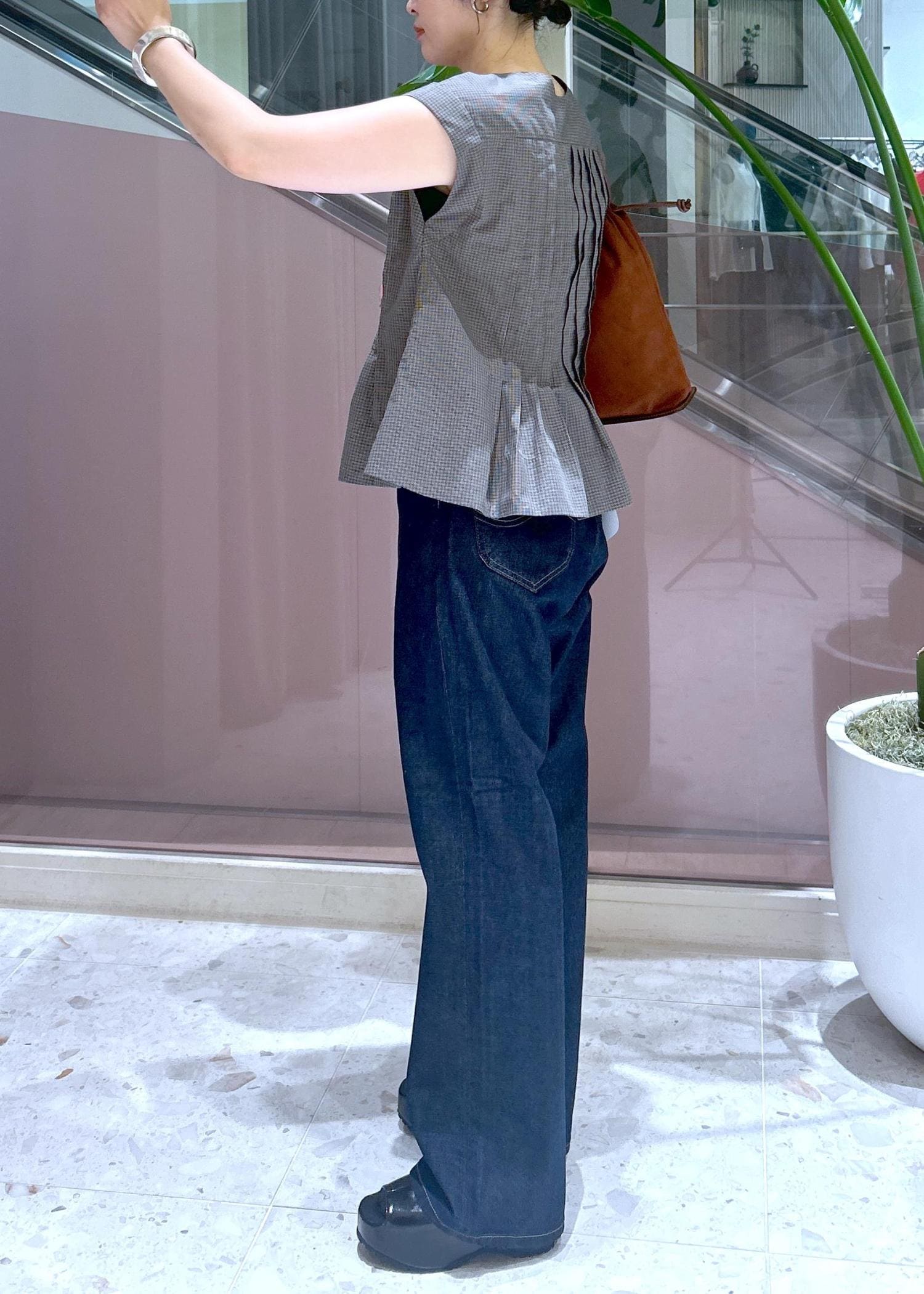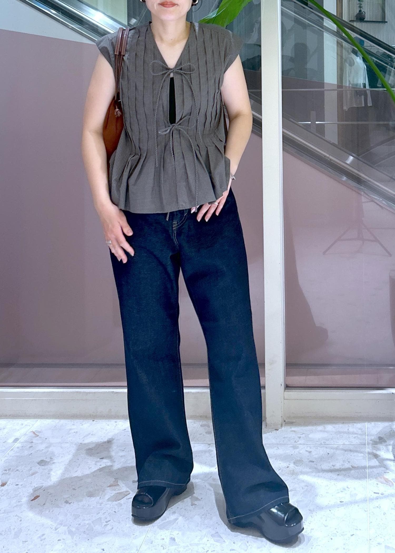 バッグも秋色をチョイスして、盛夏っぽさを卒業しました。