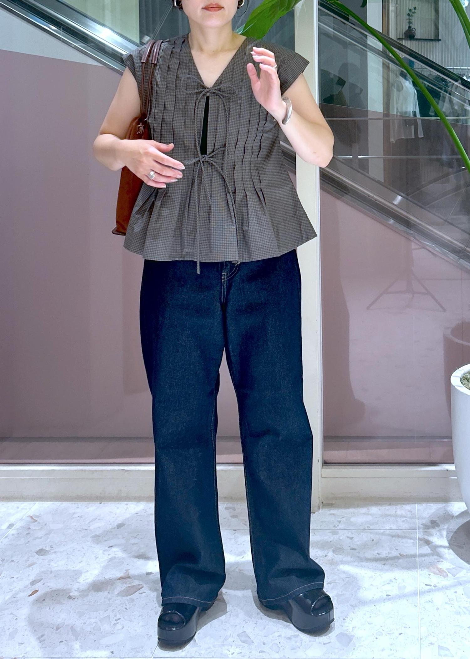 トップスはノースリーブ風の肌見せで、リアルな今の着方ですが、