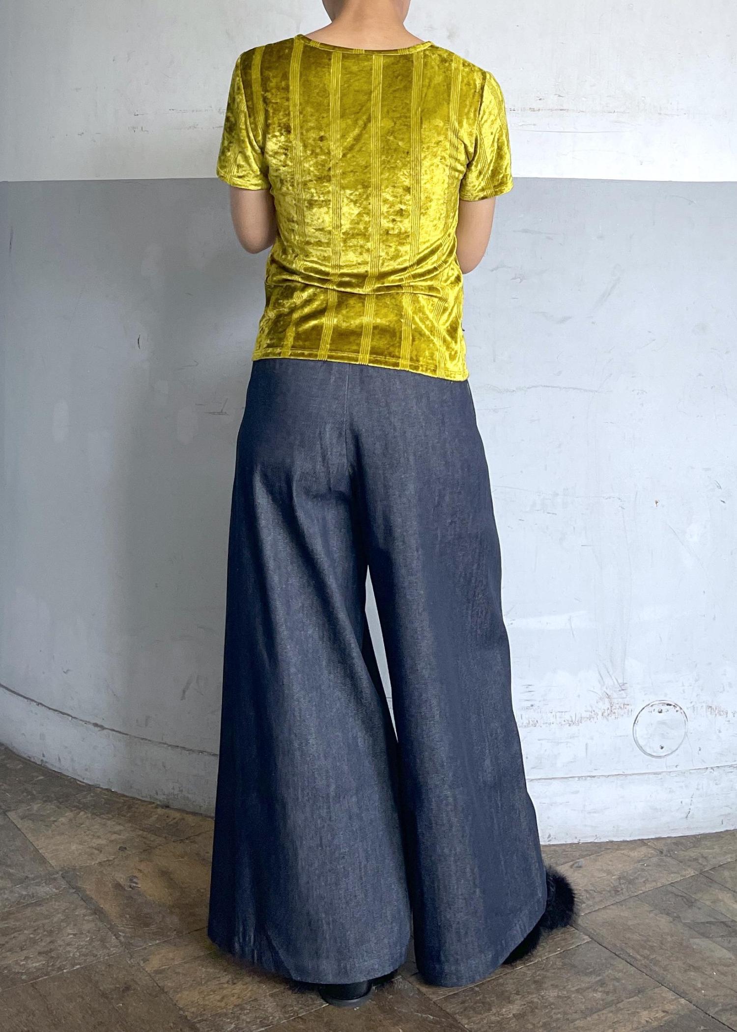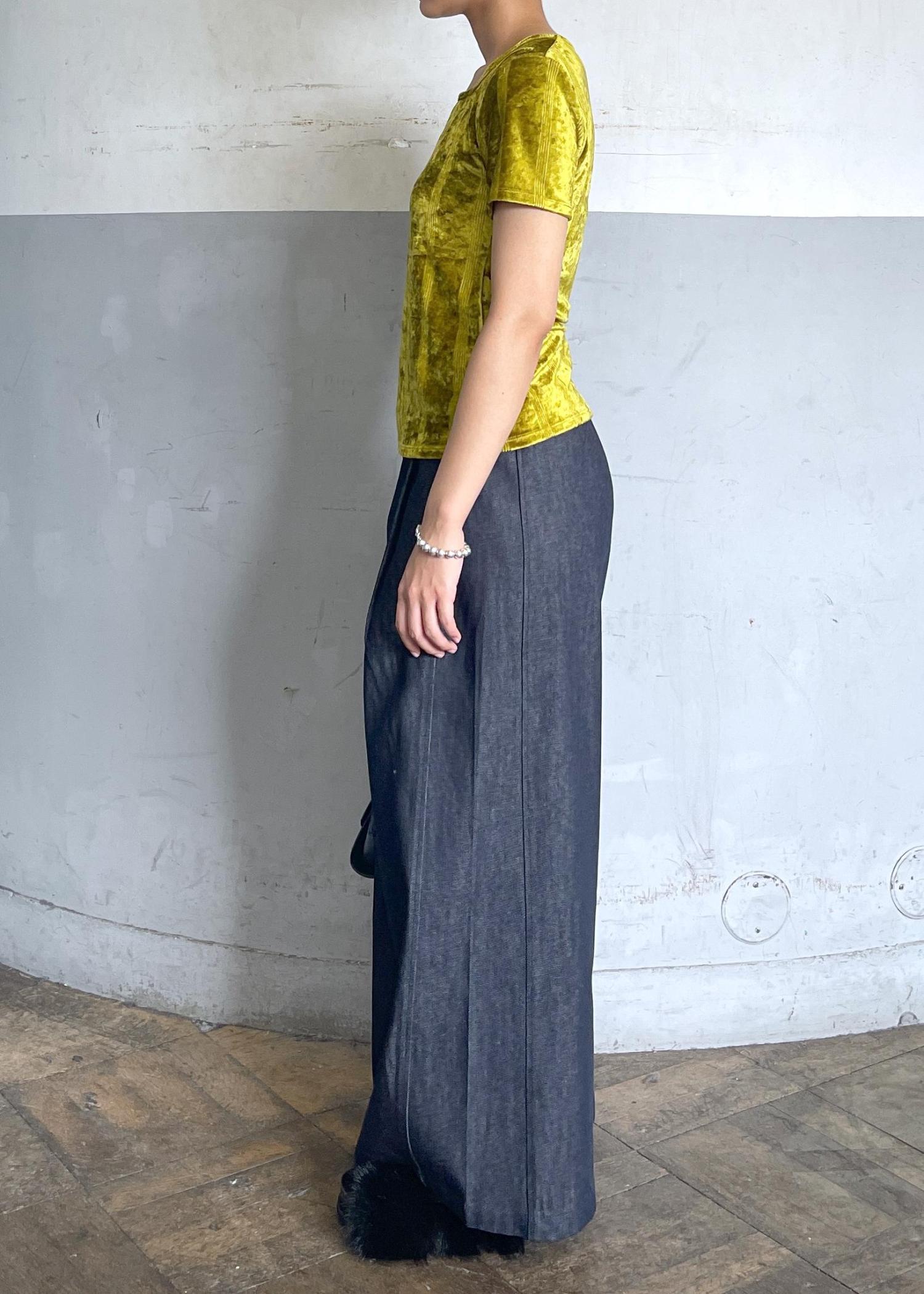 このコーディネートは、異素材の組み合わせとシルエットのバランスが魅力です。光沢のあるベロアのトップスに、暗めの色のワイドパンツを合わせることで、シンプルながら個性のある印象に仕上がっています。
