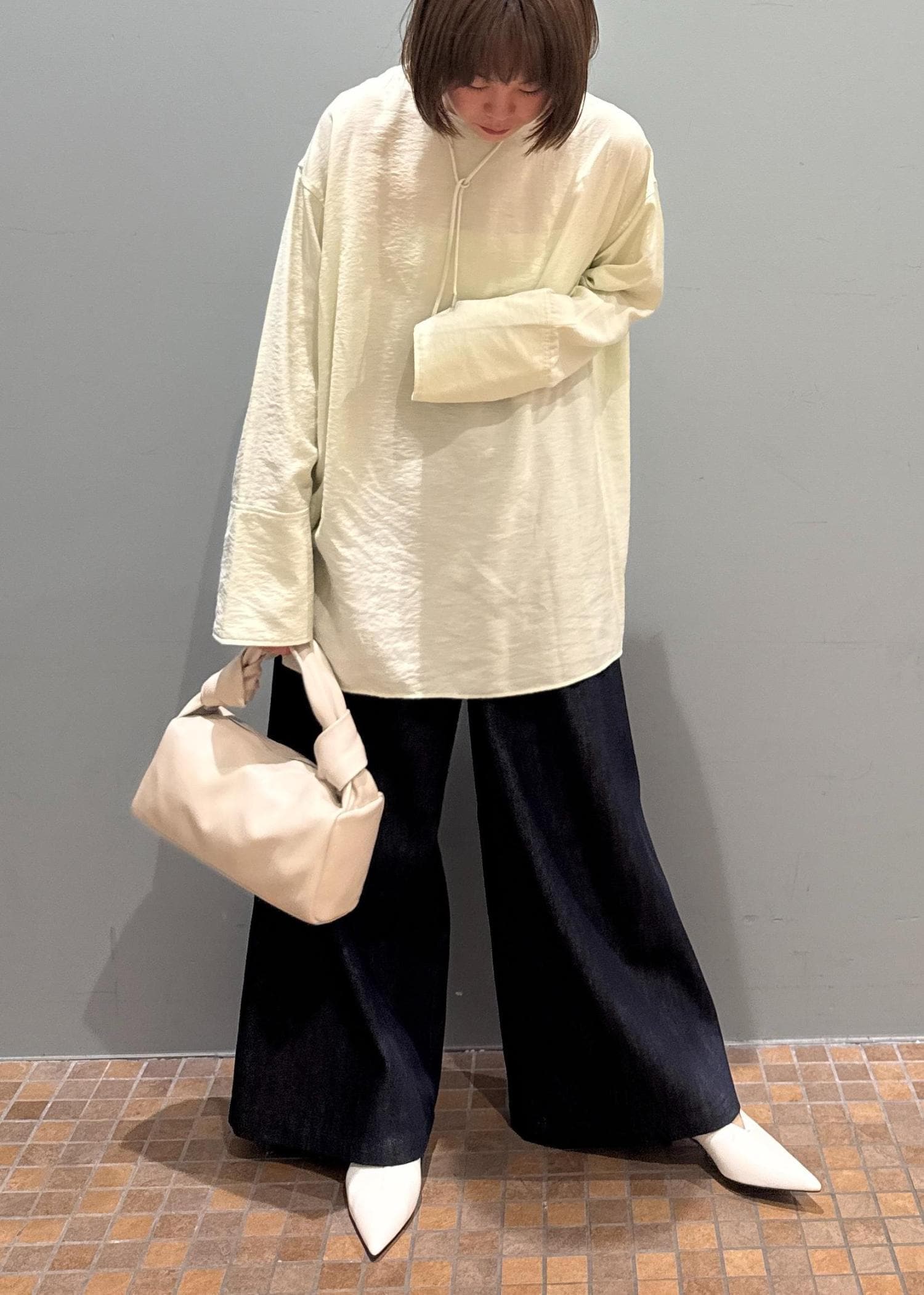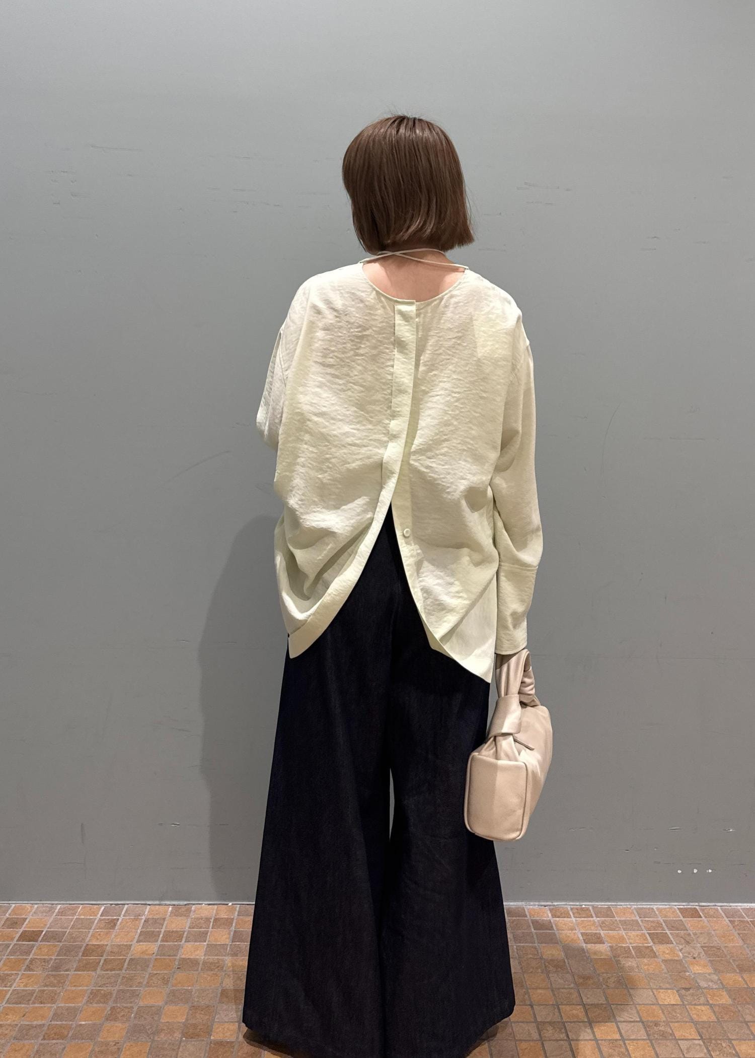 今日はボタン面を後ろにして、下から3つほど開けて抜け感のあるバックスタイルに。付属の紐は首に巻いても、そのまま垂らしてもサマになります◎