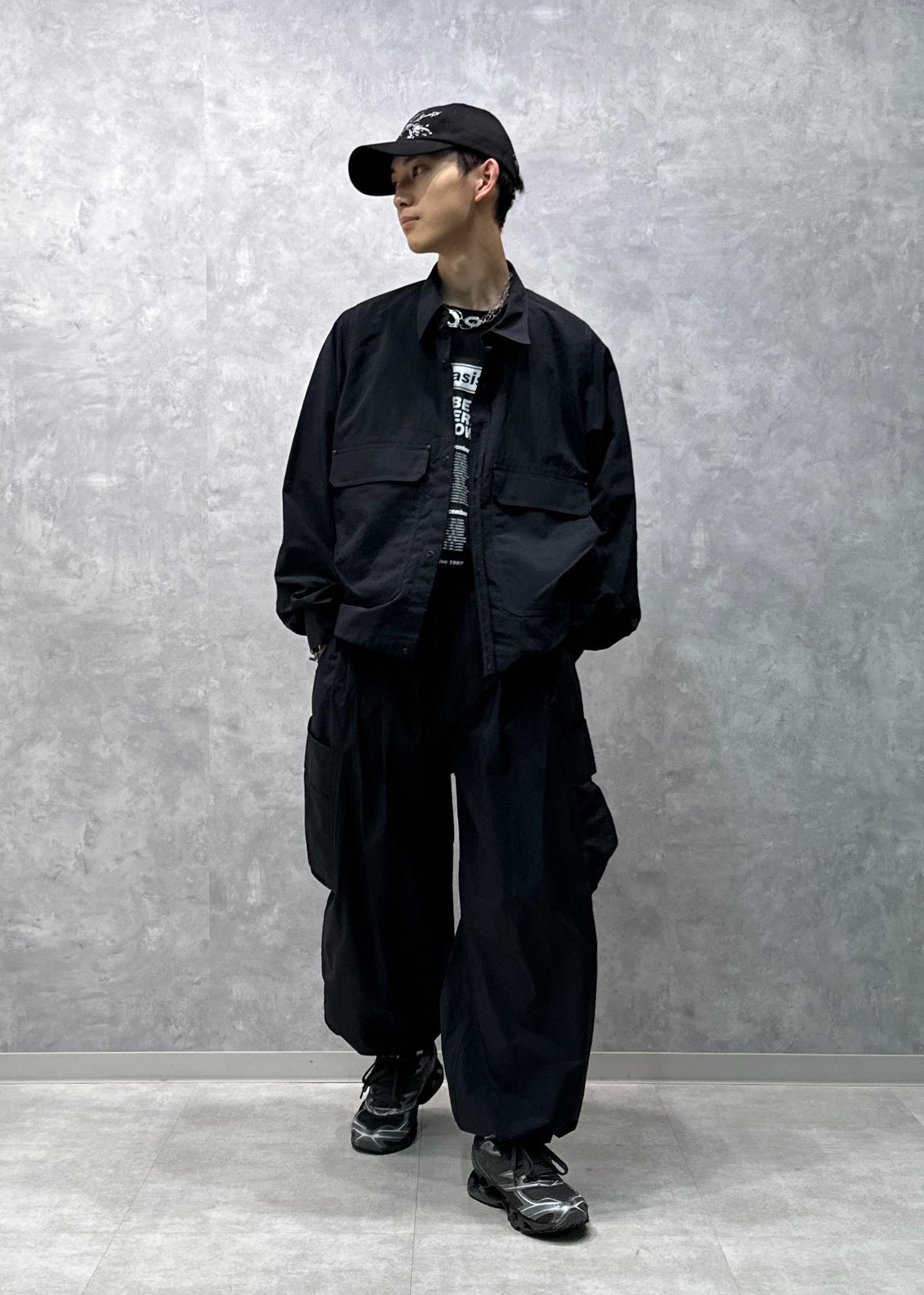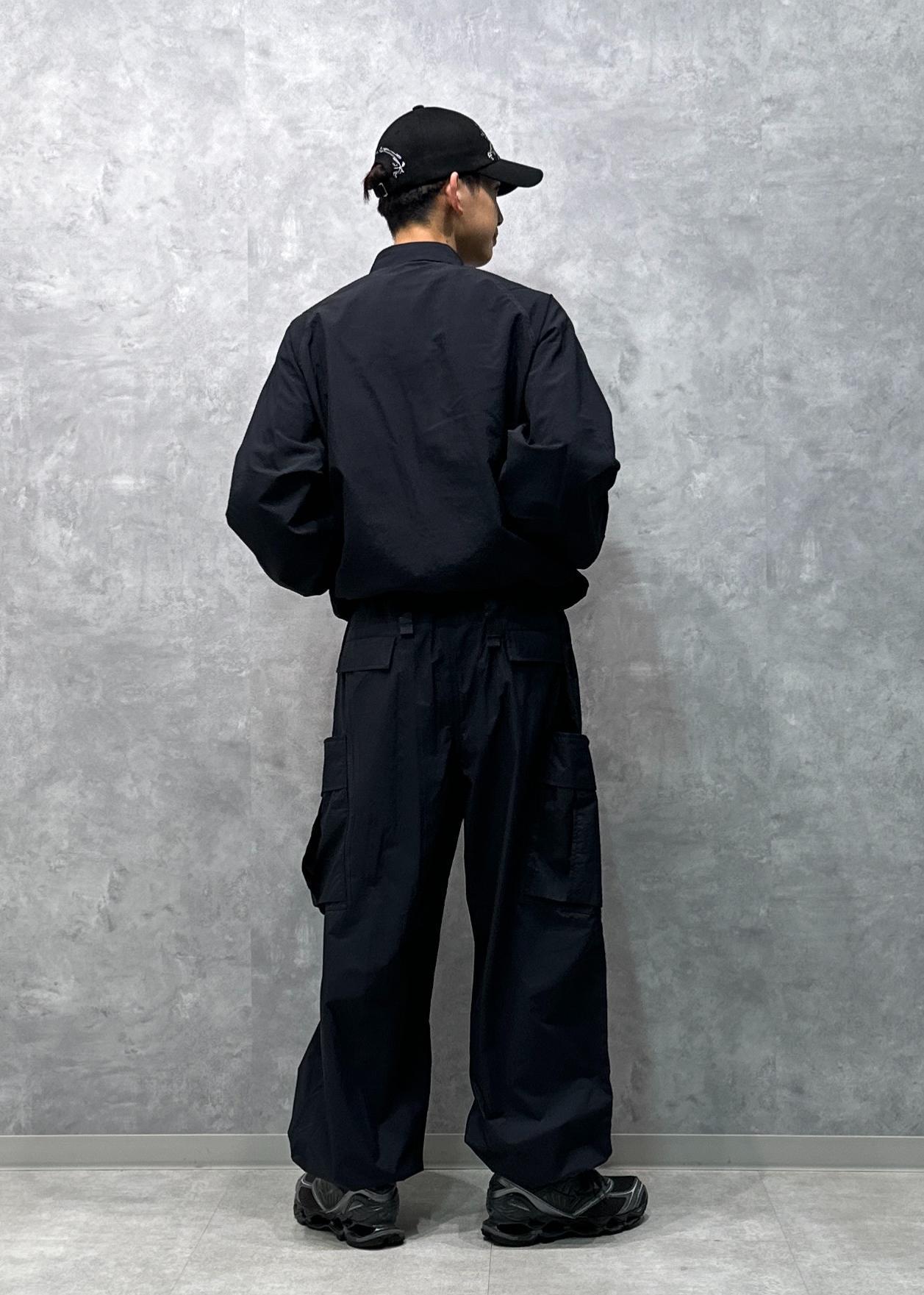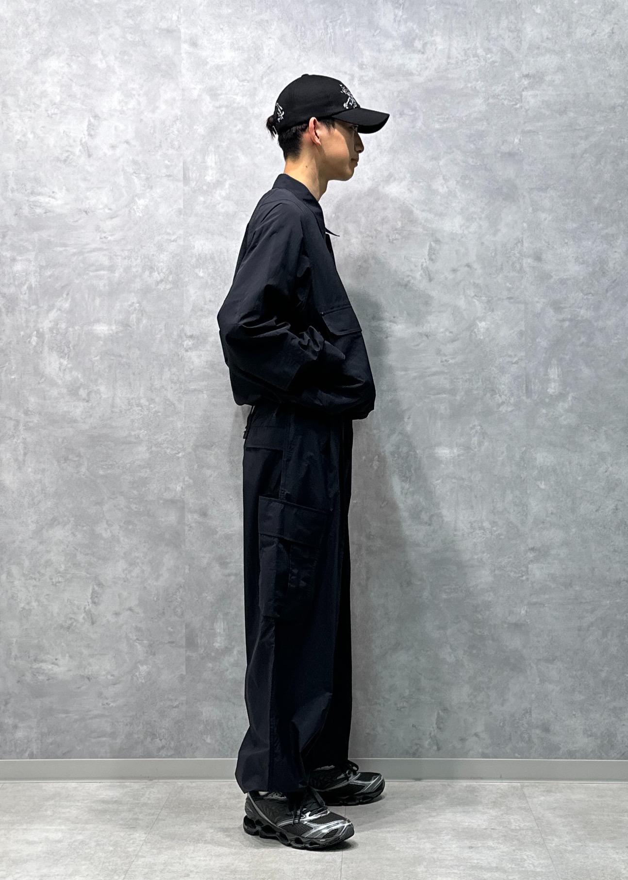 モードストリートなセットアップコーデ。ナイロンのセットアップです。太くて丸みのあるパンツ、やや短丈のブルゾンの組み合わせがたまらなく良いシルエット。肉眼で見ると真っ黒すぎず、少しネイビーかかって見えます。結構軽やかな着心地で動きやすいです。