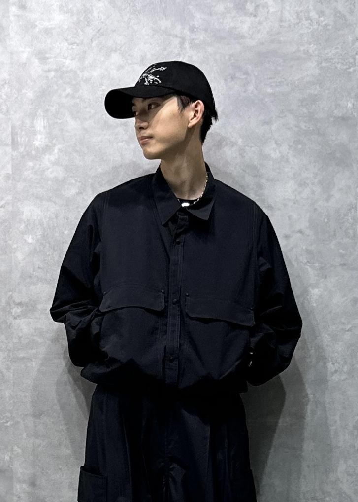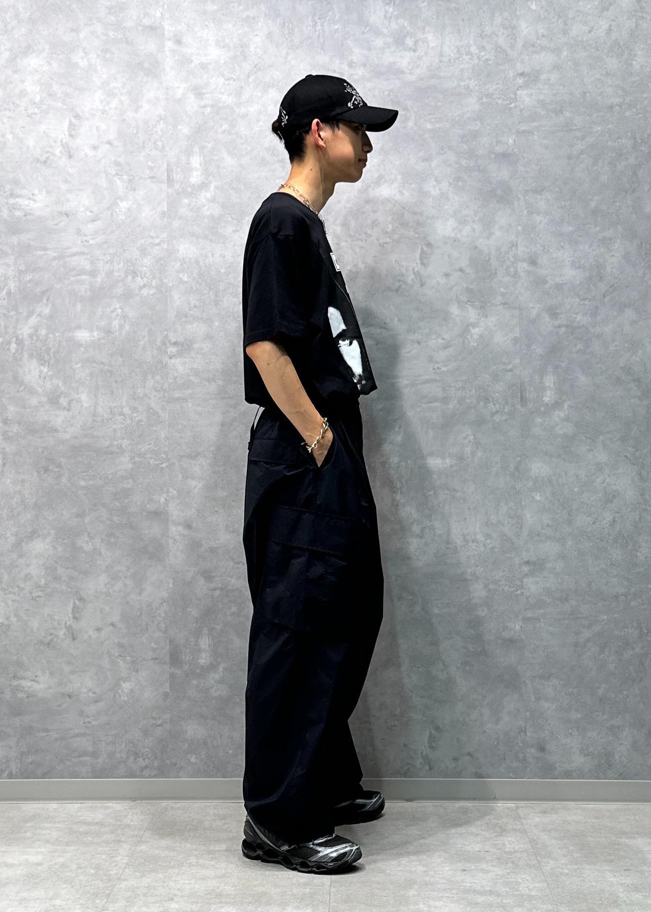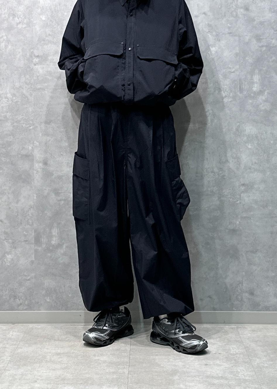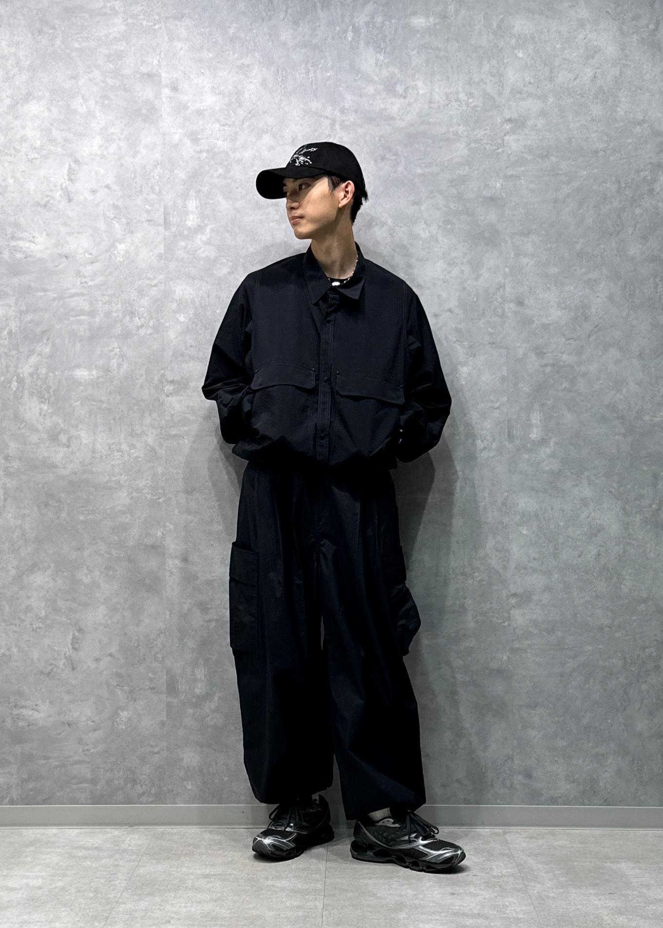 モードストリートなセットアップコーデ。ナイロンのセットアップです。太くて丸みのあるパンツ、やや短丈のブルゾンの組み合わせがたまらなく良いシルエット。肉眼で見ると真っ黒すぎず、少しネイビーかかって見えます。結構軽やかな着心地で動きやすいです。