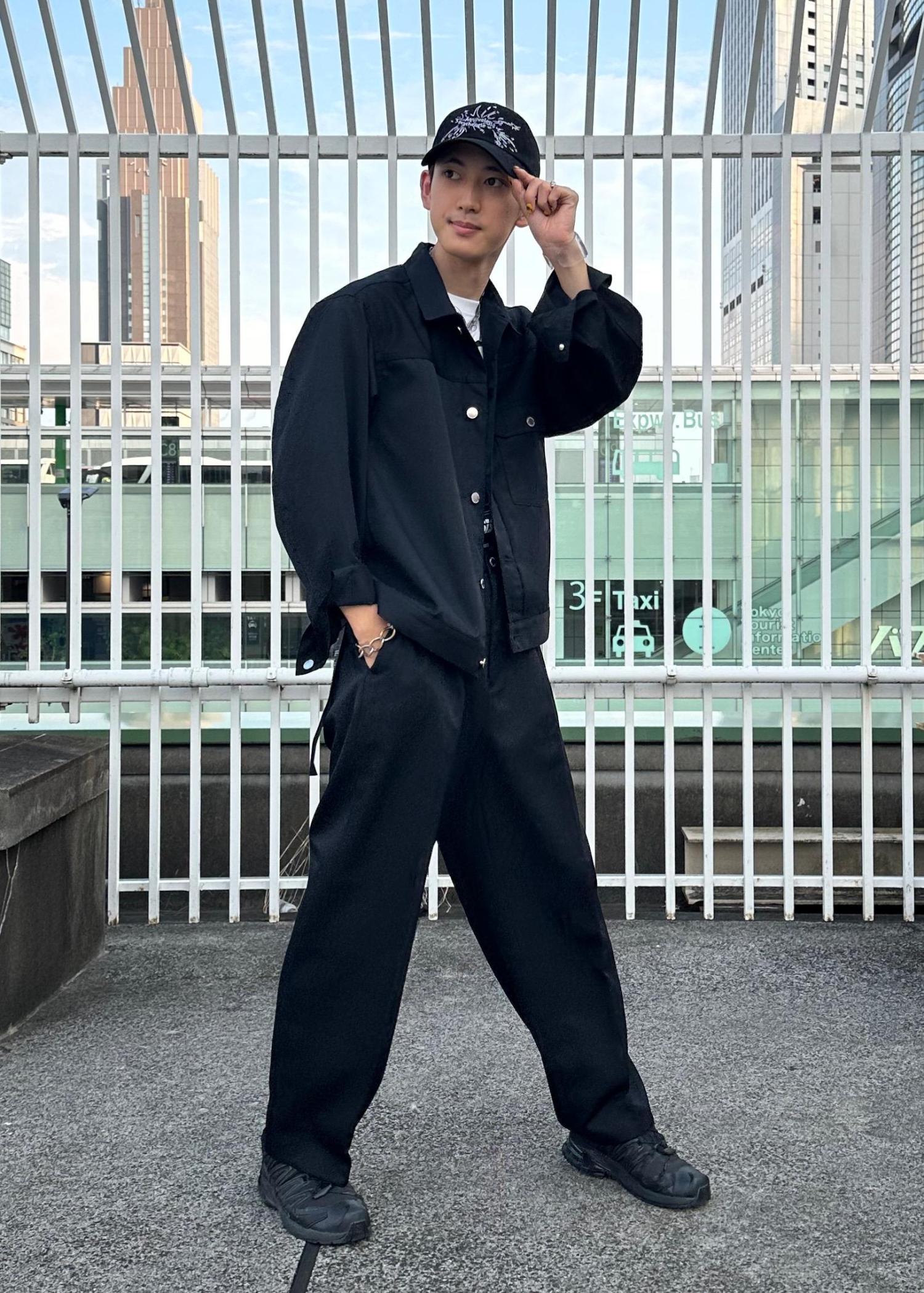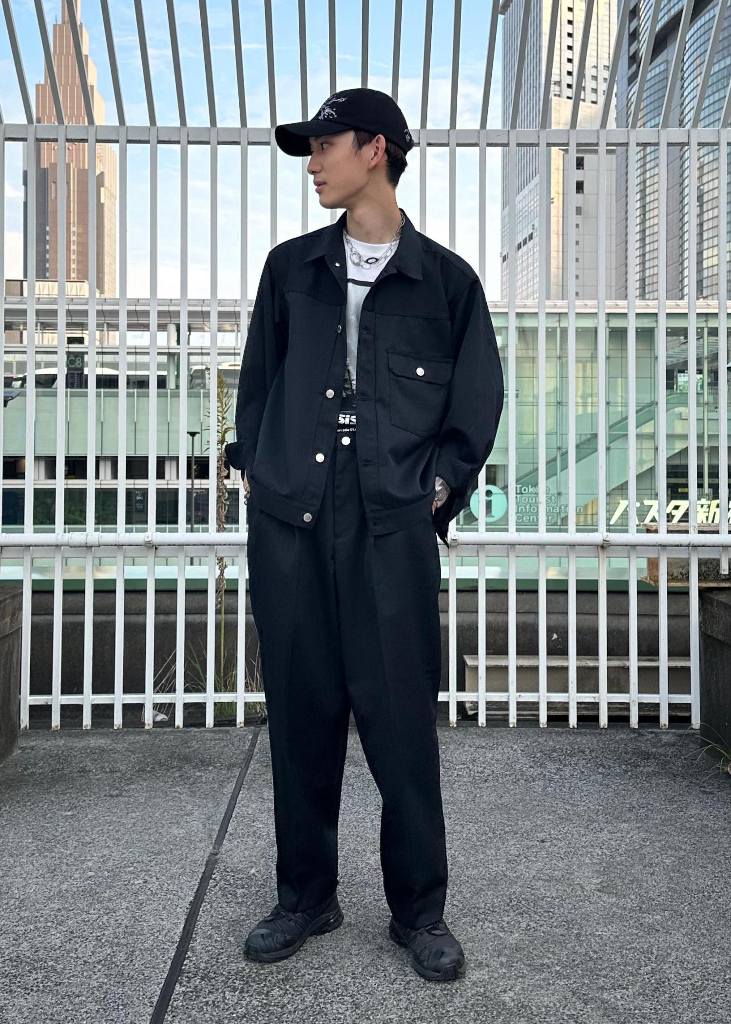 キレイめ寄りな雰囲気のデニムライクな素材のセットアップを使ったコーデです。Tシャツ、スニーカー、キャップでカジュアルな着こなしにしました。上品さを残しつつ、ラフにカジュアルに仕上げました。