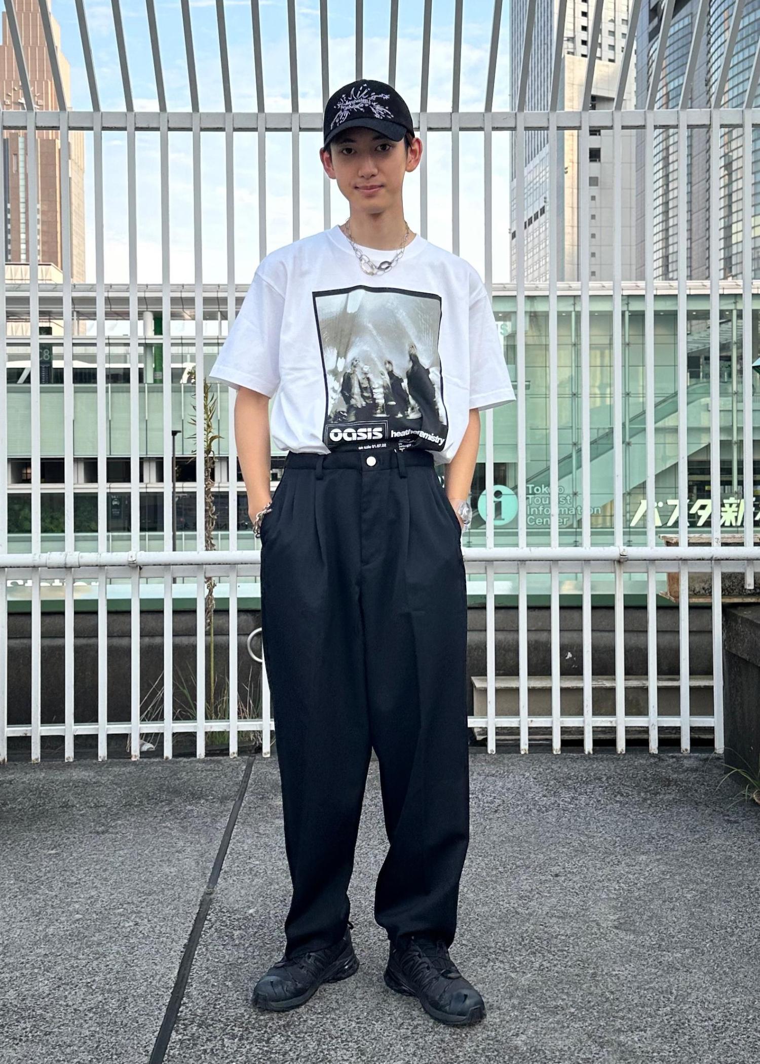 oasisTシャツ。ゆとりのあるサイズ感で丈は長めです。丈長いのが苦手な方はジャストサイズで選ぶのがおすすめです。バックプリントの文字もシンプルでかっこいいです。