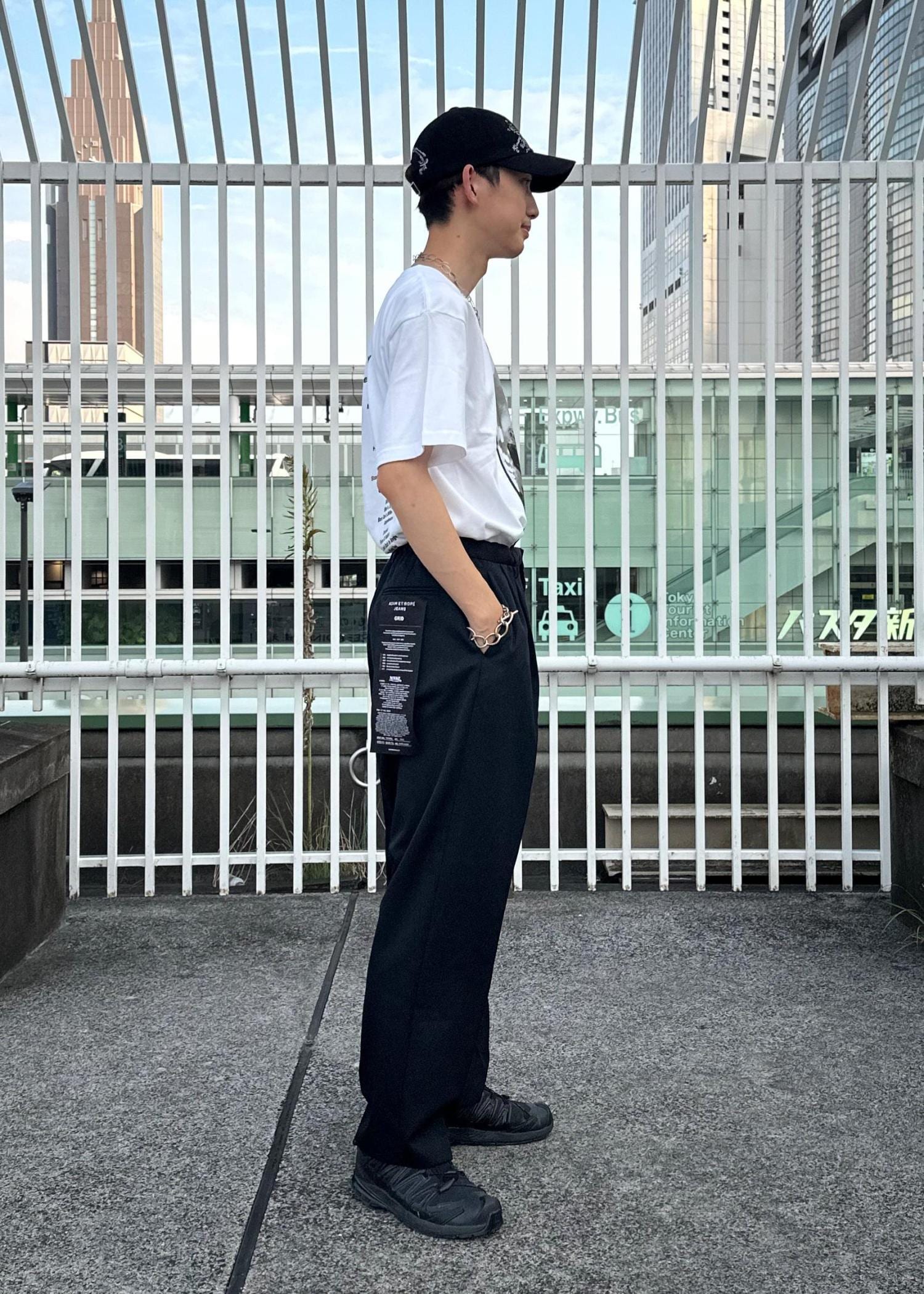 内側に紐がついていてウェスト調節が楽ちんです。タックが入っており、ワイドシルエットです。足元はダボっとしていないので、ワイドながらもスタイリッシュです。デニムライクな質感で、艶があり、とても上品見えします。きれいめにもカジュアルにも馴染む、汎用性に優れた一着です。