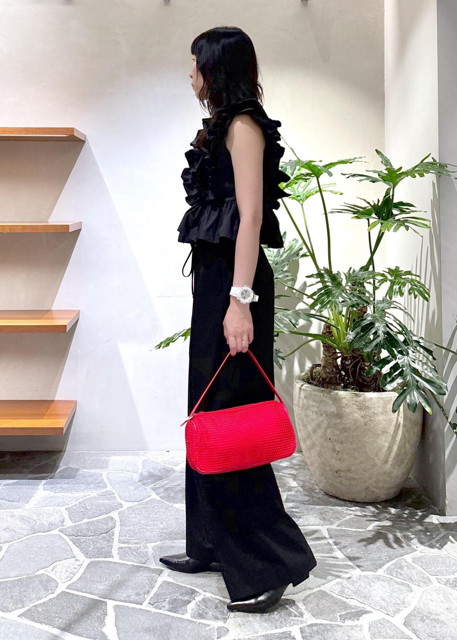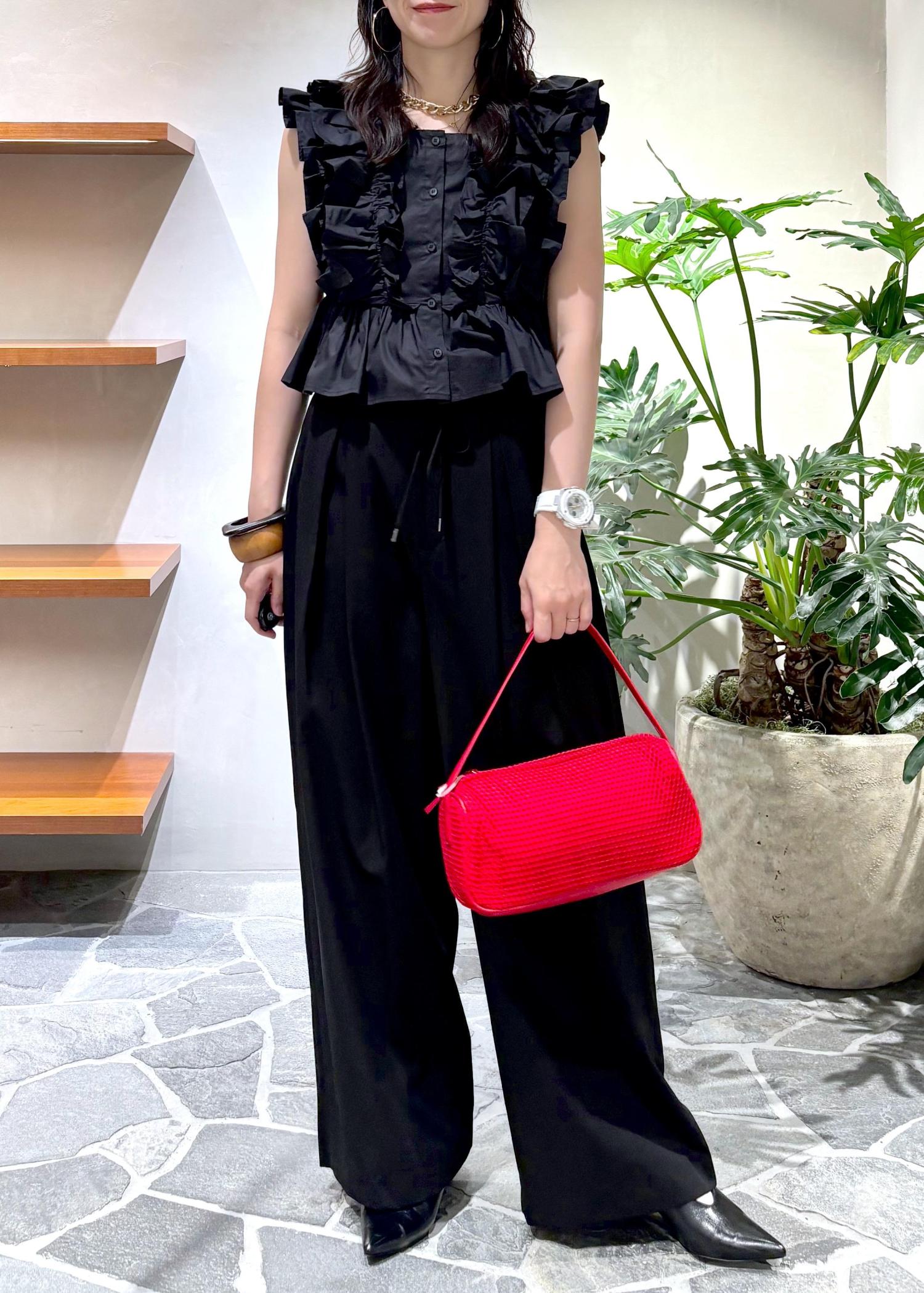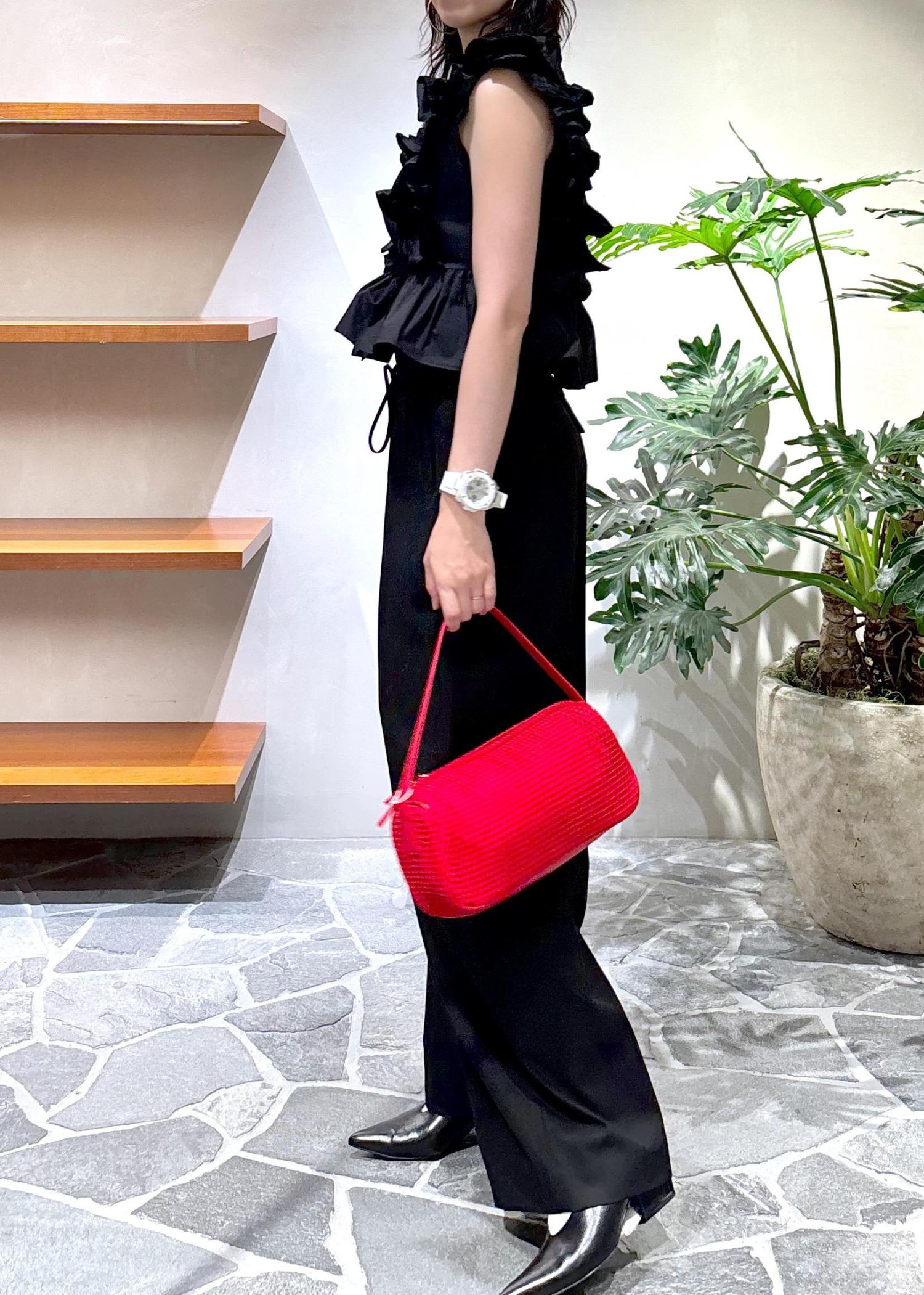 ブラックコーデなので、赤のバッグを差し色にしました。