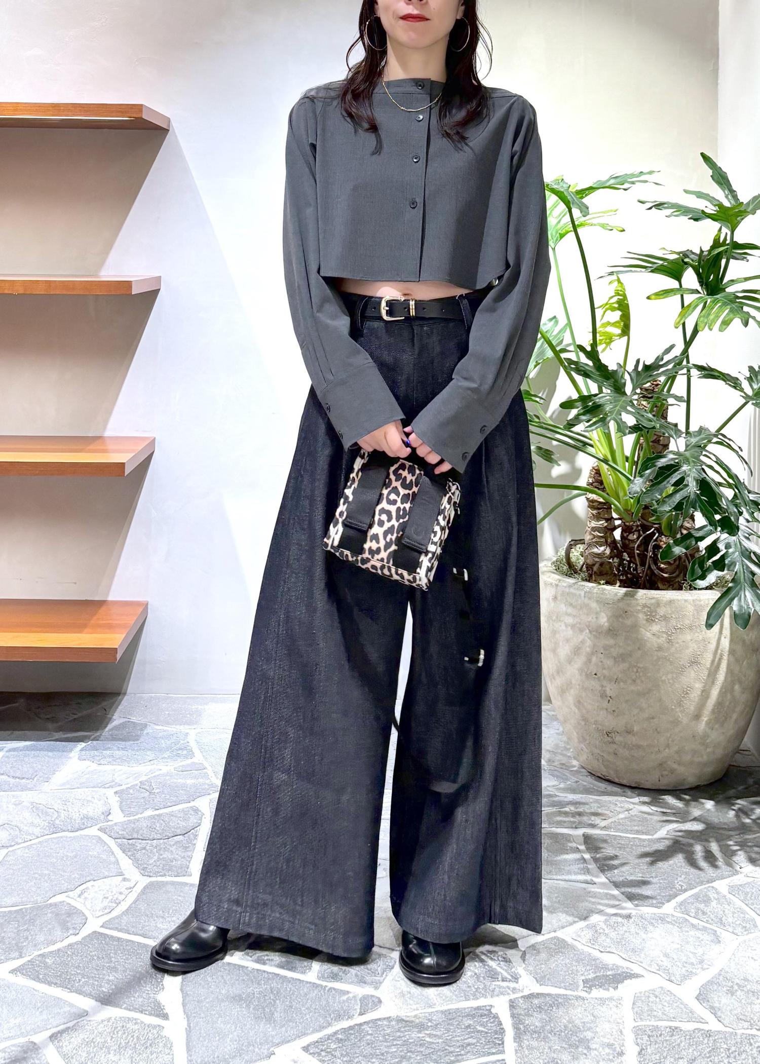 シャツは一枚で着ると脇腹が見えるショート丈。