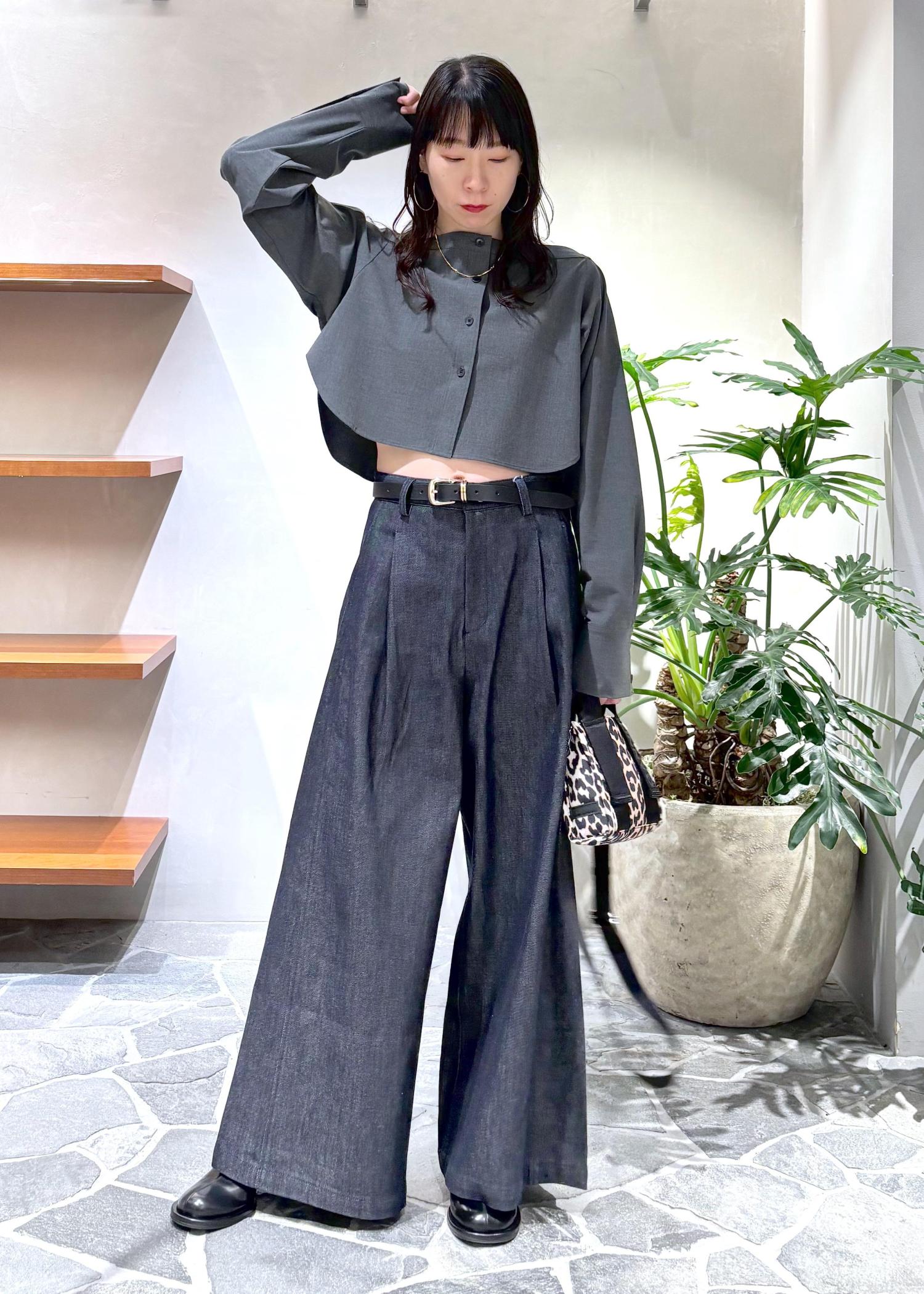 シャツのみのスタイリングはかなり短めなので思い切ってウエストを見せてしまうのもオススメ!