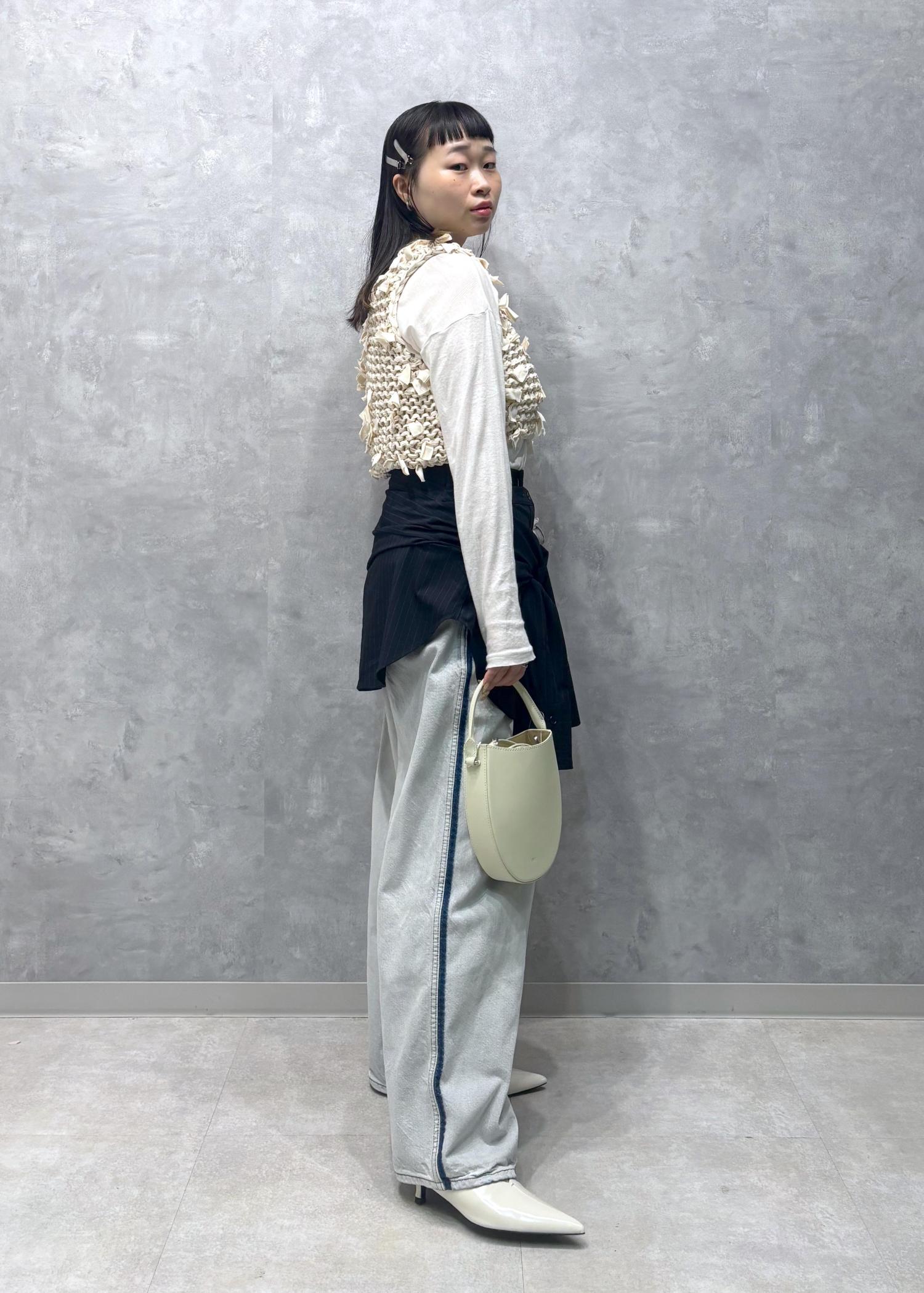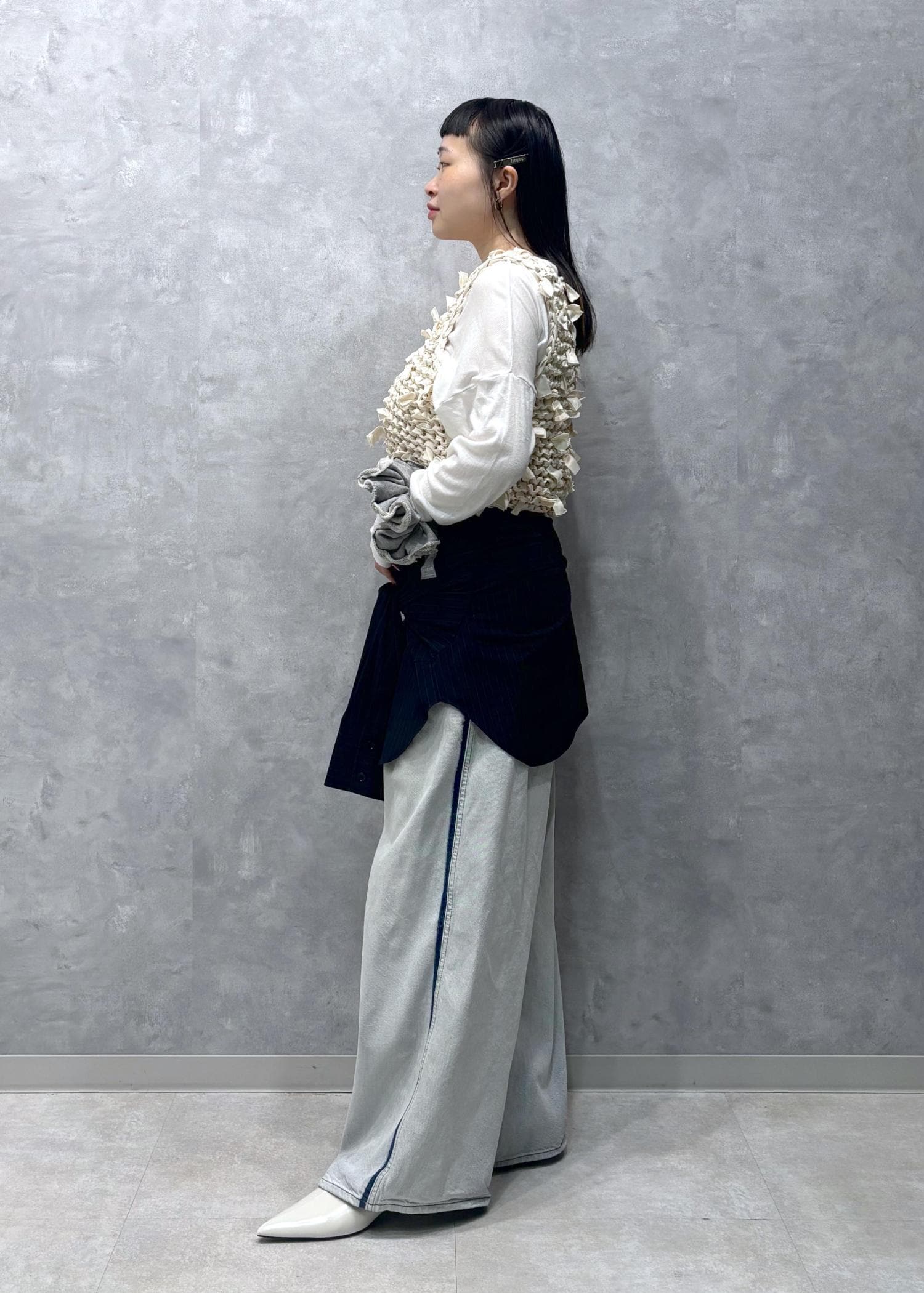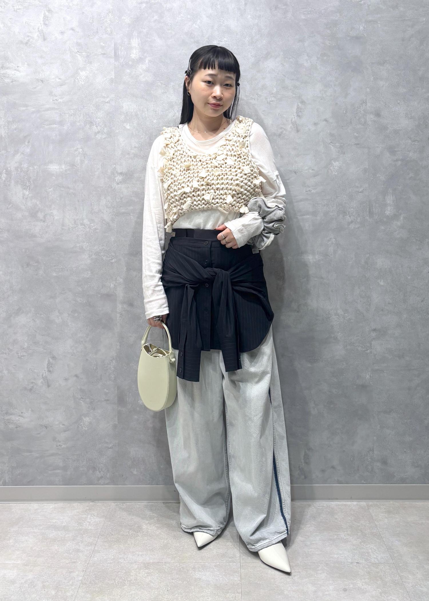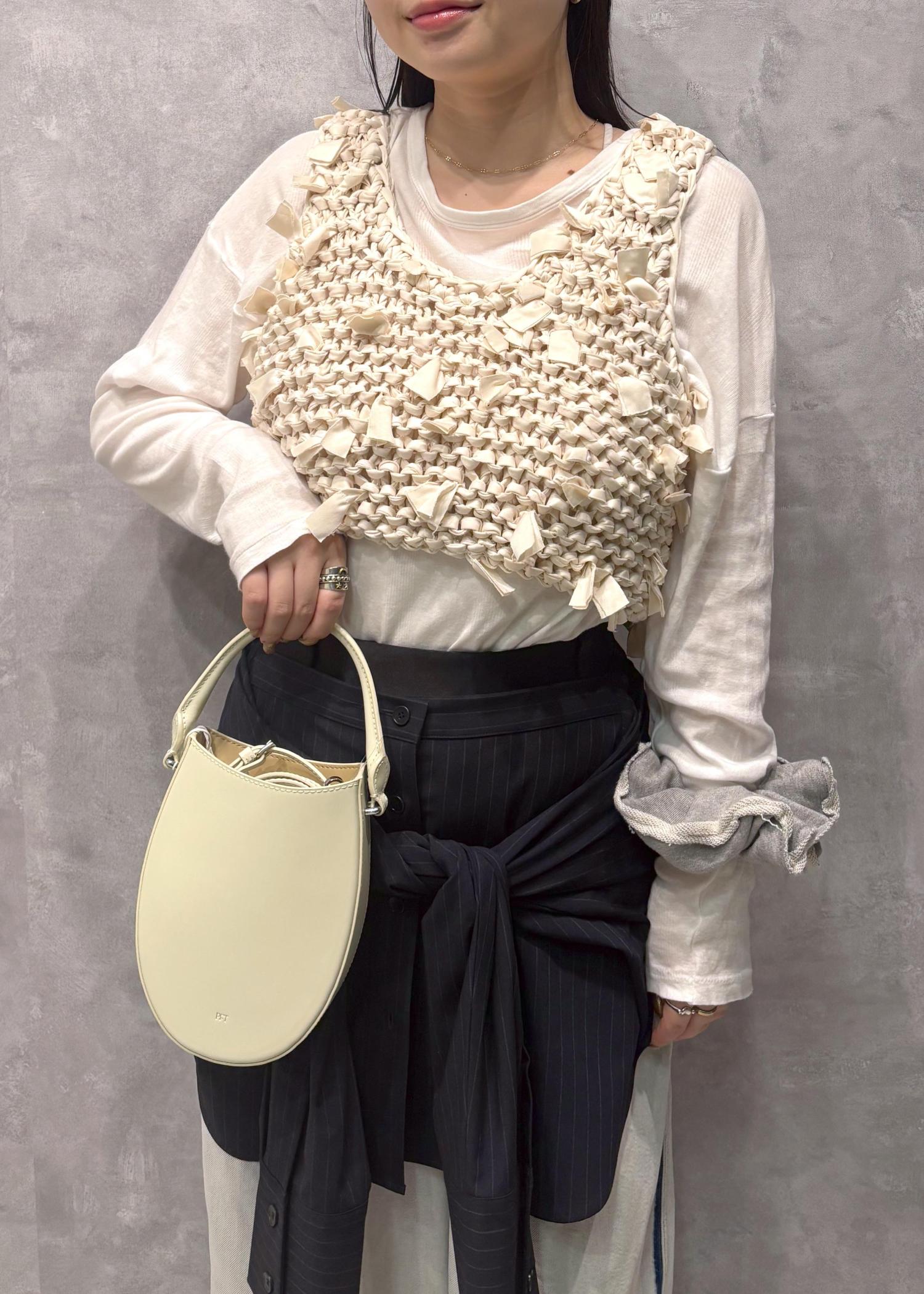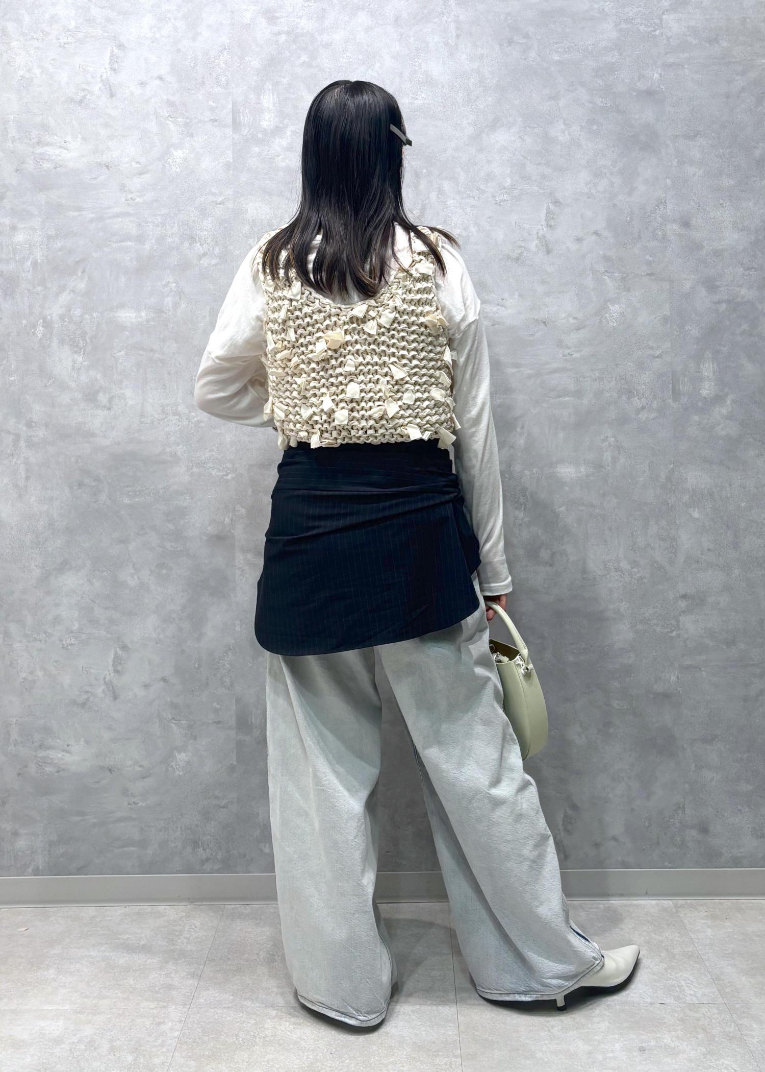 ADAM ET ROPÉ FEMMEテープヤーンベストキナリ / F¥26,400レビュー柔らかくクシャッとした素材感が面白いベストです!想像していたより軽くストレスなく着られました。短丈なので太めのボトムスとも相性が良いです◎
