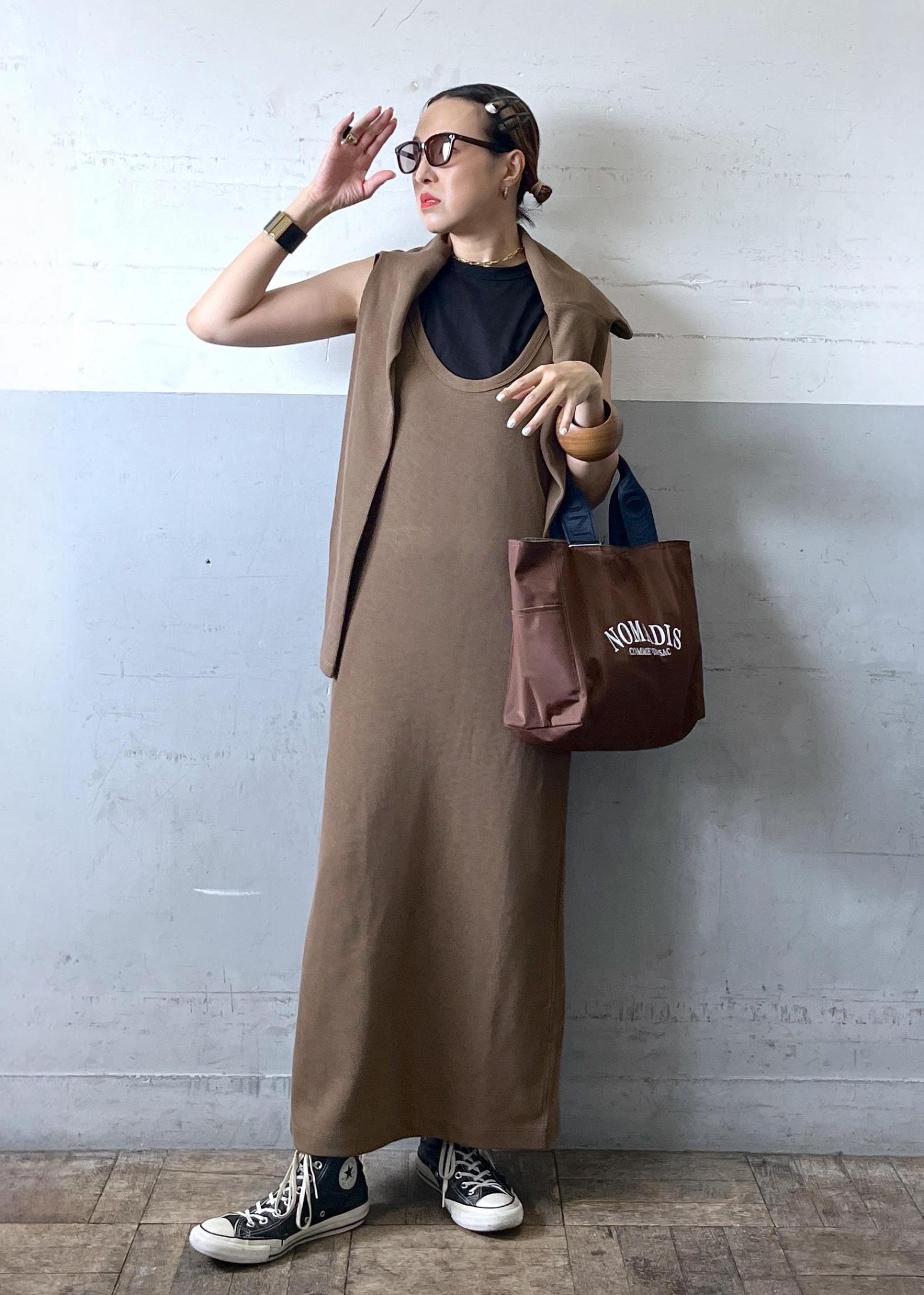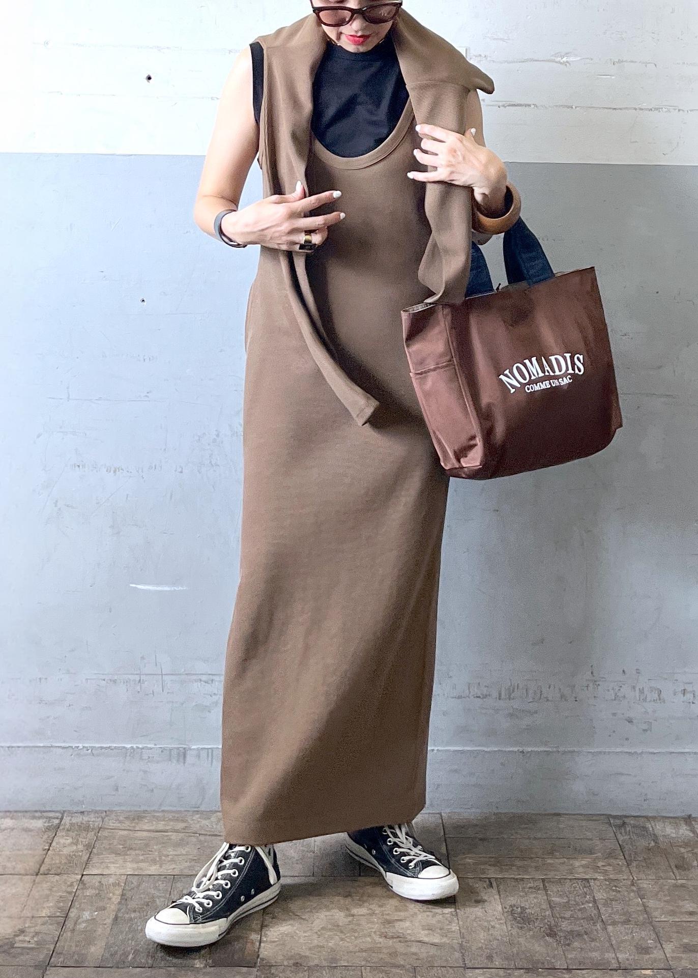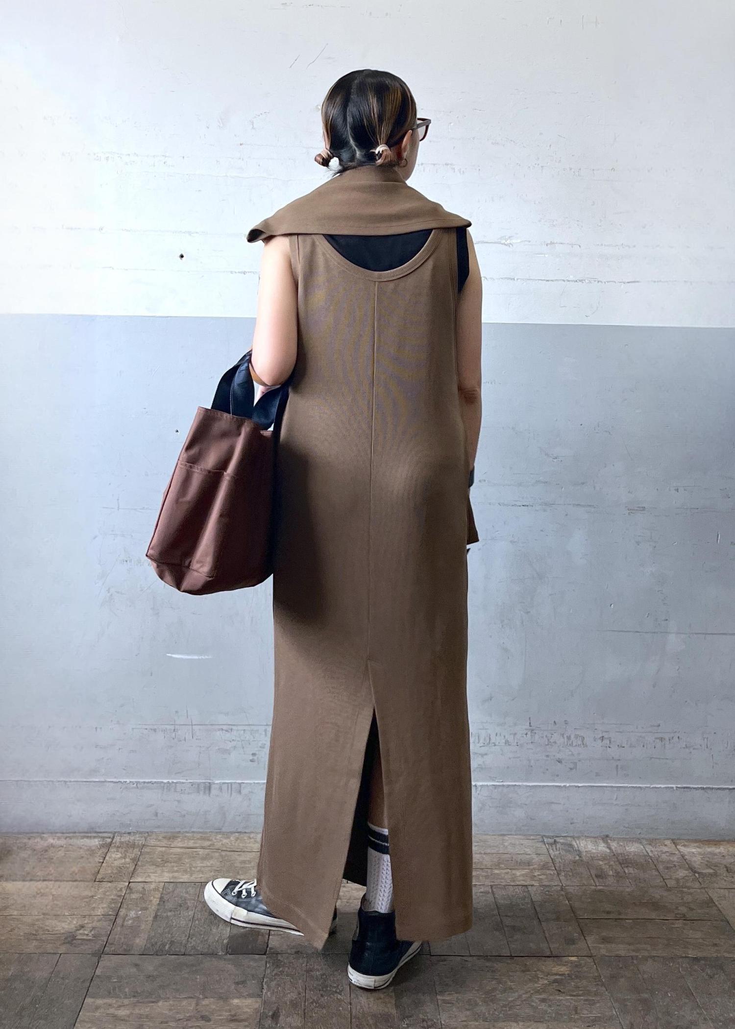 ノースリーブのシンプルワンピースに長袖のショートトップスがセットになったお得感感じるアイテム。