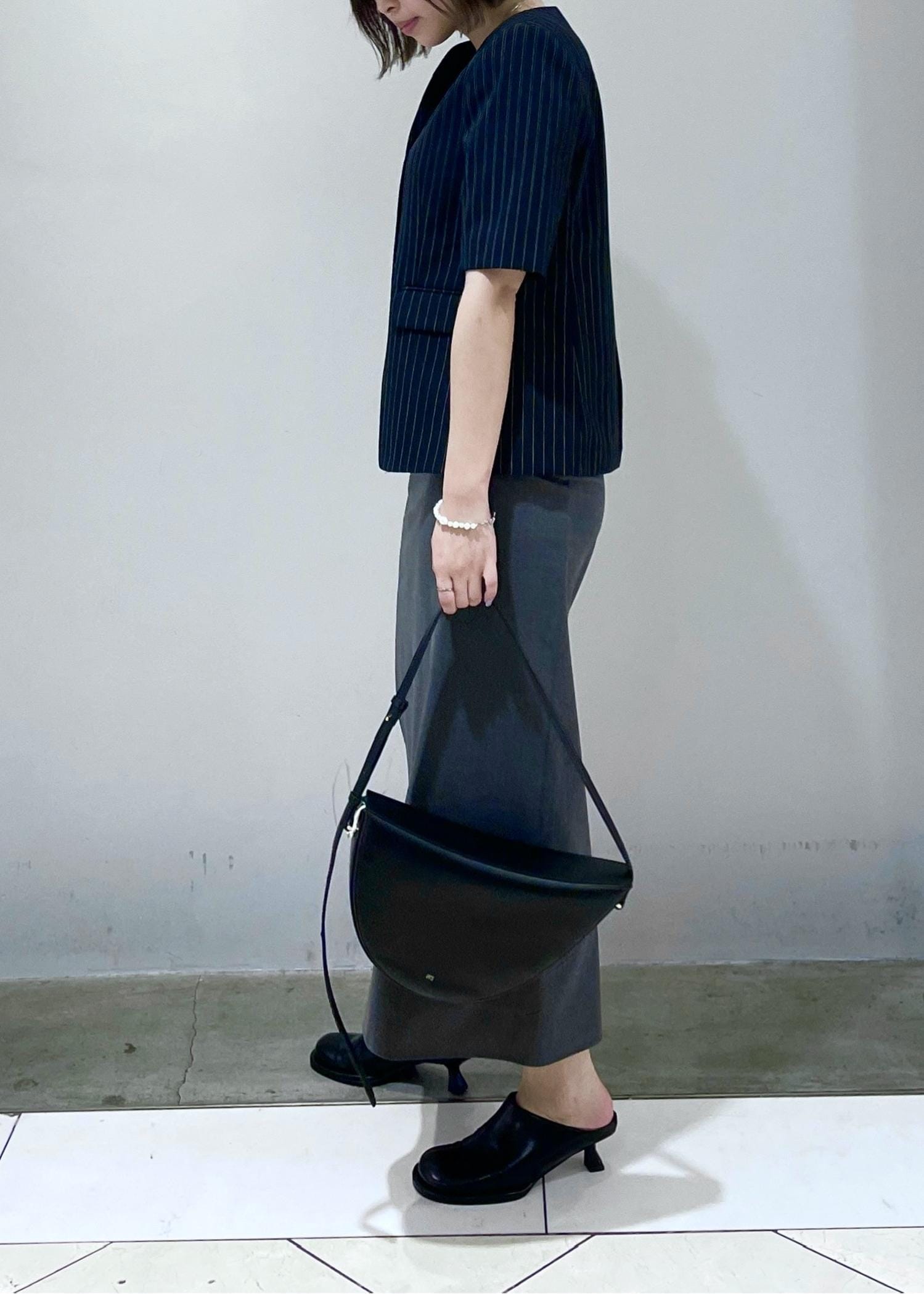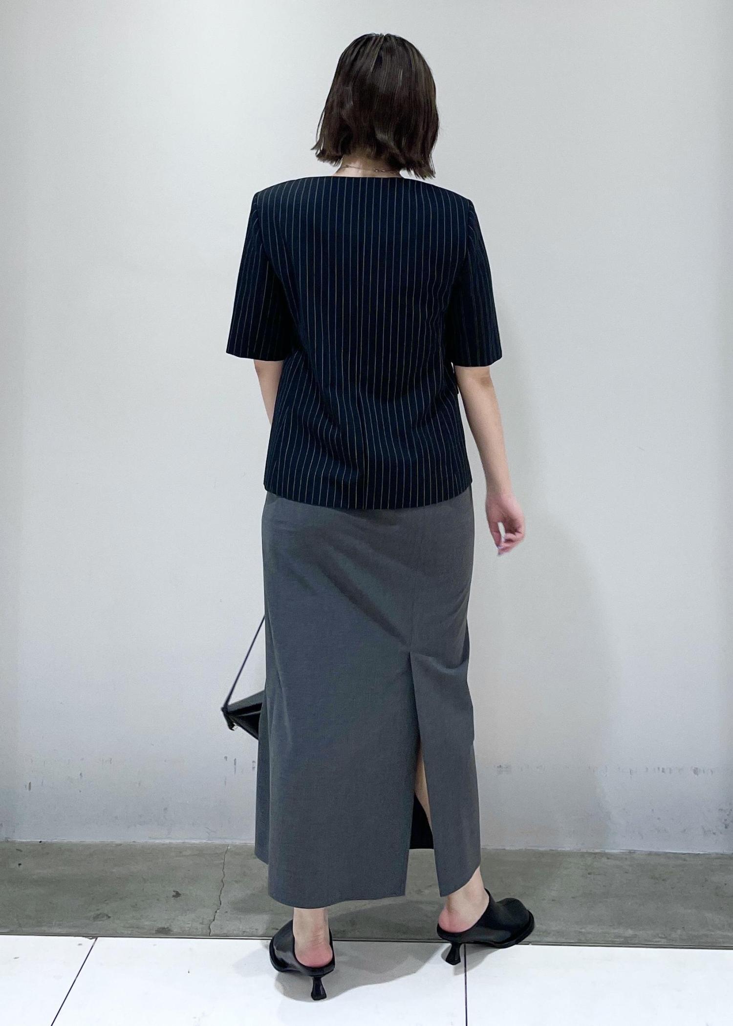 本日は”スリットネックハーフスリーブジャケット”と、新作の”マルチWAYレイヤードシャツスカート”を使って、きっちり感のあるフェミニンコーデを組んでみました♡