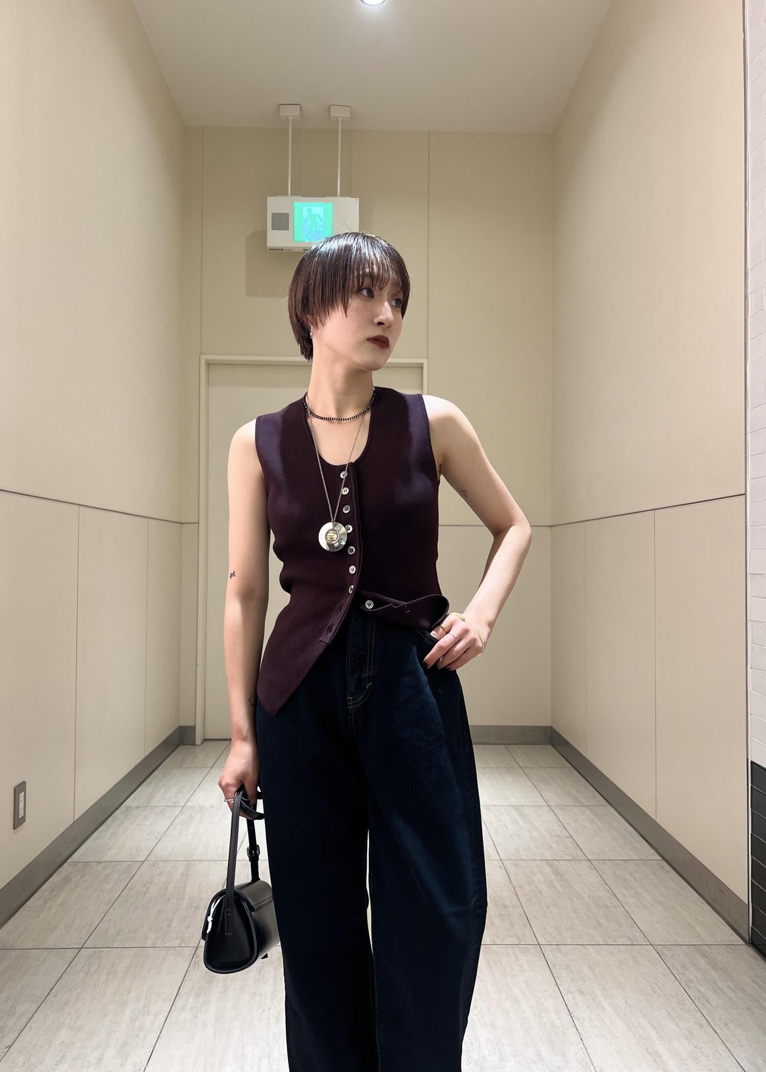 今の時期から、シアートップスなどをレイヤードすると先まで着れるベストをメインにカジュアルにコーデを組みました!
