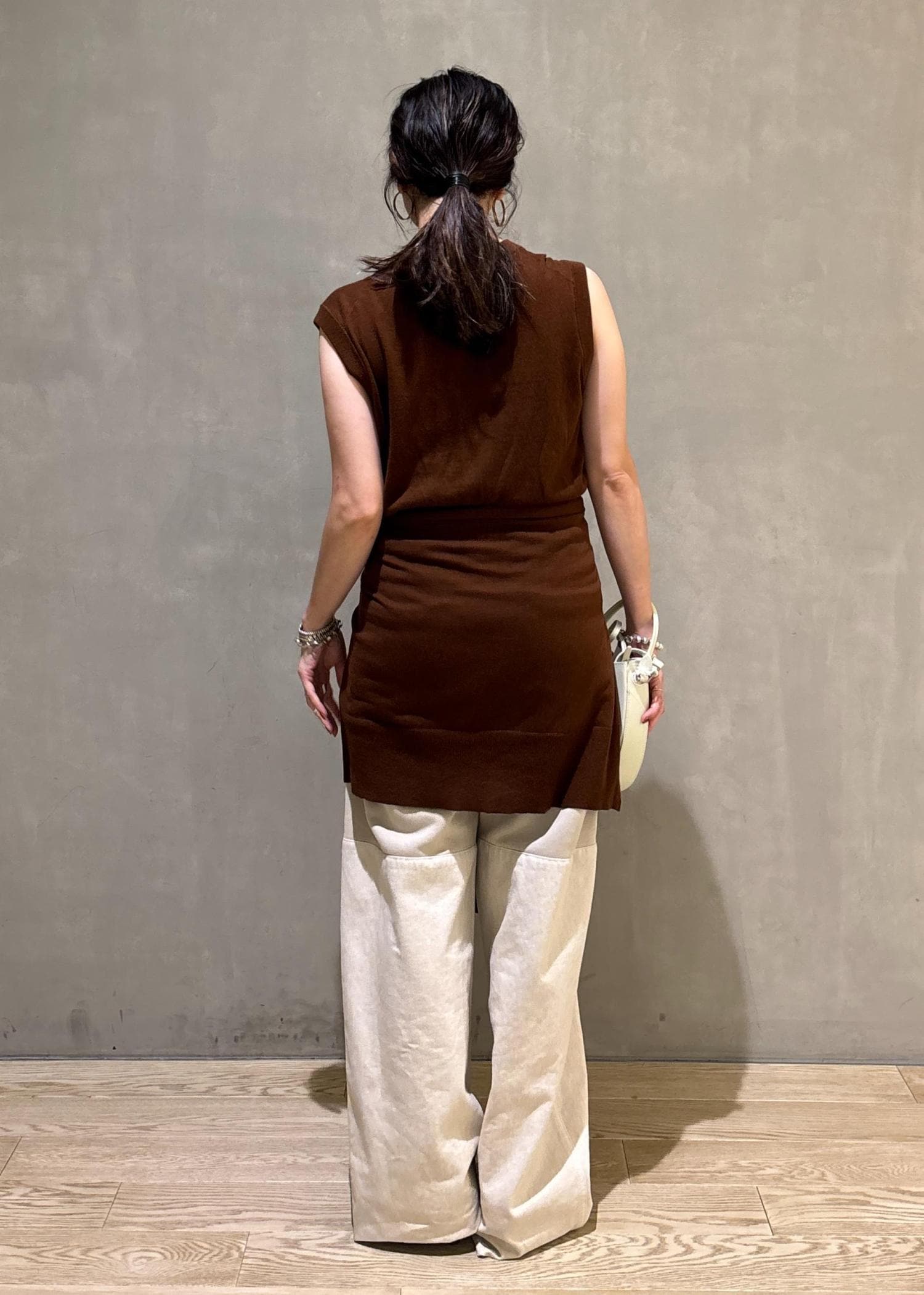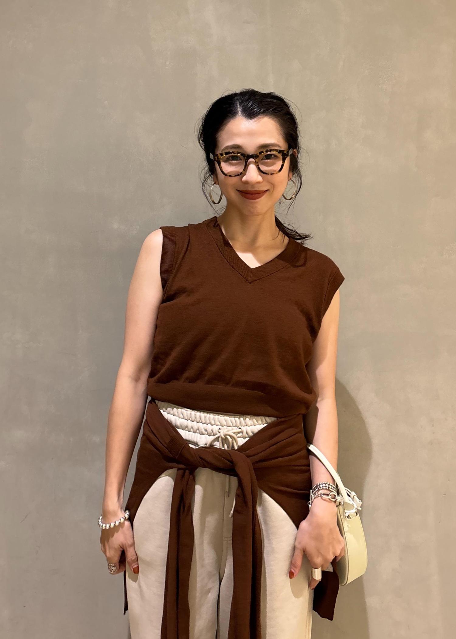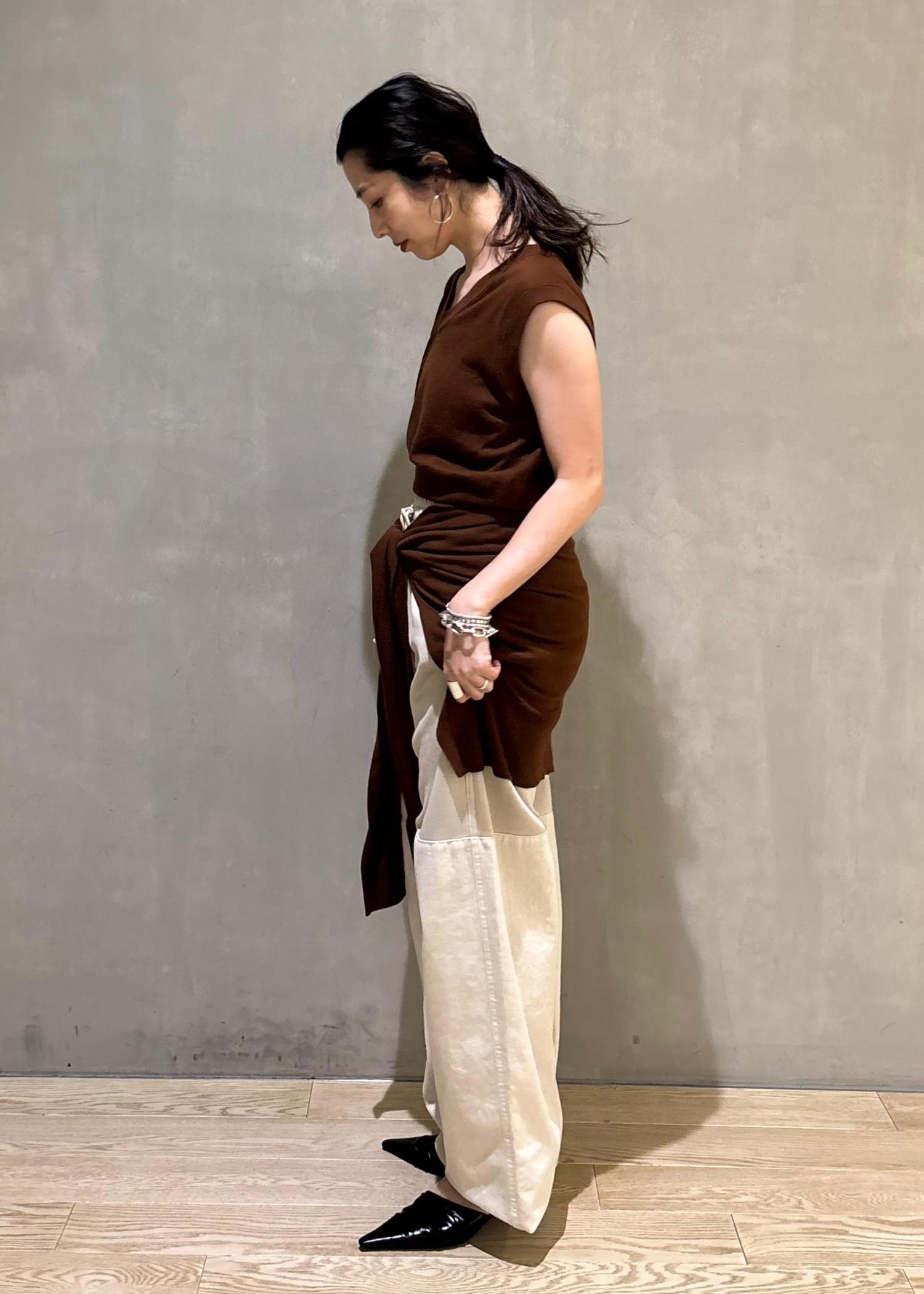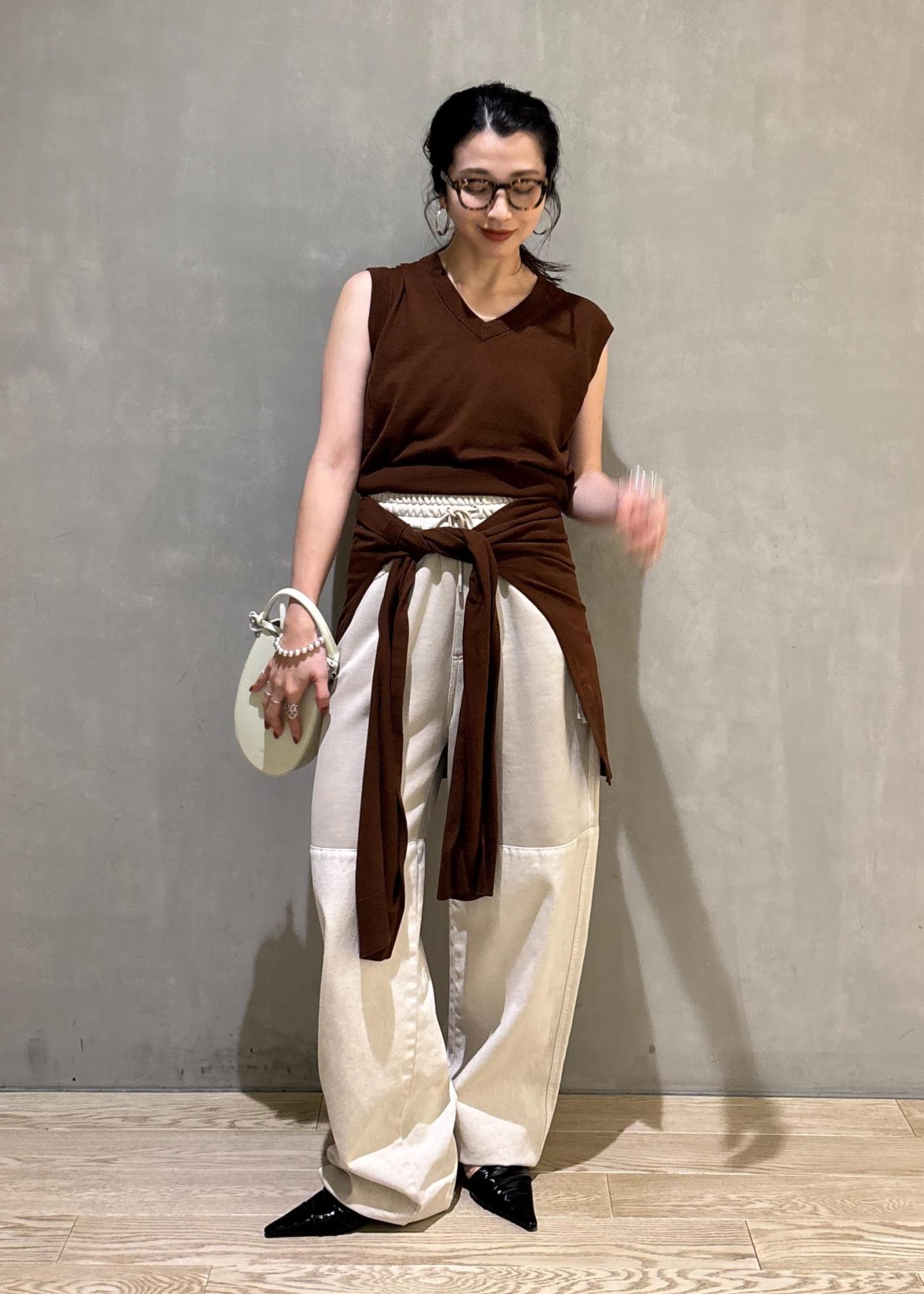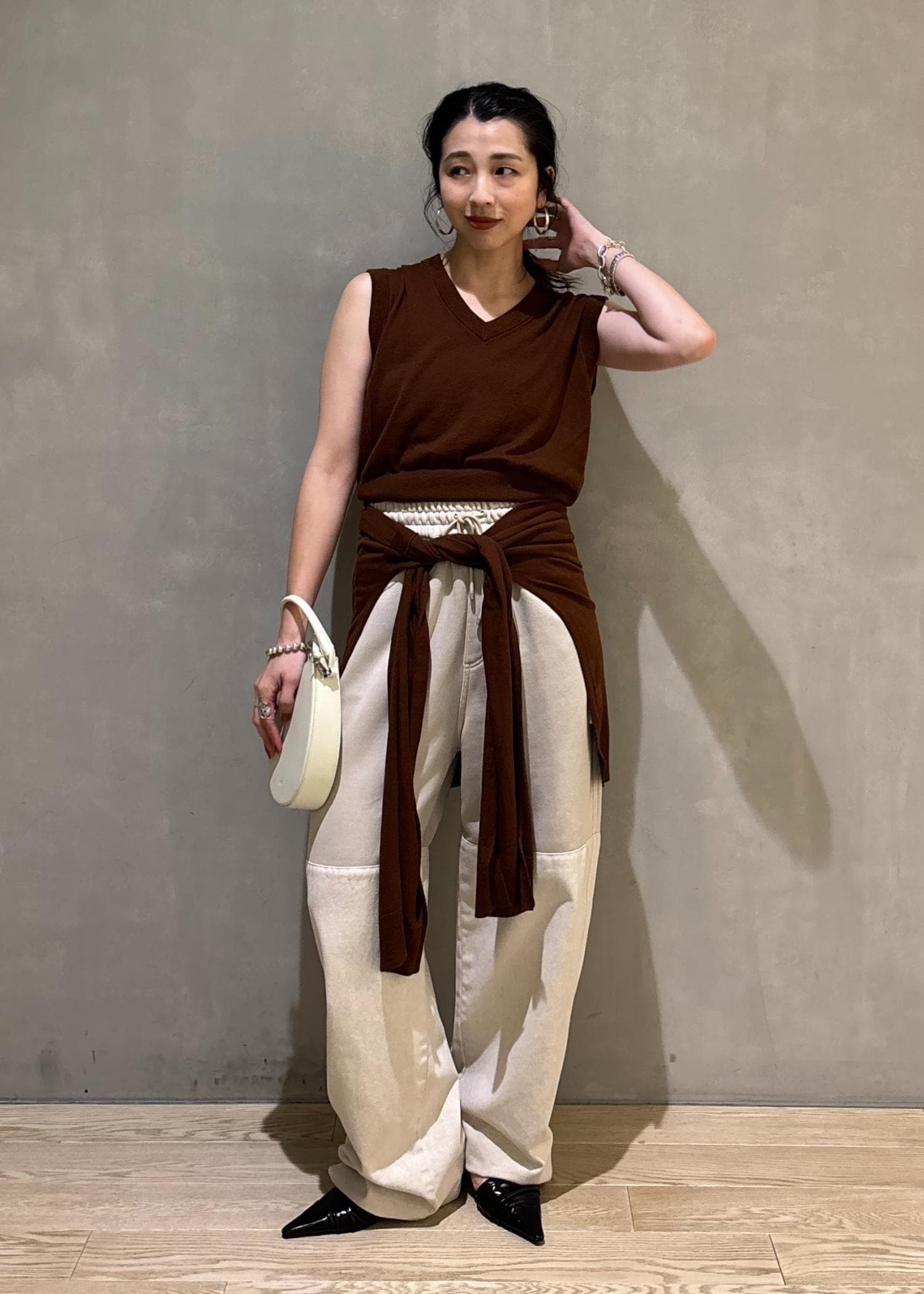 今回は少しキレイ目なストール付きのニットを合わせて大人カジュアルにスタイリング。カラーはベージュ〜ブラウンで合わせ上品にまとめてみました!