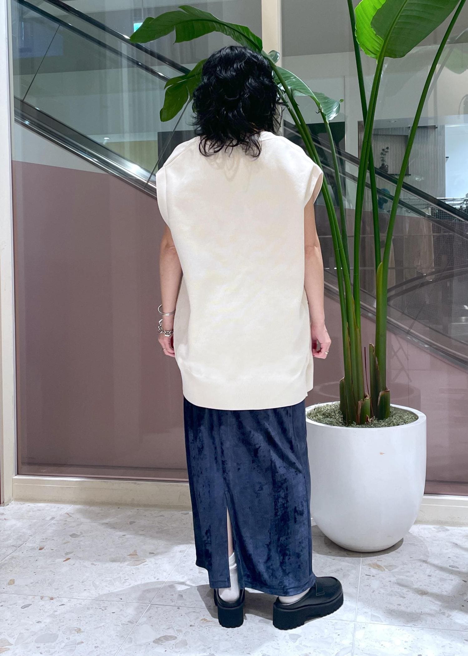 お尻が隠れるほどたっぷりとしたシルエットなので、インナーはミラーの別注タンクとスカートですっきりと。