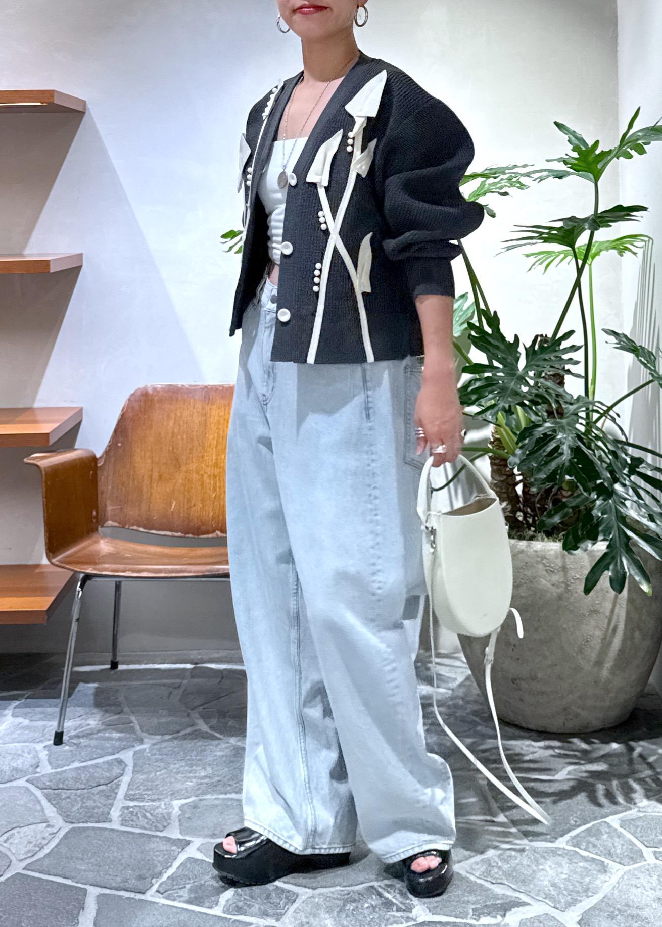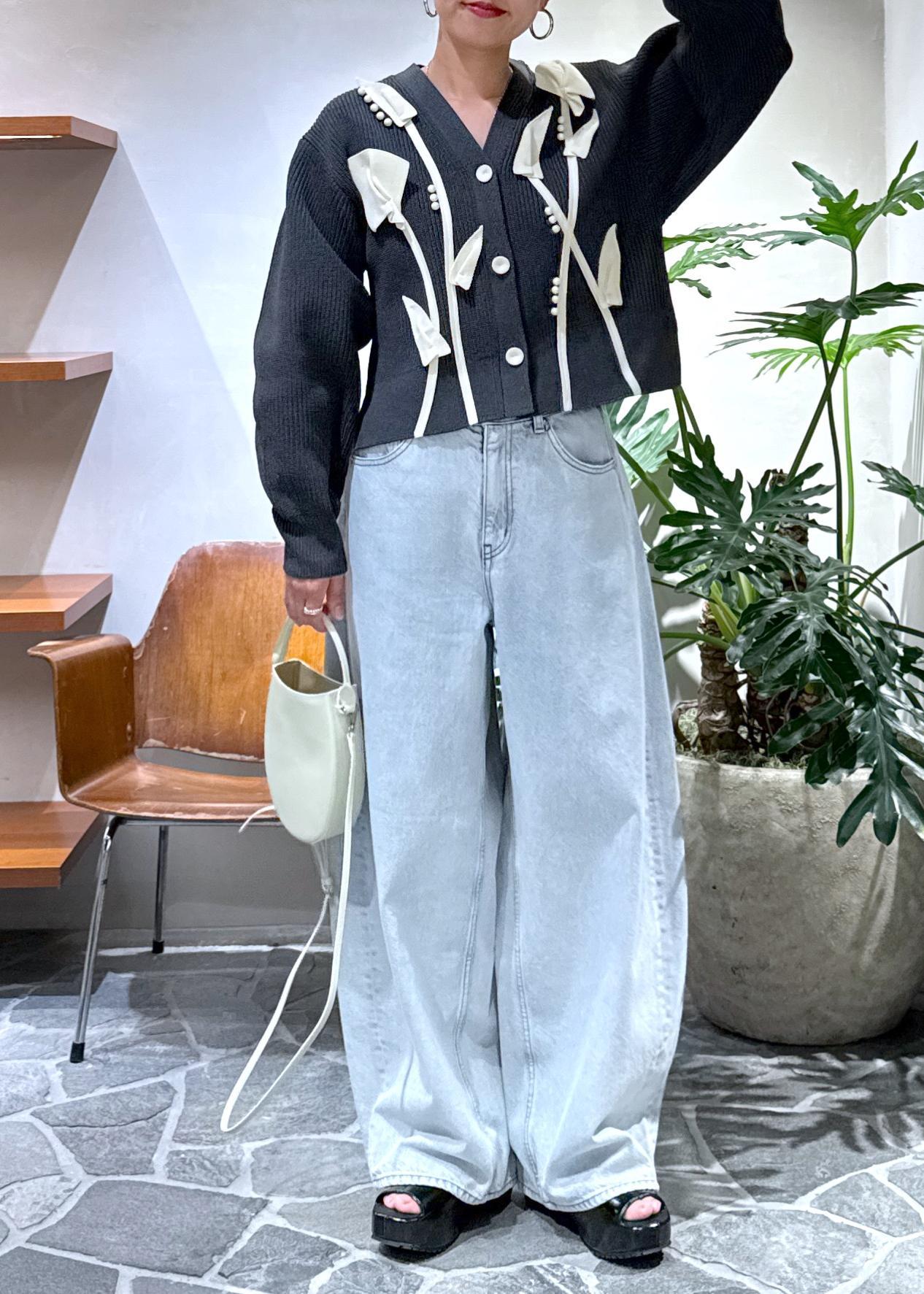 カーディガンのモチーフがかわいくとても映える1枚なので、シンプルにデニムと合わせています。