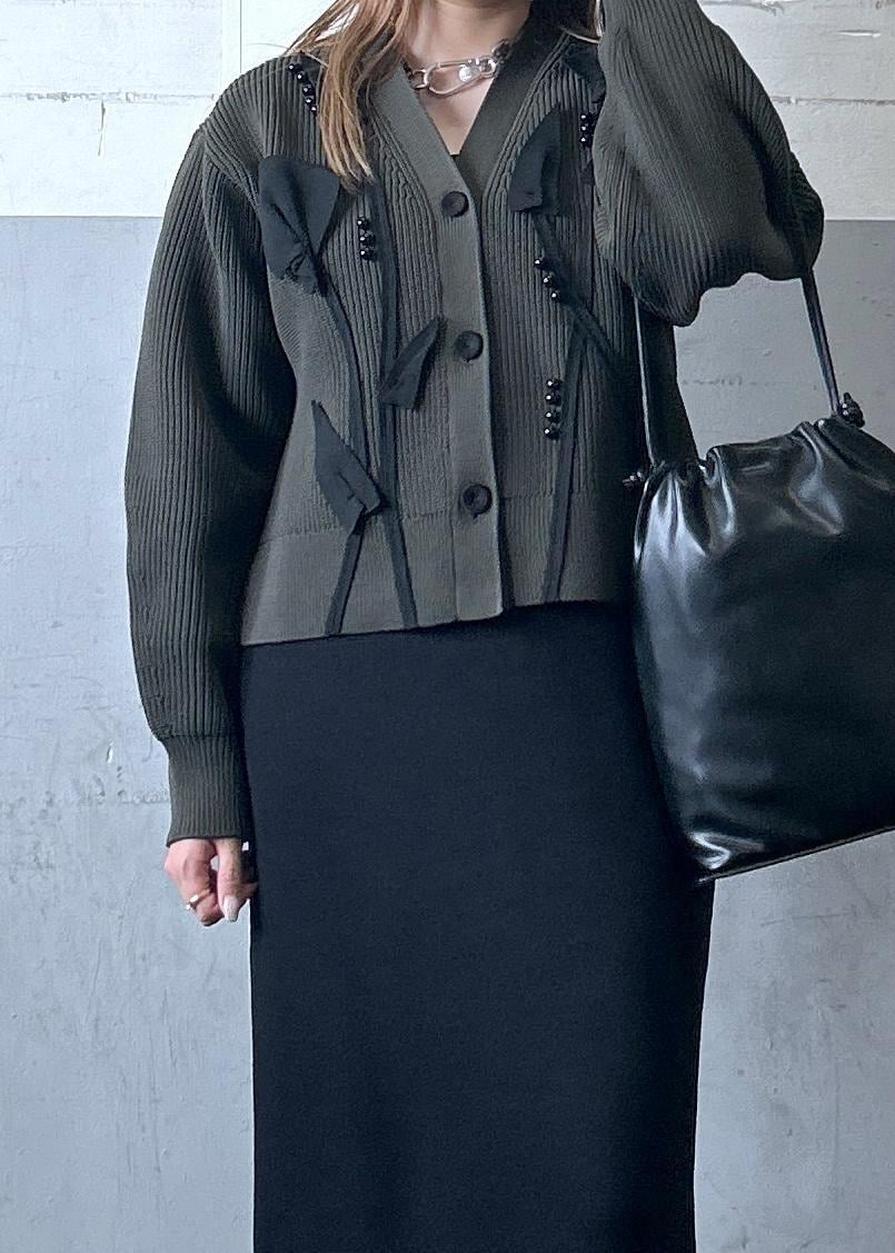 ADAM ET ROPÉ FEMME【サステナブル】3Dモチーフカーディガンカーキ / F¥9,900レビュートップスとして一枚でも、ワンピースなどの羽織としても使えるアイテムです。チクチクしない素材です◎