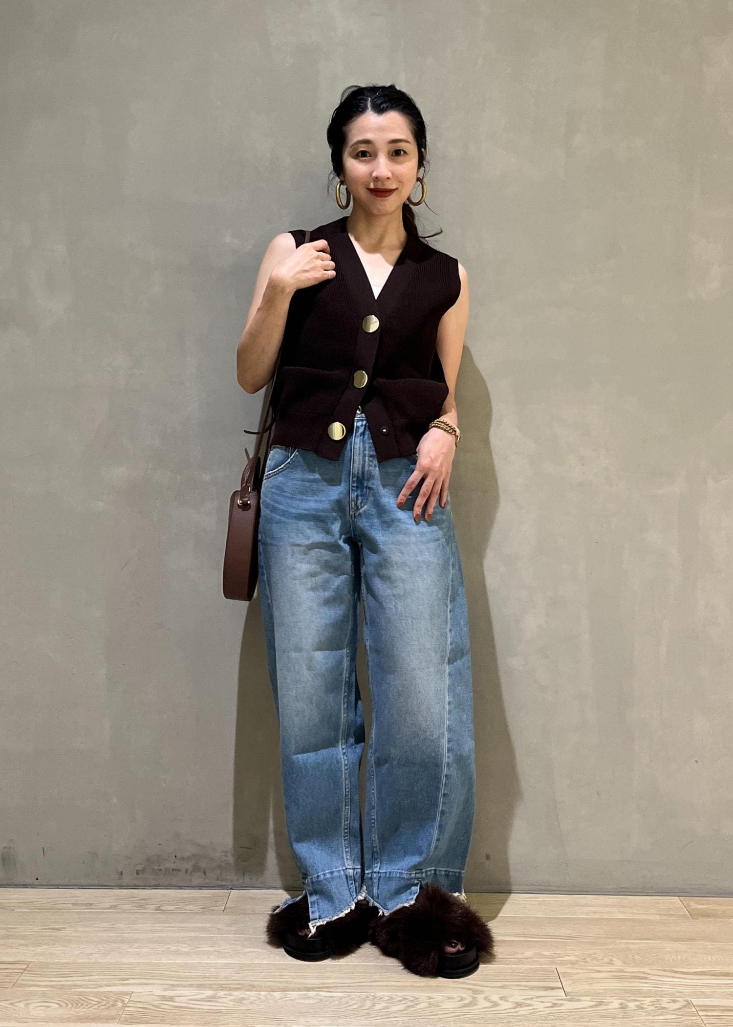 こっくりと深みのあるブラウンを取り入れるだけで一気に秋の装いに。ファーサンダルが一気に季節感を先取りしてくれますが、スリーブはノースリーブなので、ちょうど夏の要素も残されるのでおすすめですよ!