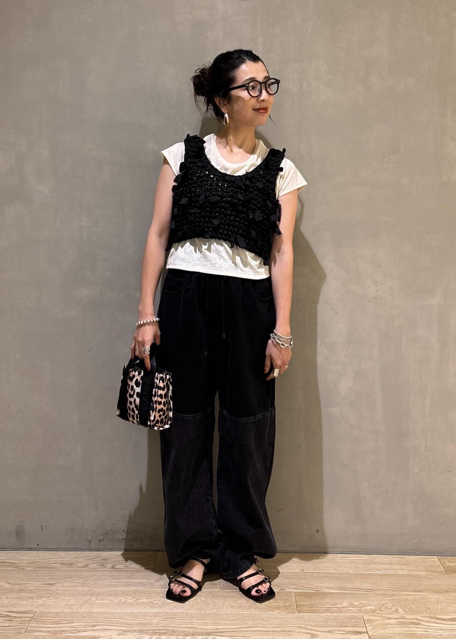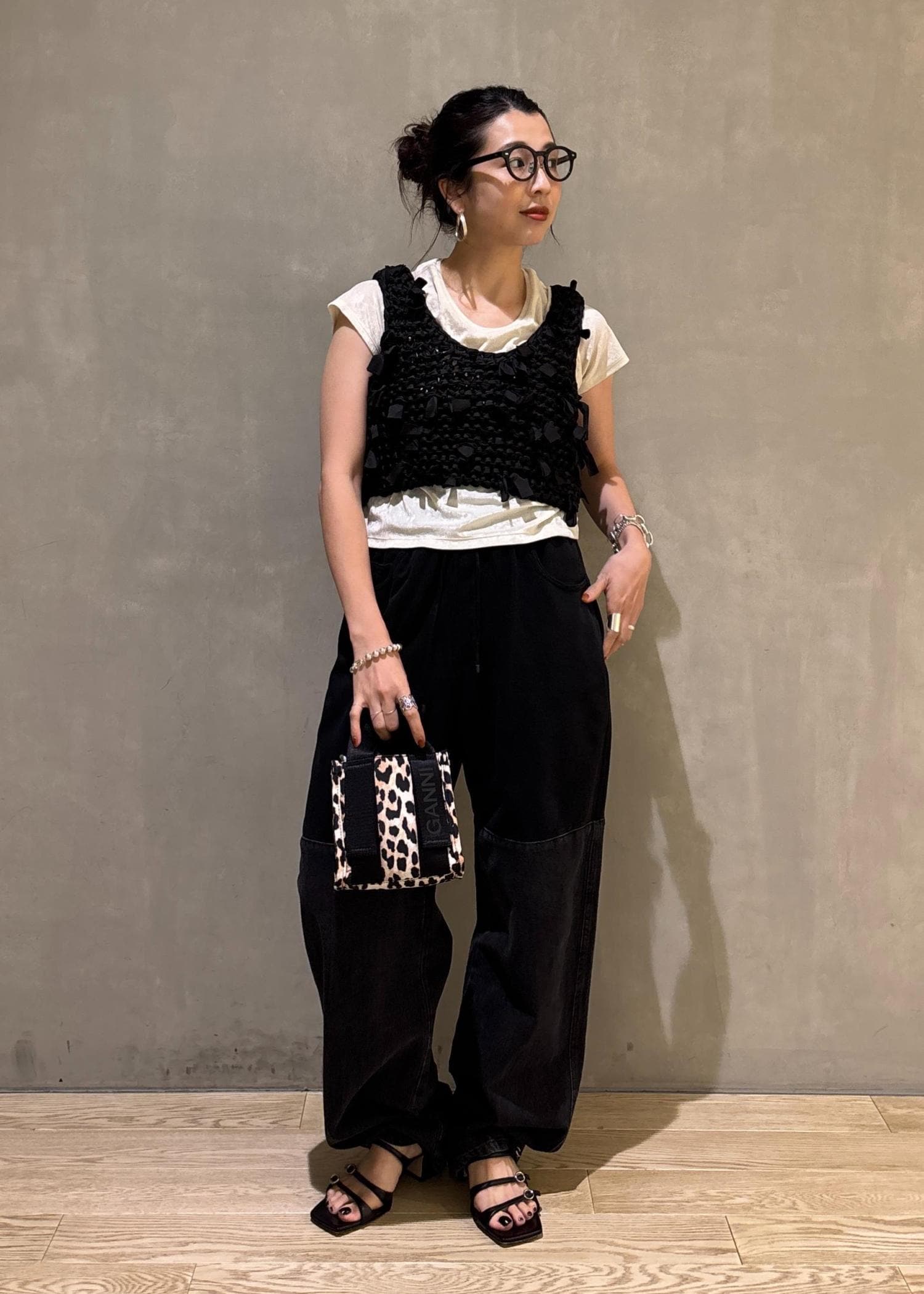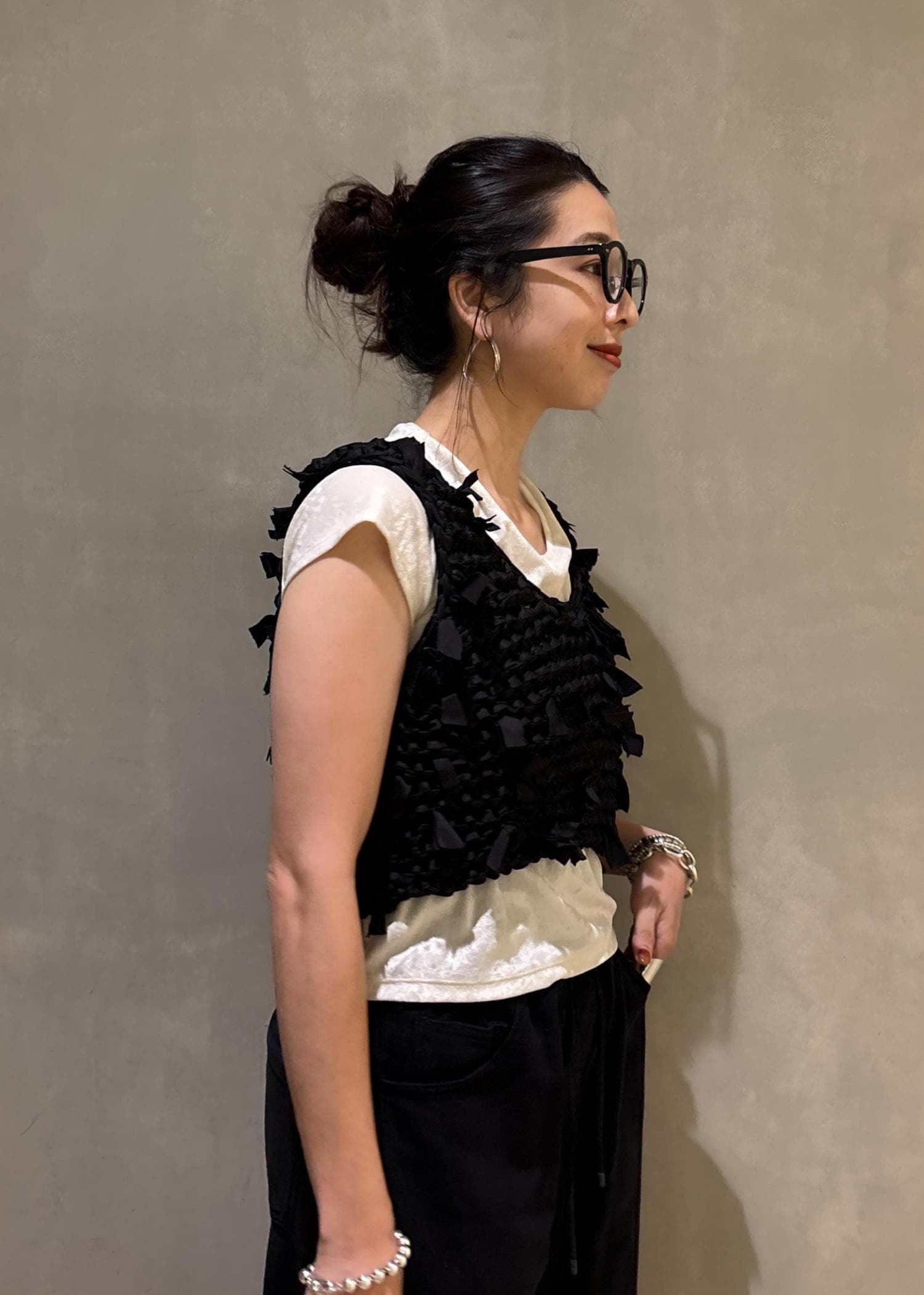 ADAM ET ROPÉ FEMMEテープヤーンベストブラック / F¥26,400レビューコンパクトなサイズ感のベストです。暑い時期は1枚で、肌寒くなったらインナーで調整してレイヤードスタイルを楽しんでいただけます!