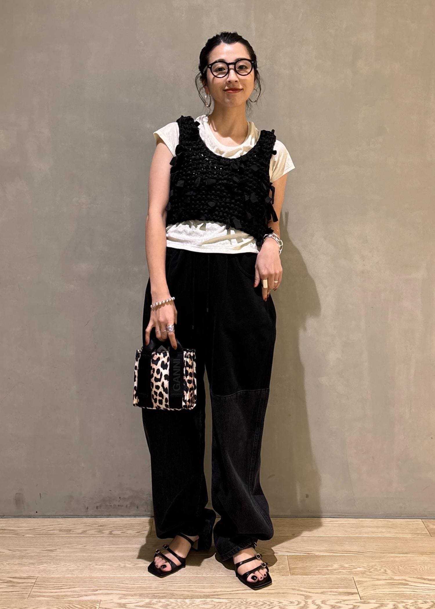 まだ暑いけど、秋物も気になるという方におすすめしたいこちらのモノトーンスタイリング。クラッシュベロアの素材感とレオパードで秋先取り!!ですが、足元はサンダルで少し抜け感を。8月の秋先取りジャストなスタイリングです。クラッシュベロアも素材は秋ですが、半袖で通気性もあるので涼しくきていただけますよ!