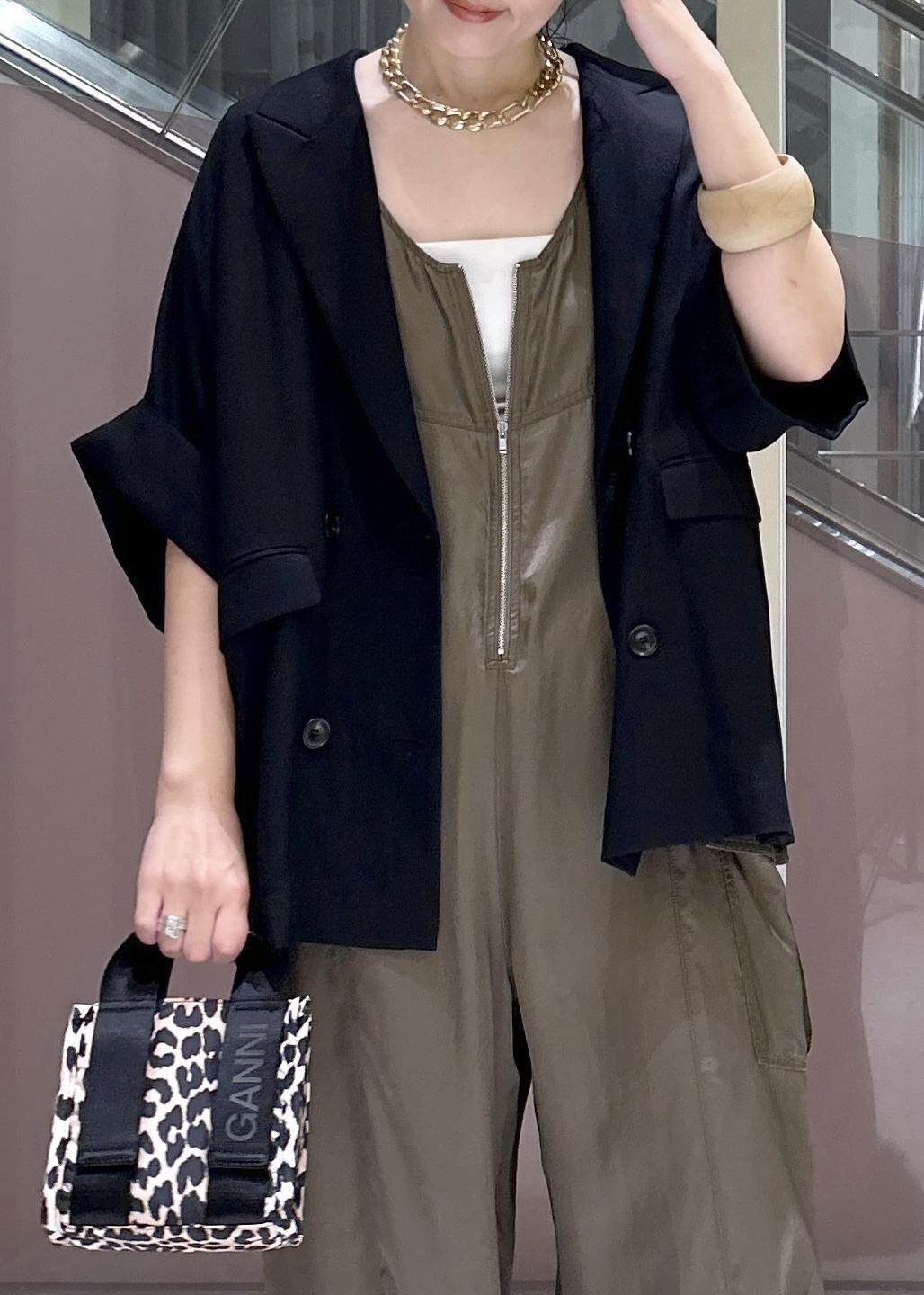 ノースリーブで着ても可愛いですか、ここはジャケットを羽織って大人感を強調。