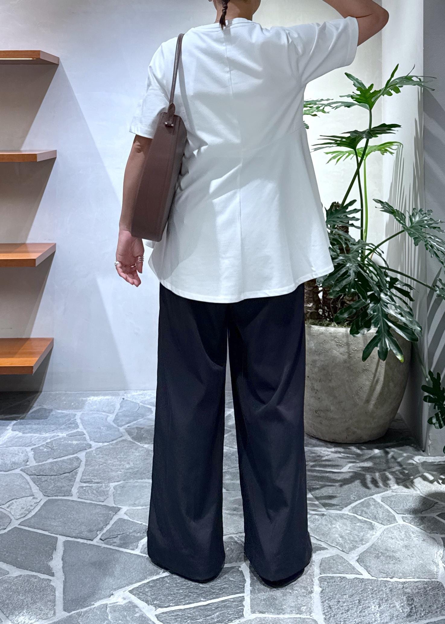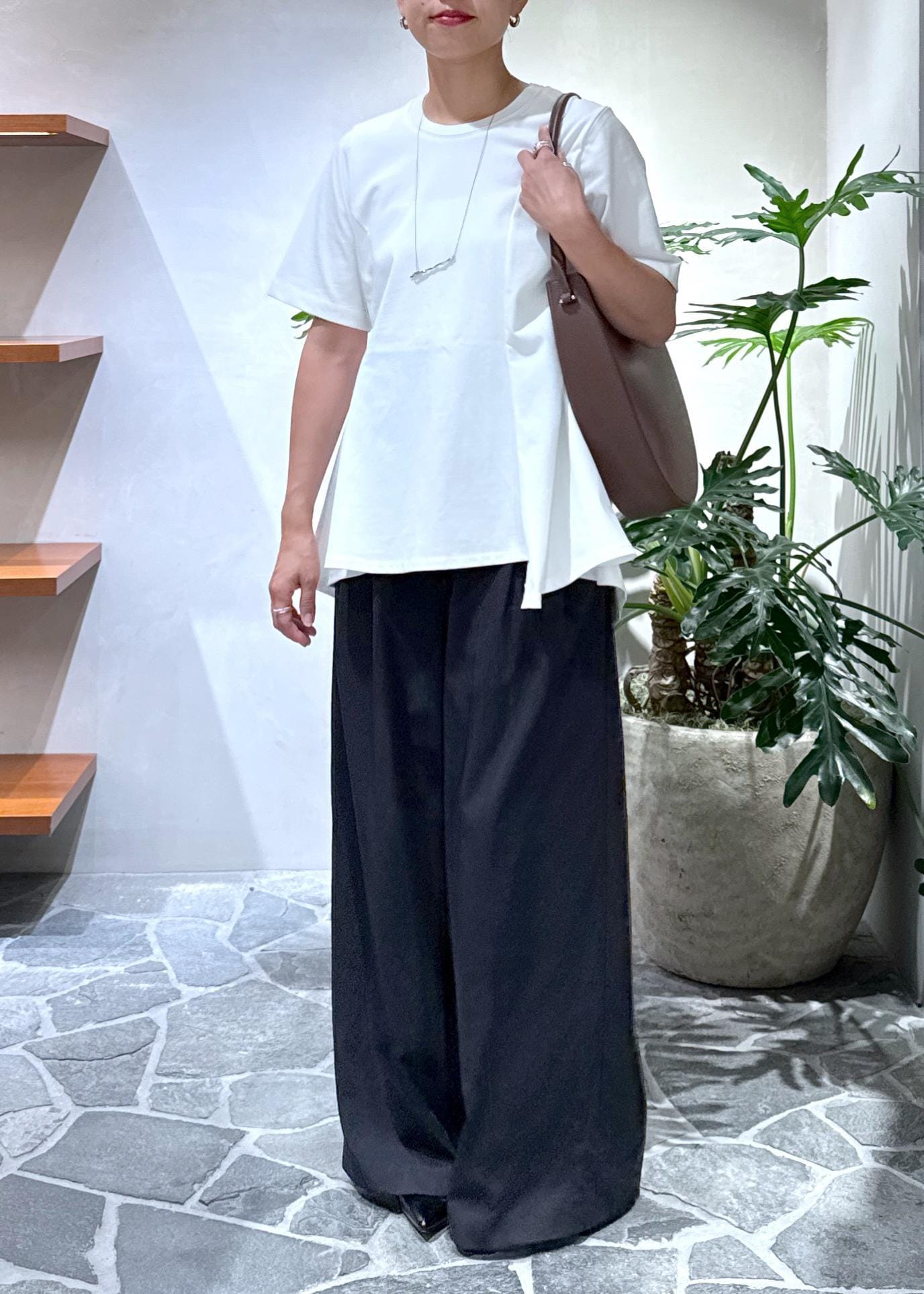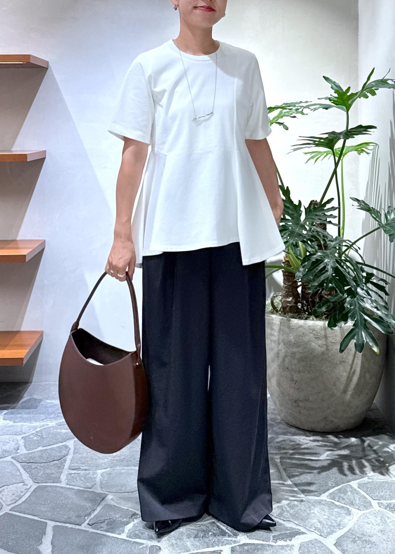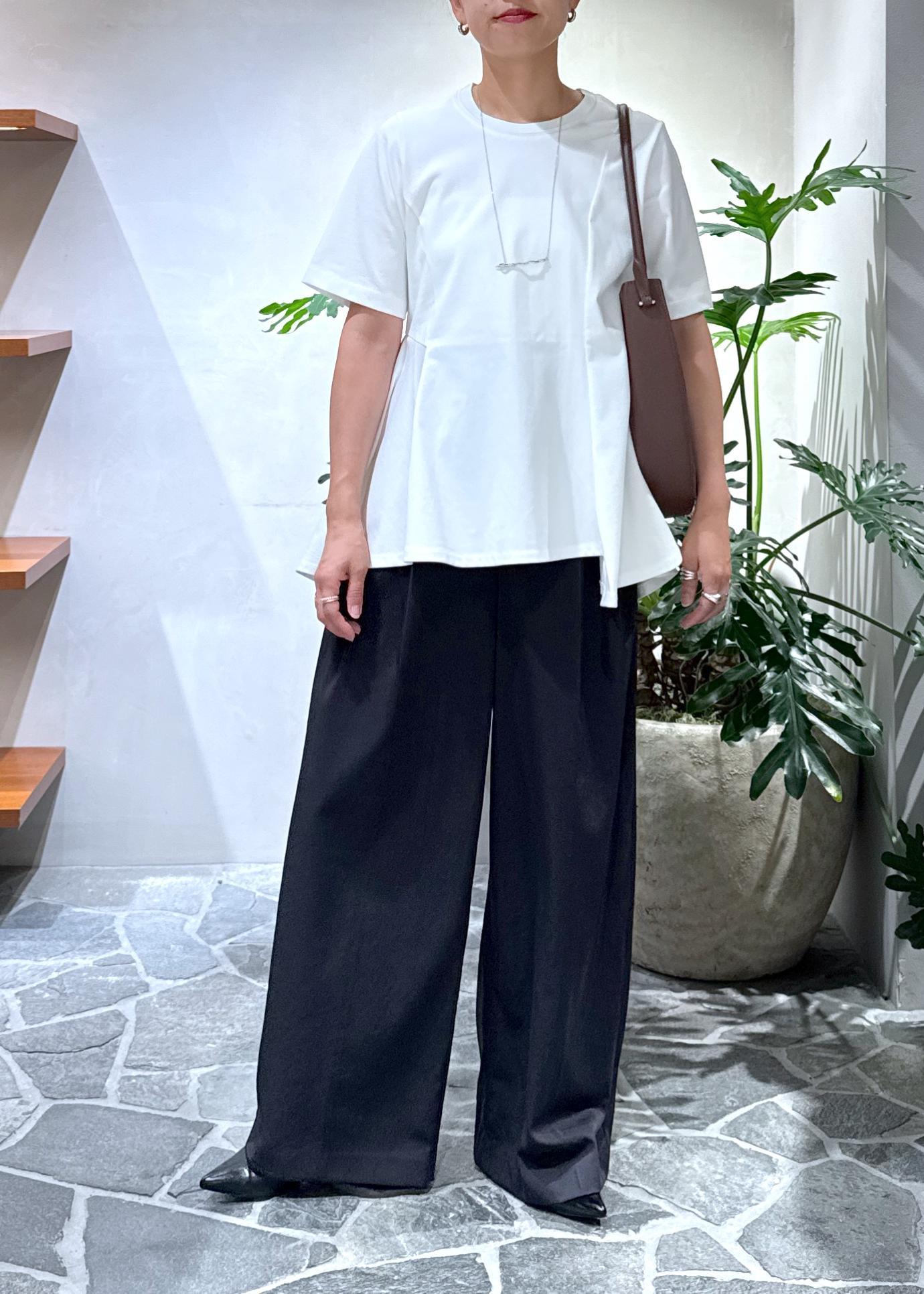 着用しているカットソーはアシンメトリーのペプラムで!1枚で着映えます。