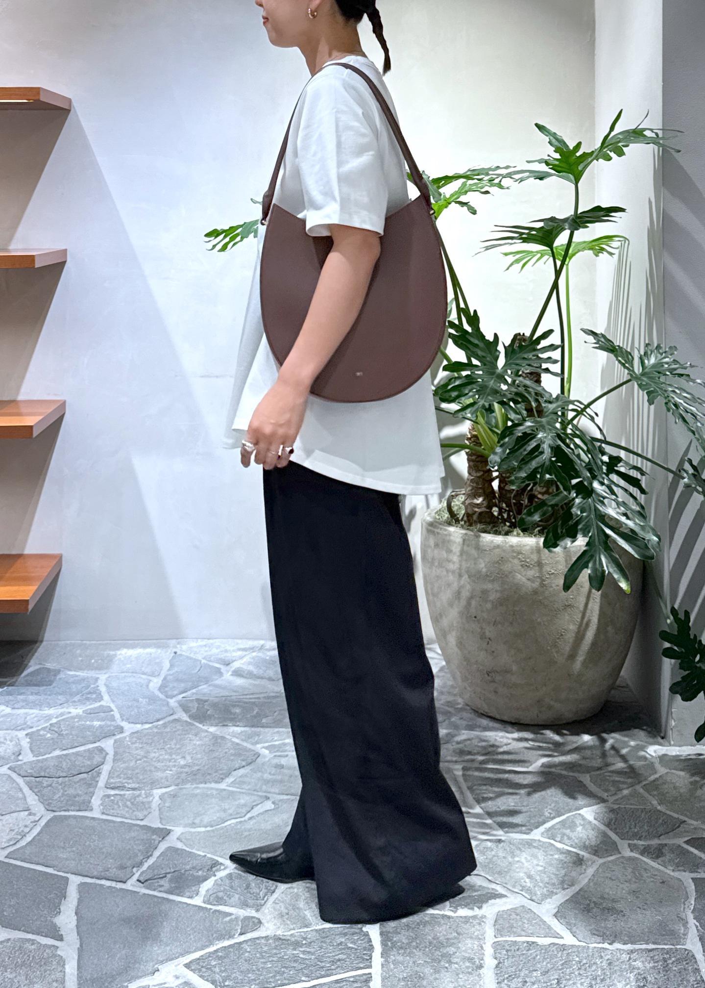 卵型の柔らかい曲線が女っぽさを出してくれるレザーバッグ。